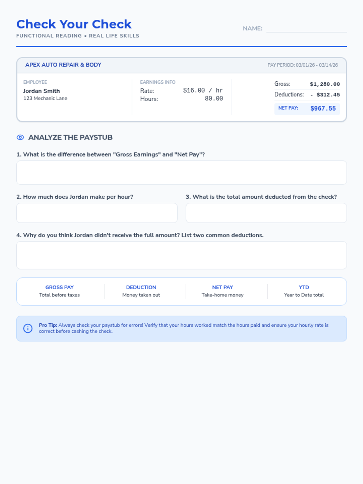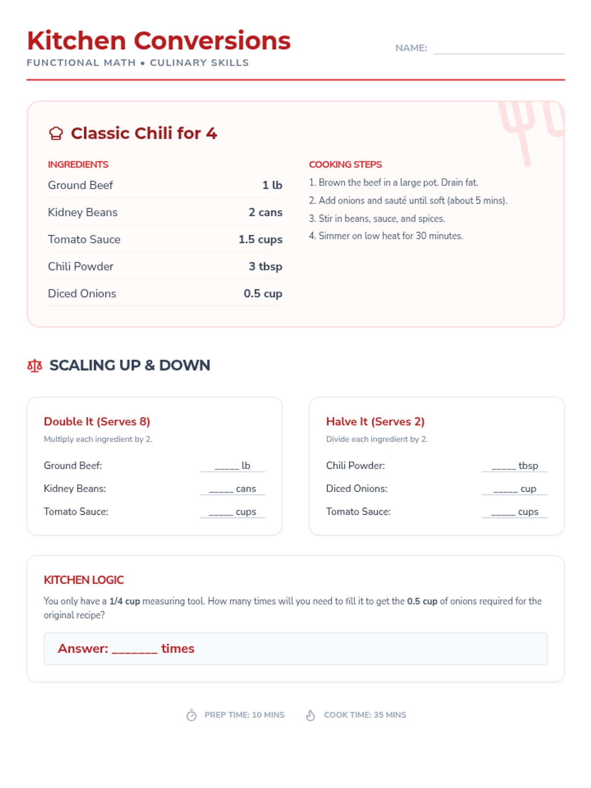 A diverse set of enrichment activities including functional reading, sports-themed math, and mindfulness art designed for adult students at a middle school functional level.