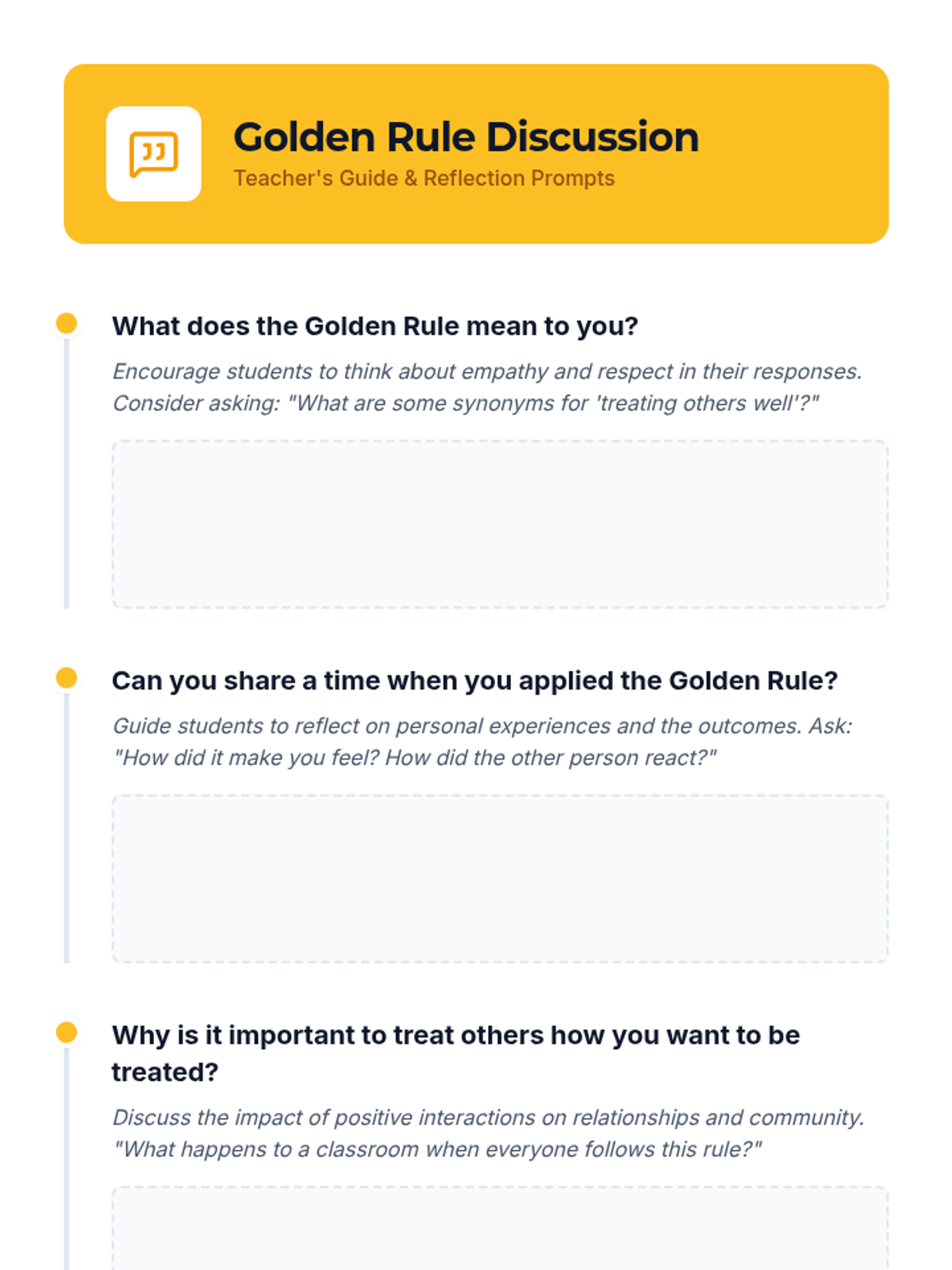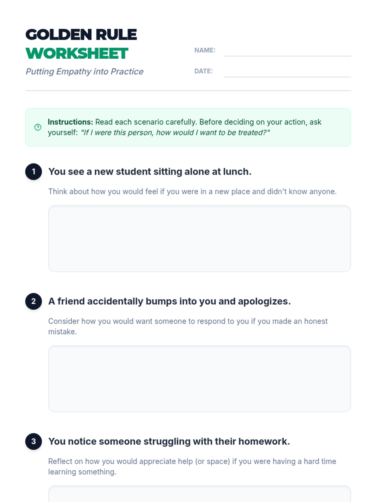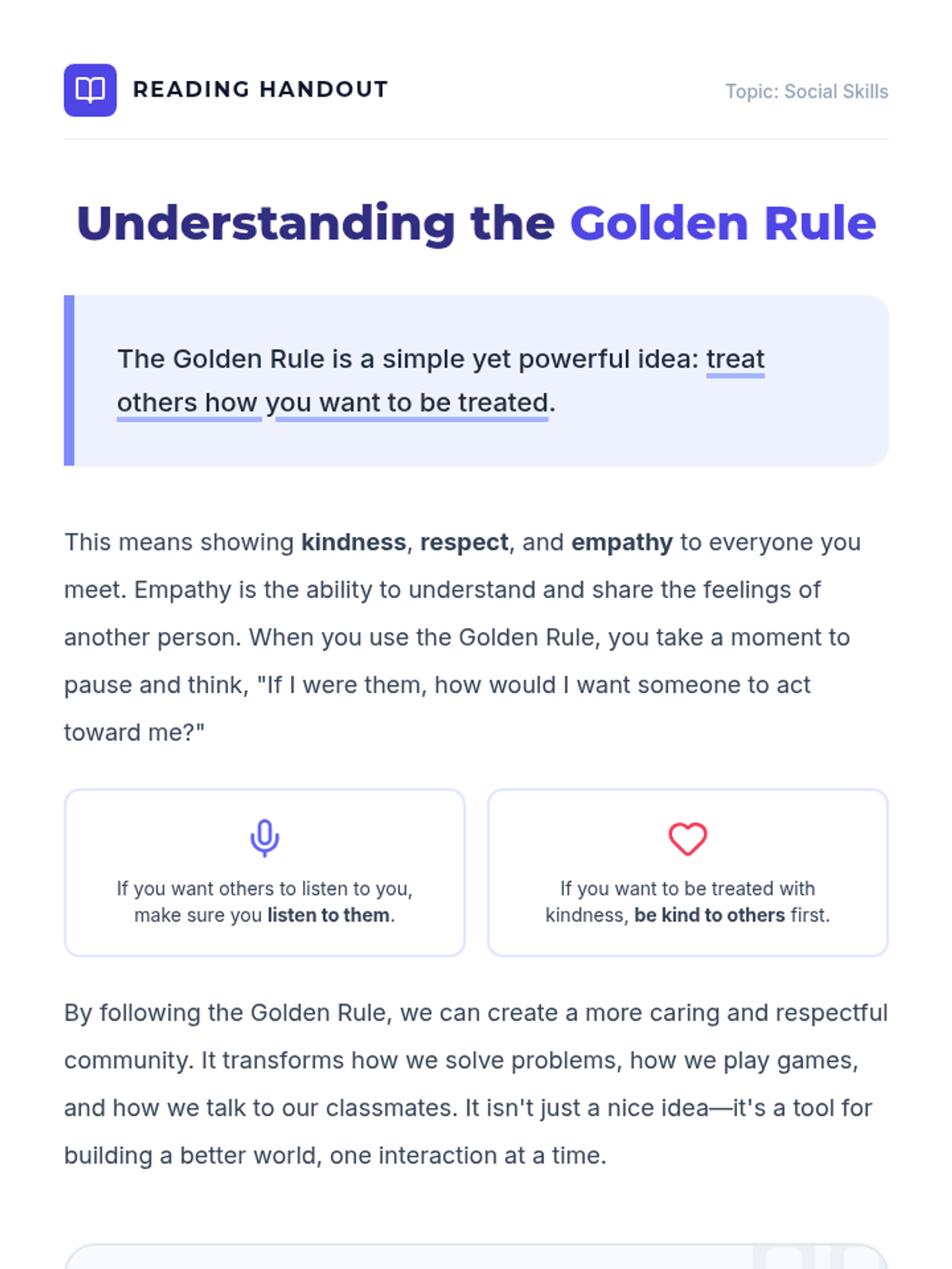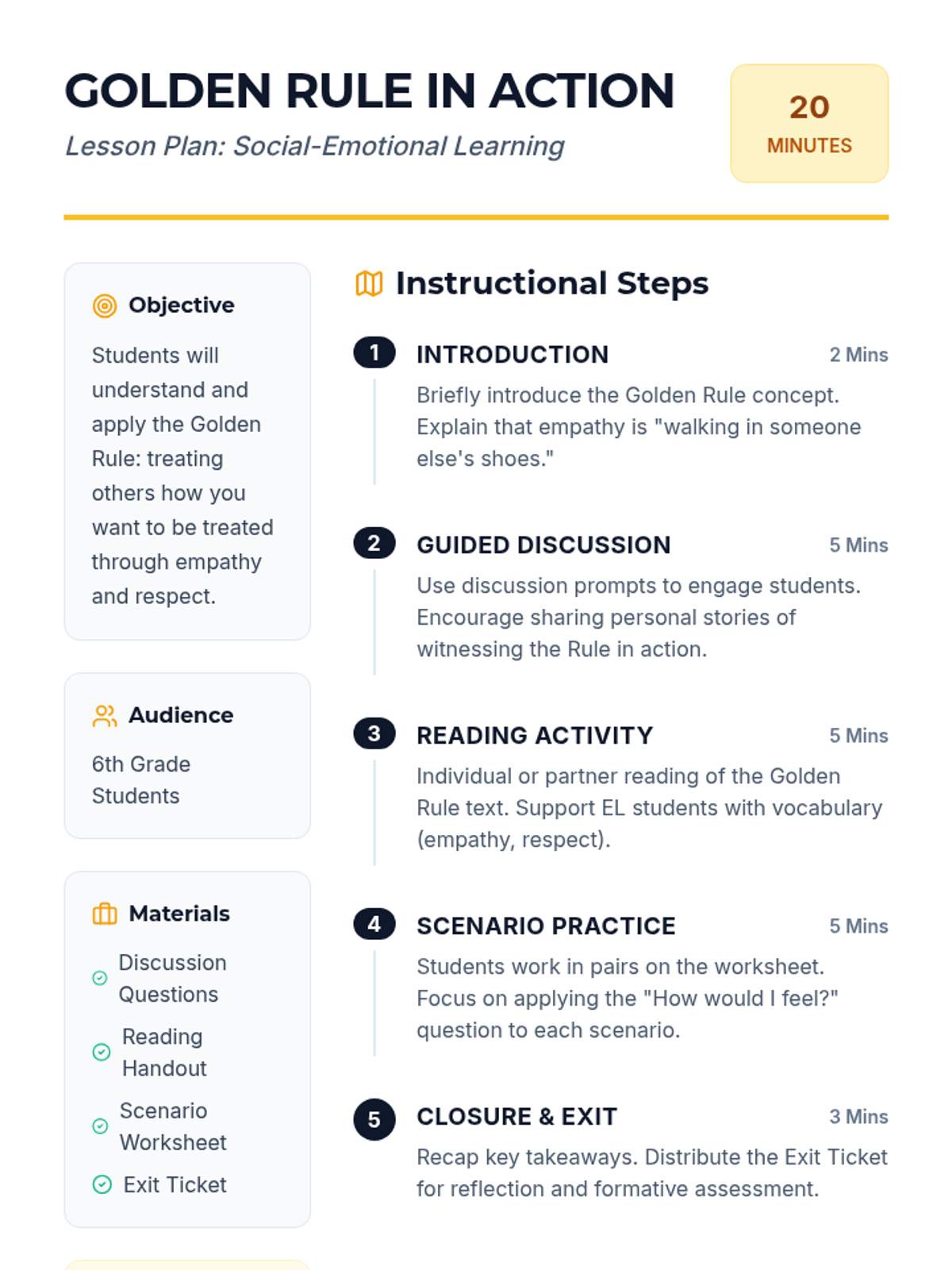 A 20-minute SEL lesson for 6th graders focused on empathy and the Golden Rule through discussion, reading, and scenario-based practice.