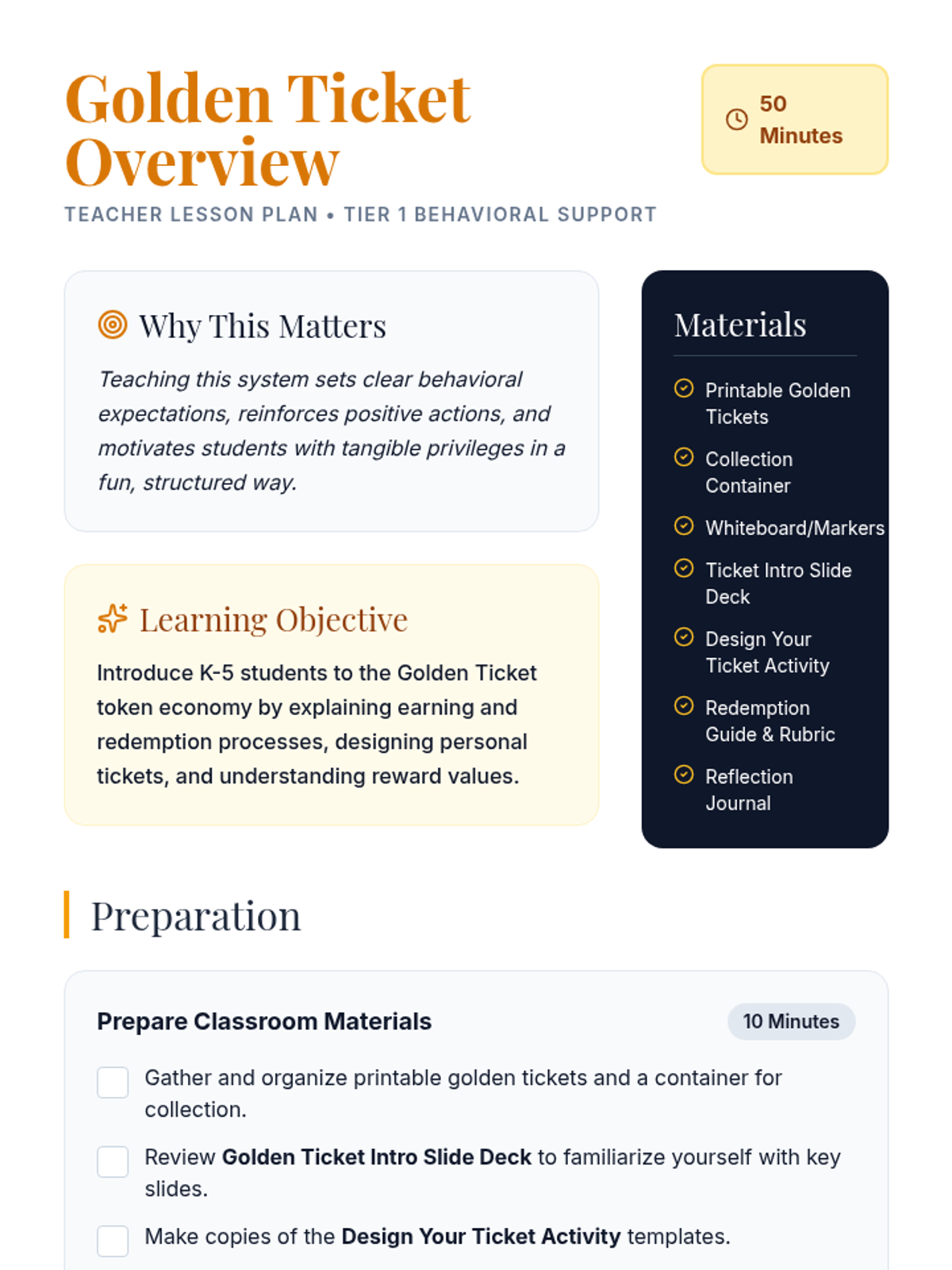 A 50-minute lesson introducing K-5 students to a classroom token economy using 'golden tickets' to reinforce positive behavior and school-wide expectations.