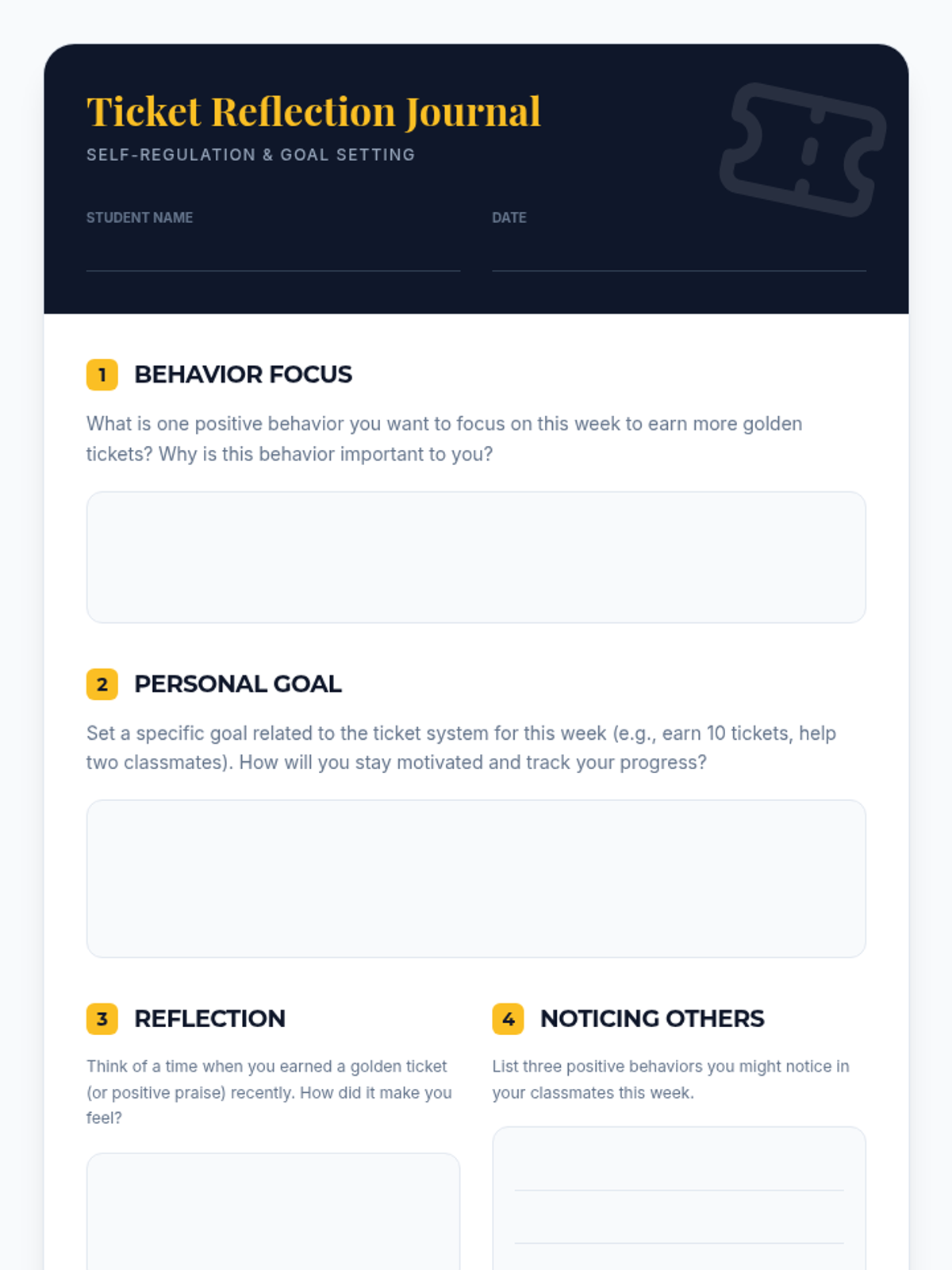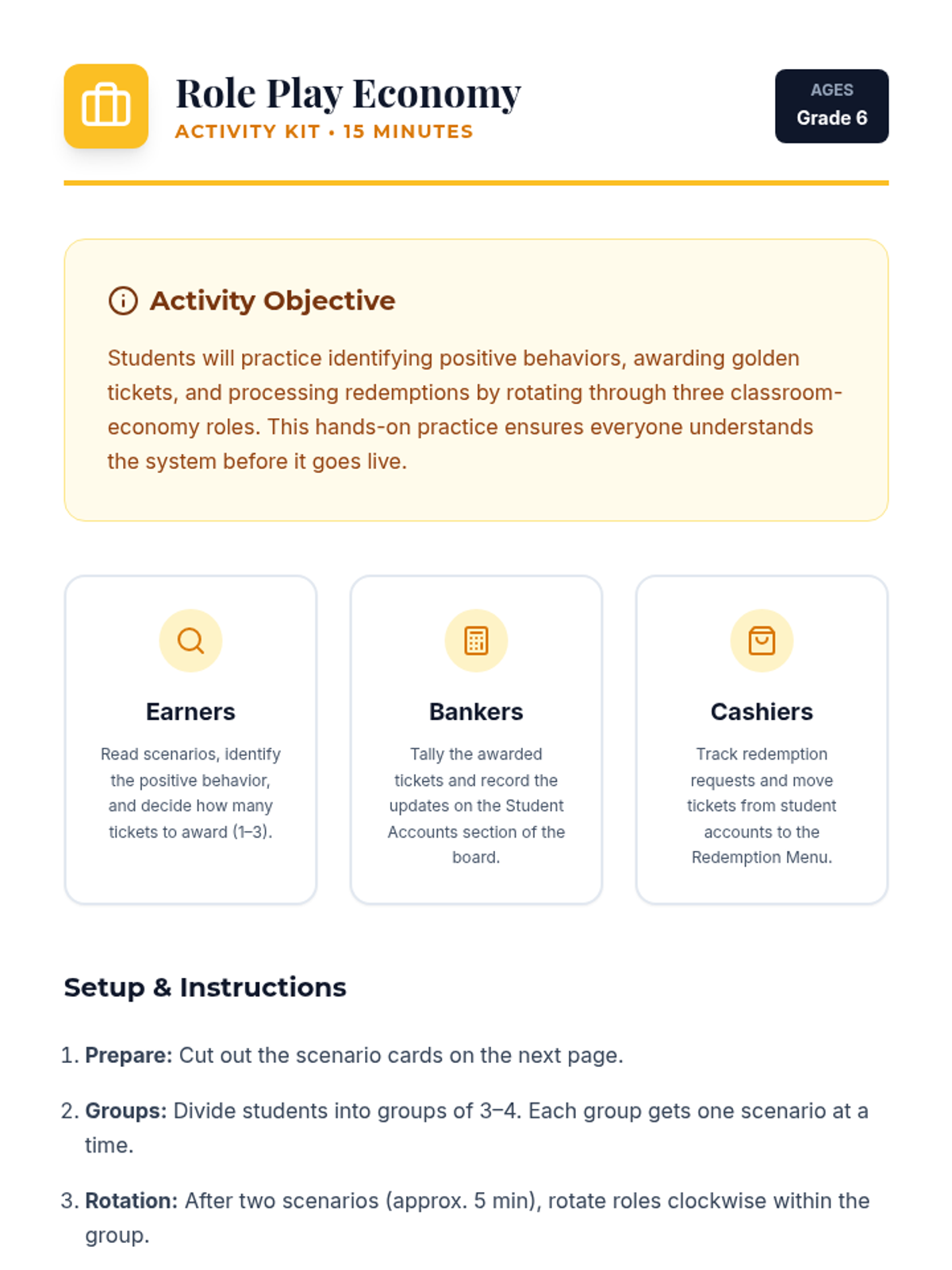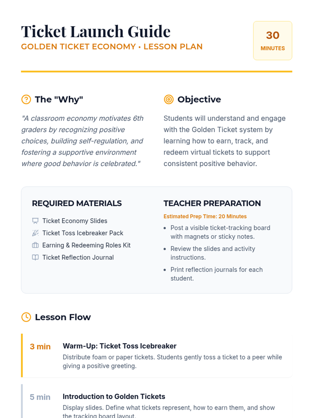 A Tier 1 classroom lesson for 6th graders to introduce the Golden Ticket economy, a positive reinforcement system designed to build self-regulation and celebrate positive behavior. Students learn how to earn, track, and redeem virtual tickets through hands-on simulations and reflection.