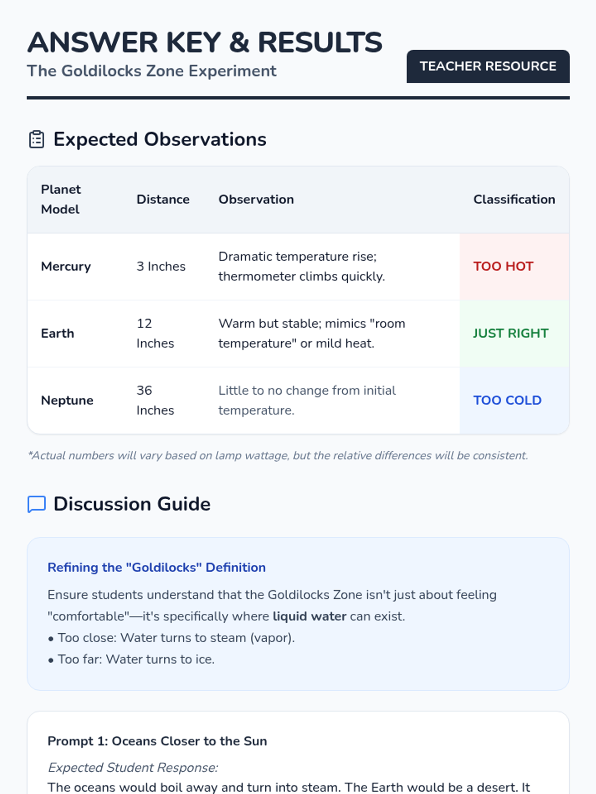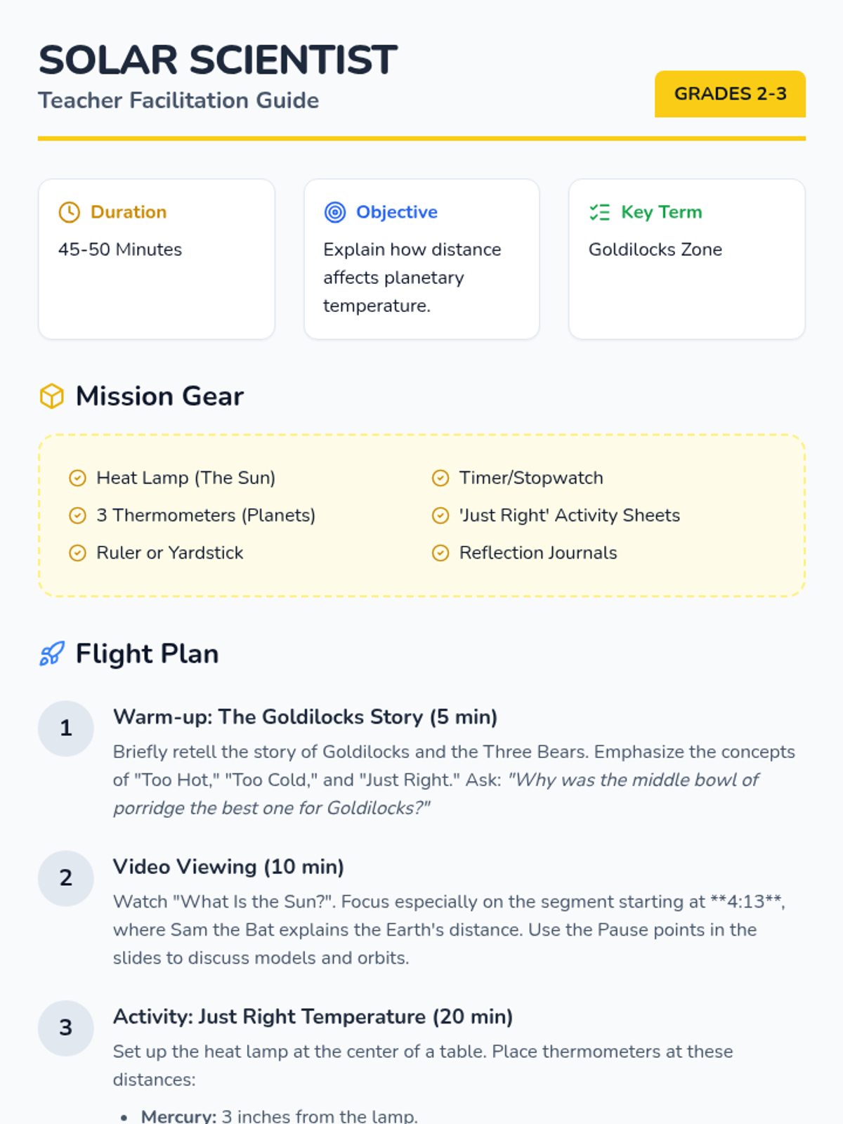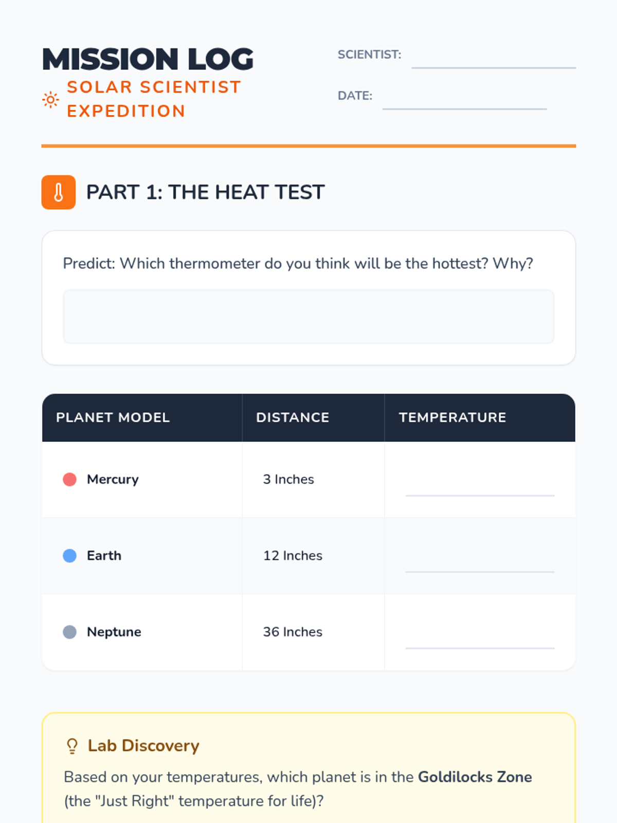 Students explore the 'Goldilocks Zone' through a hands-on experiment with heat and distance, inspired by the SciShow Kids 'What Is the Sun?' video. They will investigate how a planet's distance from its star determines its temperature and suitability for life.