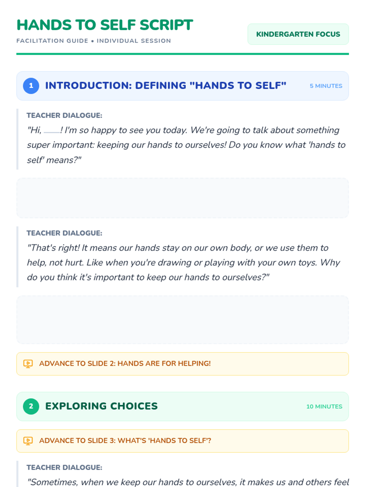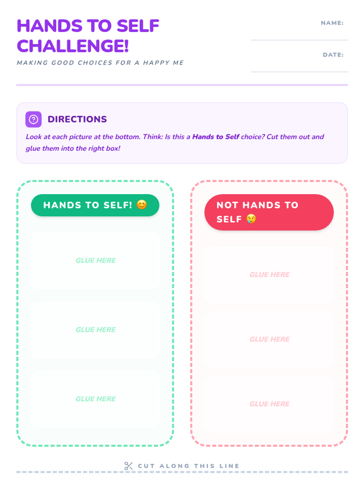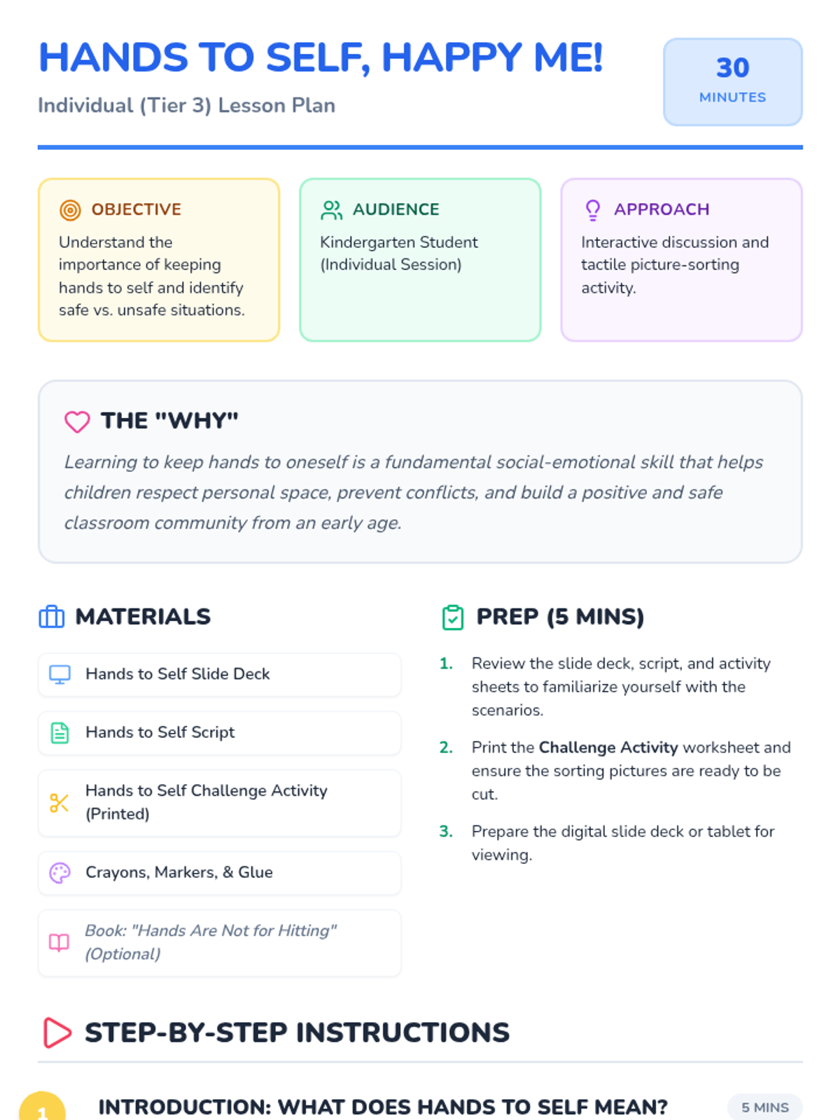 A 30-minute individual Tier 3 lesson for Kindergarten students focusing on the concept of 'hands to self' through discussion, visual scenarios, and a sorting activity.