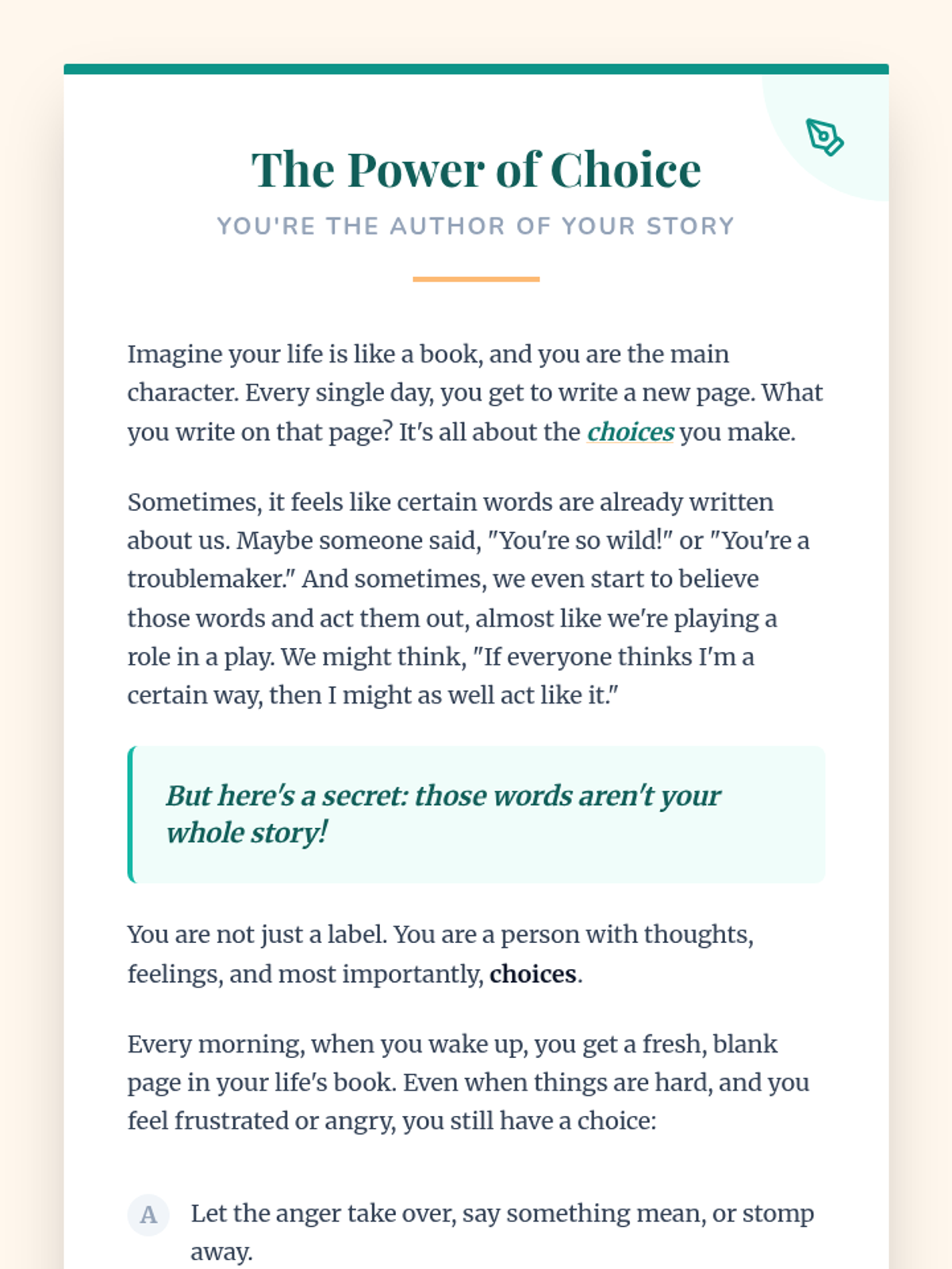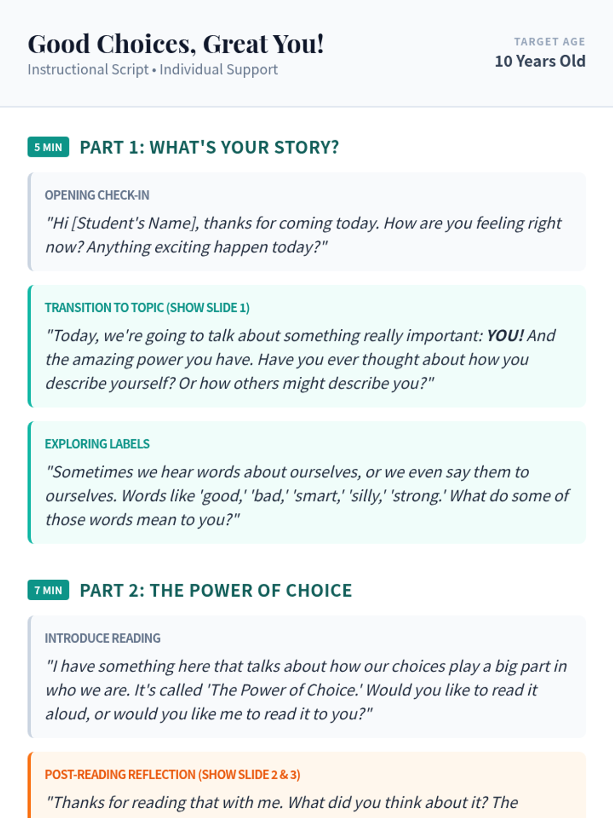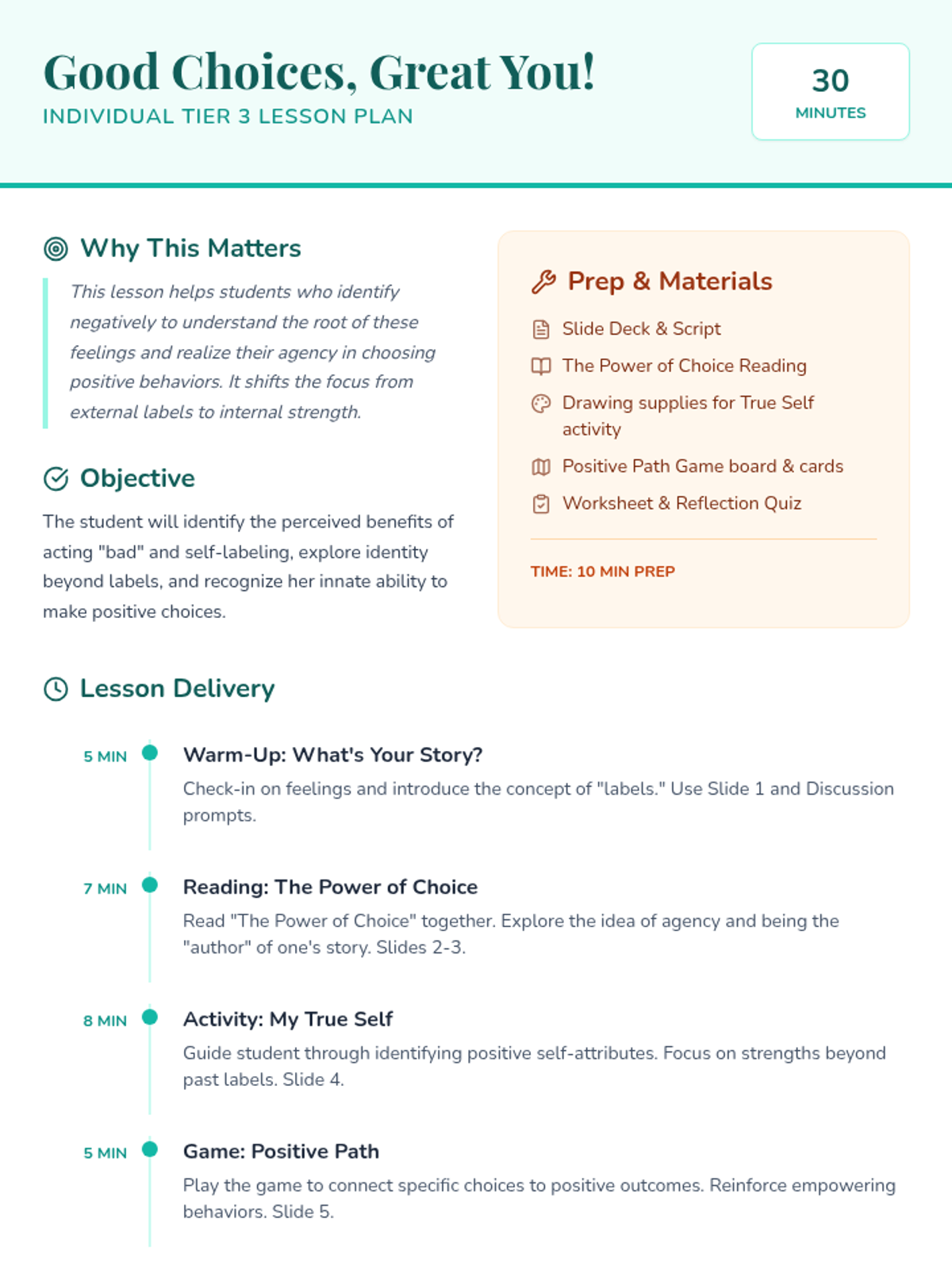 A 30-minute individual Tier 3 lesson for a 10-year-old girl to explore self-identity and the power of choice. This lesson helps students move past negative labels and recognize their agency in shaping their own story through positive actions.