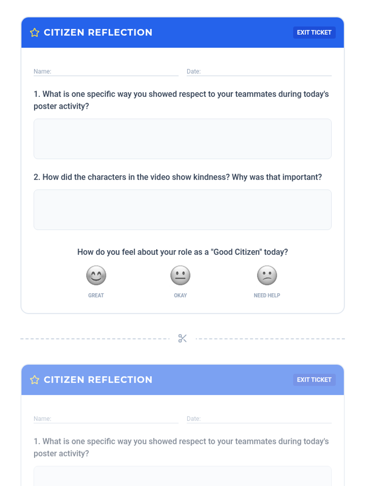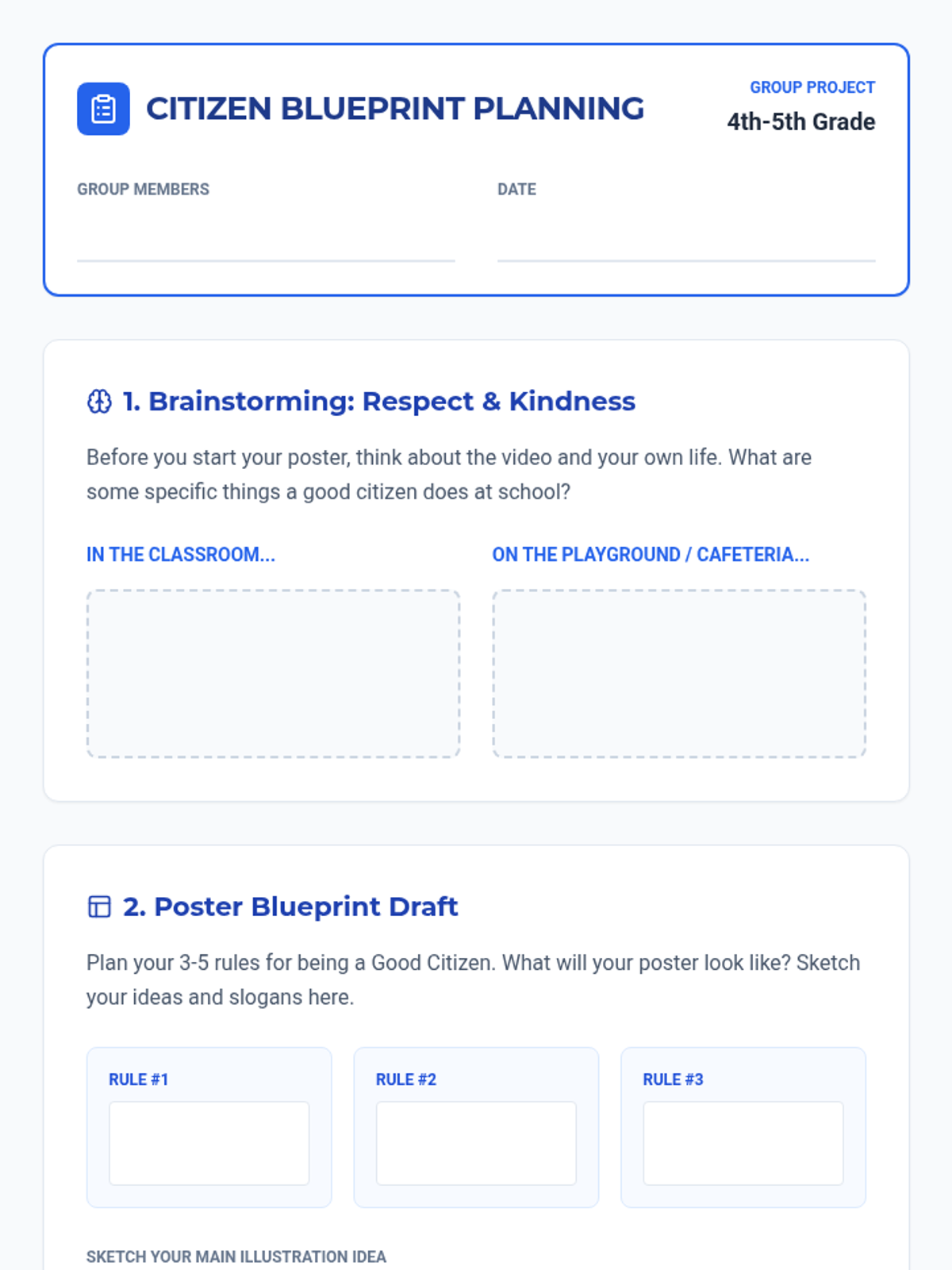 A project-based lesson for 4th-5th graders exploring respect and kindness through the creation of a Good Citizen Blueprint poster. Students will analyze respectful behaviors in school and work collaboratively to visualize citizenship.