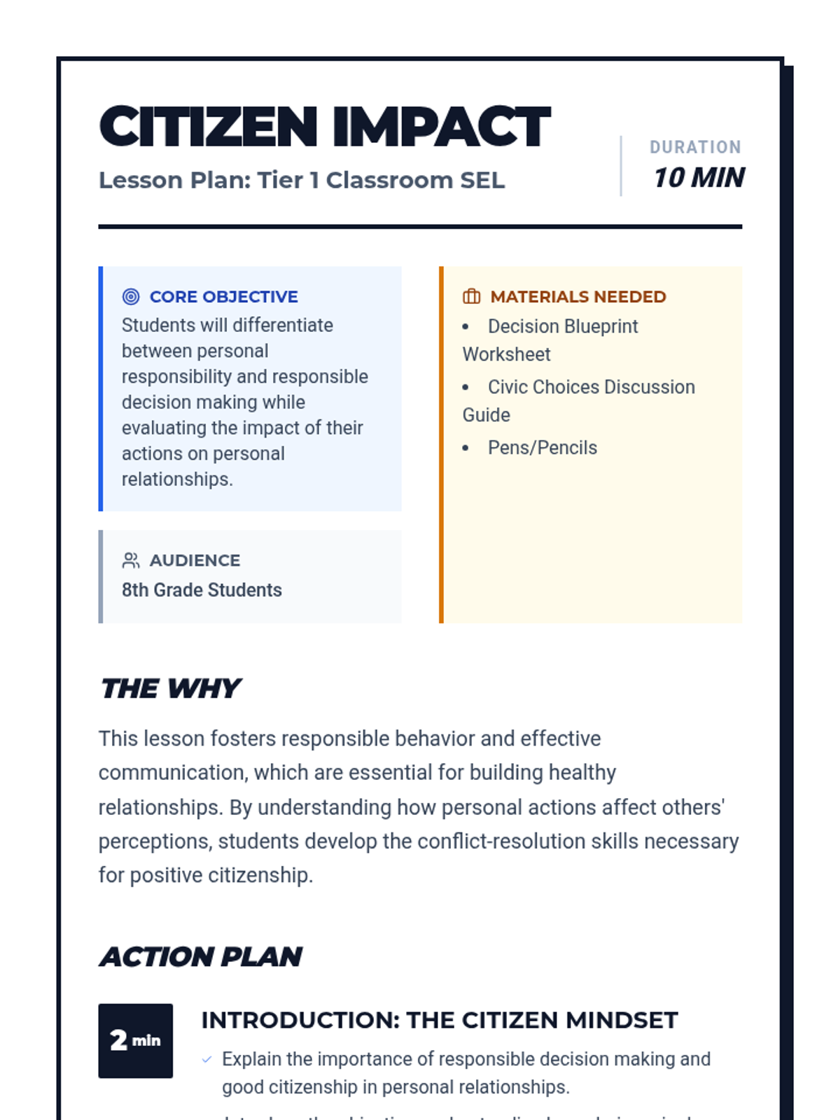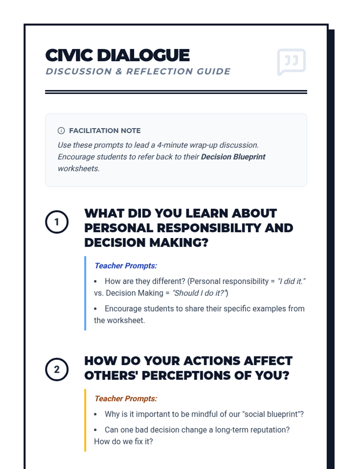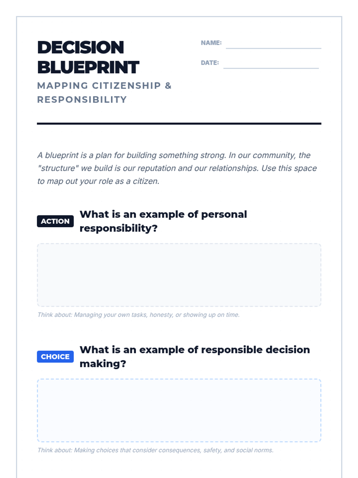 A quick 10-minute lesson for 8th graders to explore the intersection of personal responsibility, responsible decision making, and community impact. Students reflect on how their choices shape their relationships and reputation.