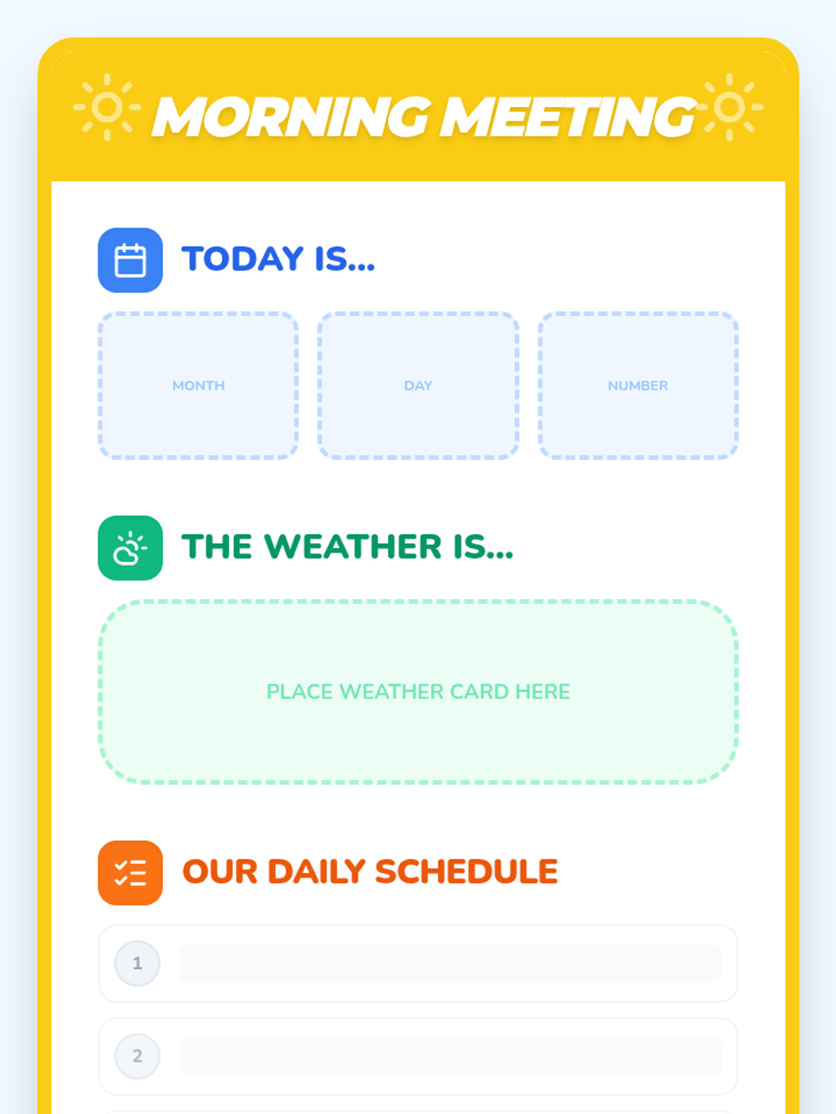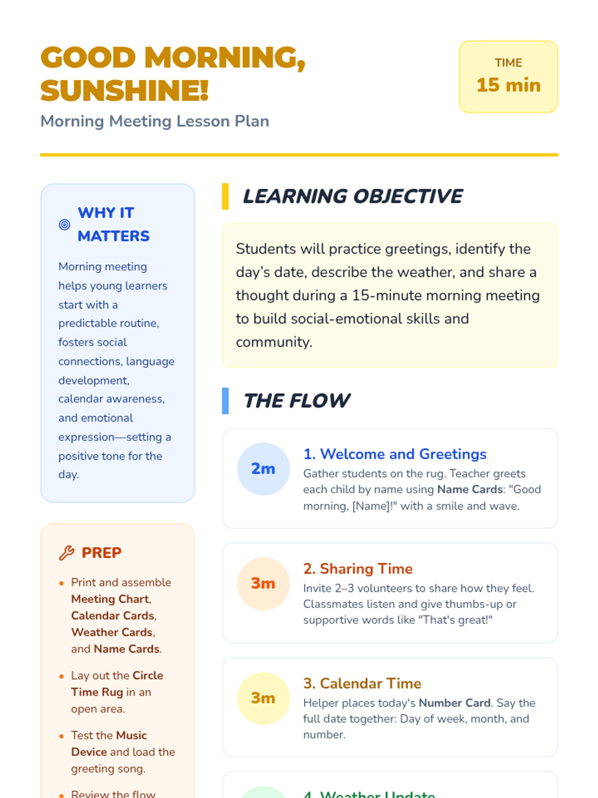 A 15-minute Pre-K Morning Meeting routine designed to build community, practice social skills, and explore daily concepts like the calendar and weather. Students engage in greetings, sharing, and songs to start their day with a positive and predictable structure.