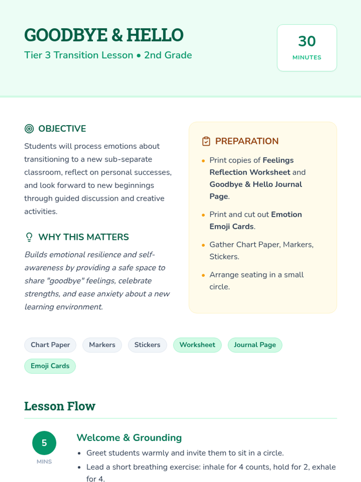 A supportive Tier 3 lesson for 2nd graders transitioning to a new classroom, focusing on emotional processing, celebrating past successes, and building resilience for new beginnings.