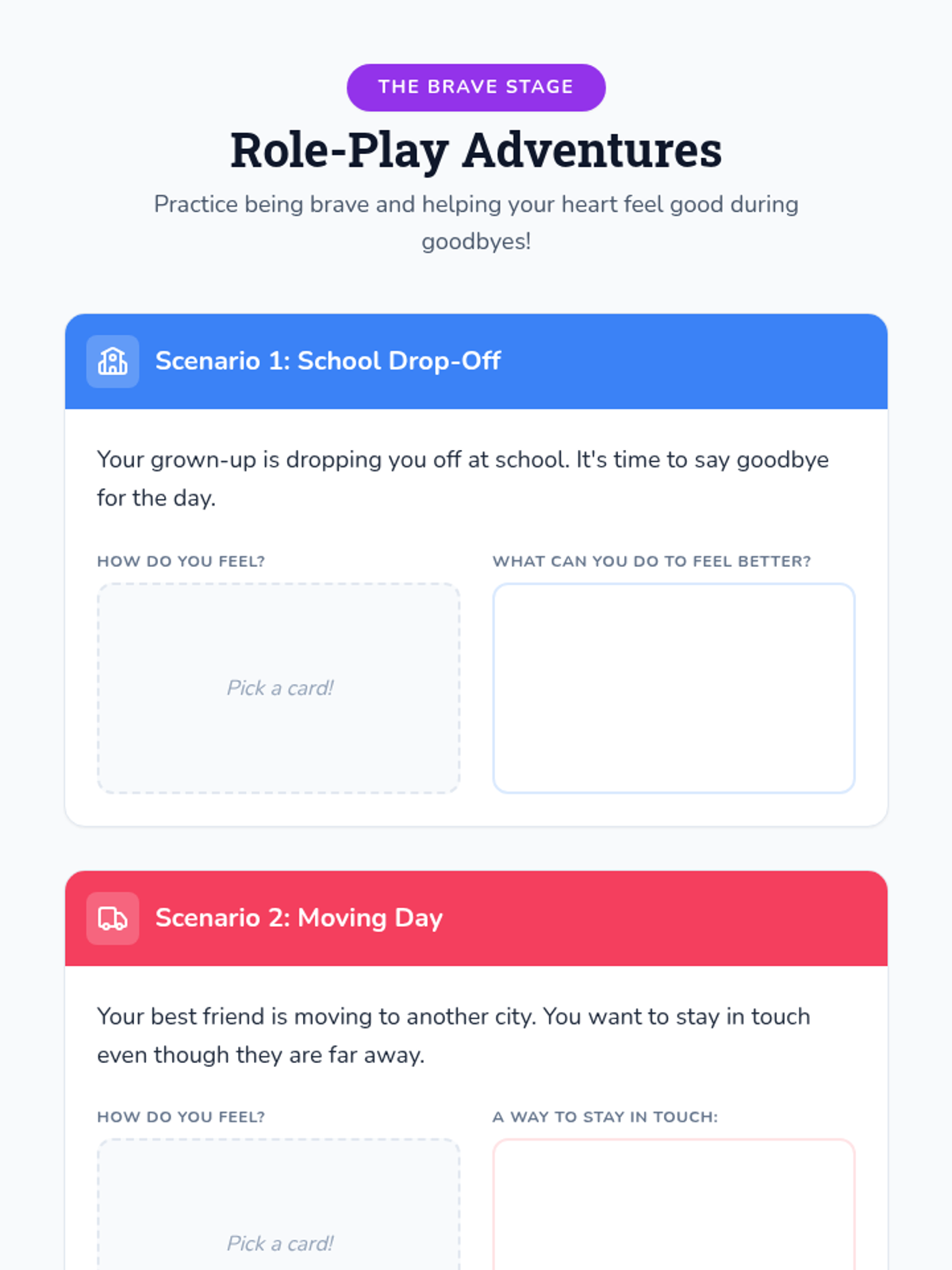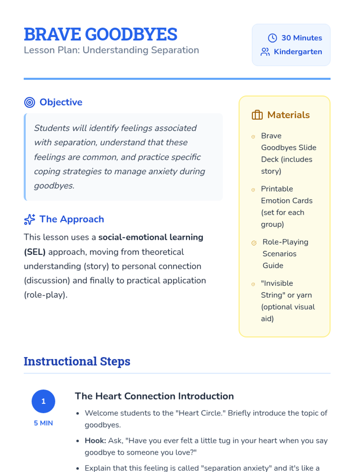 A Kindergarten lesson focused on understanding separation anxiety, identifying emotions, and practicing coping strategies through storytelling and role-play.