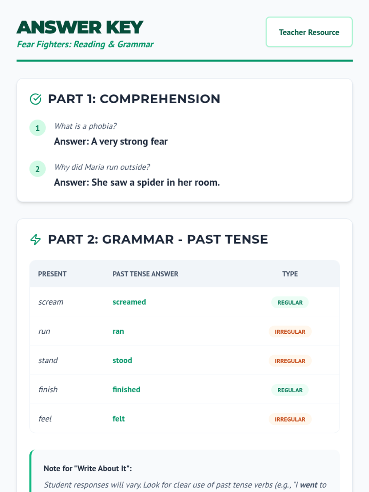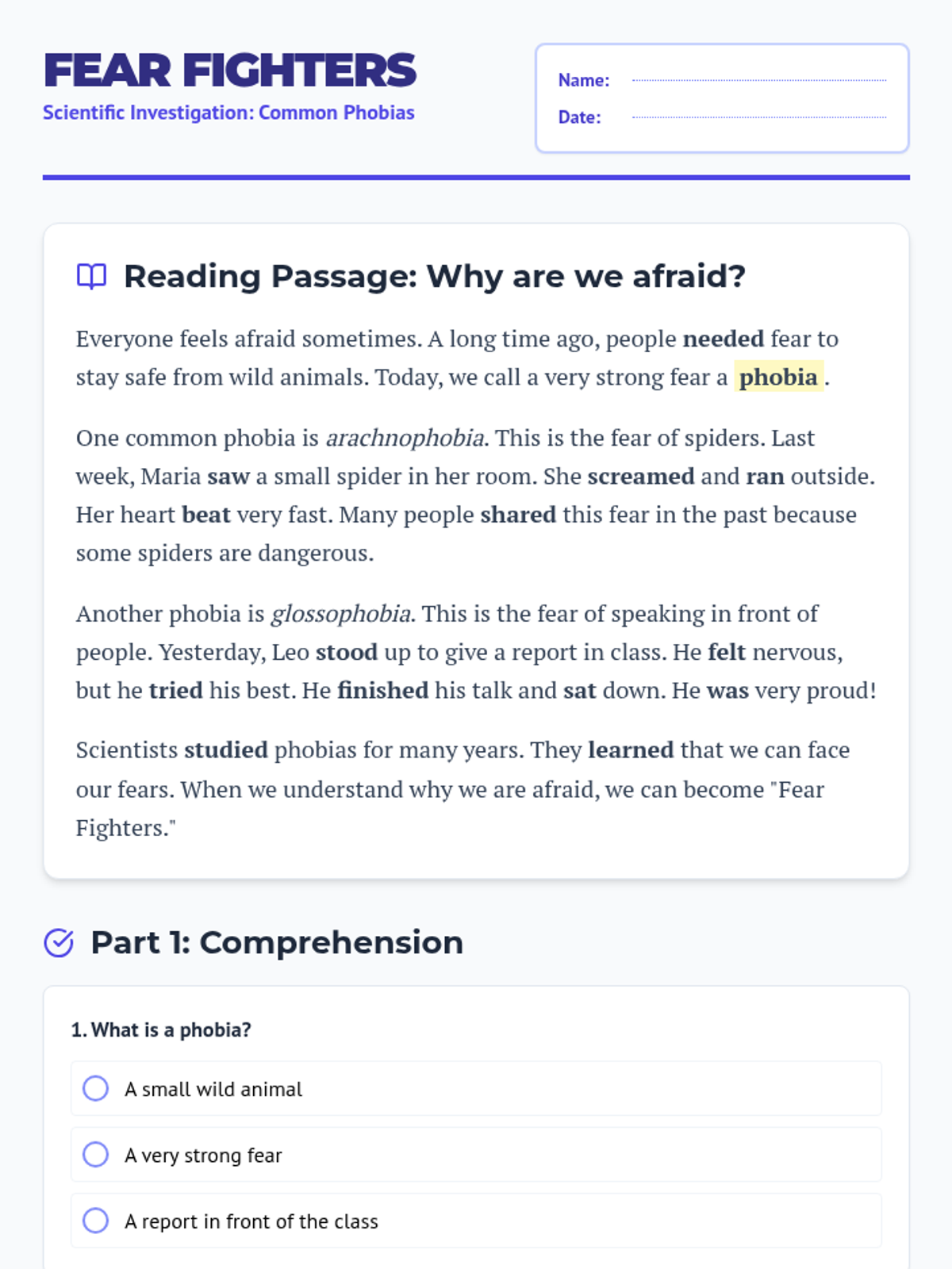 A reading comprehension lesson about common phobias designed for 5th grade Multilingual Learners, focusing on past tense verb conjugation.