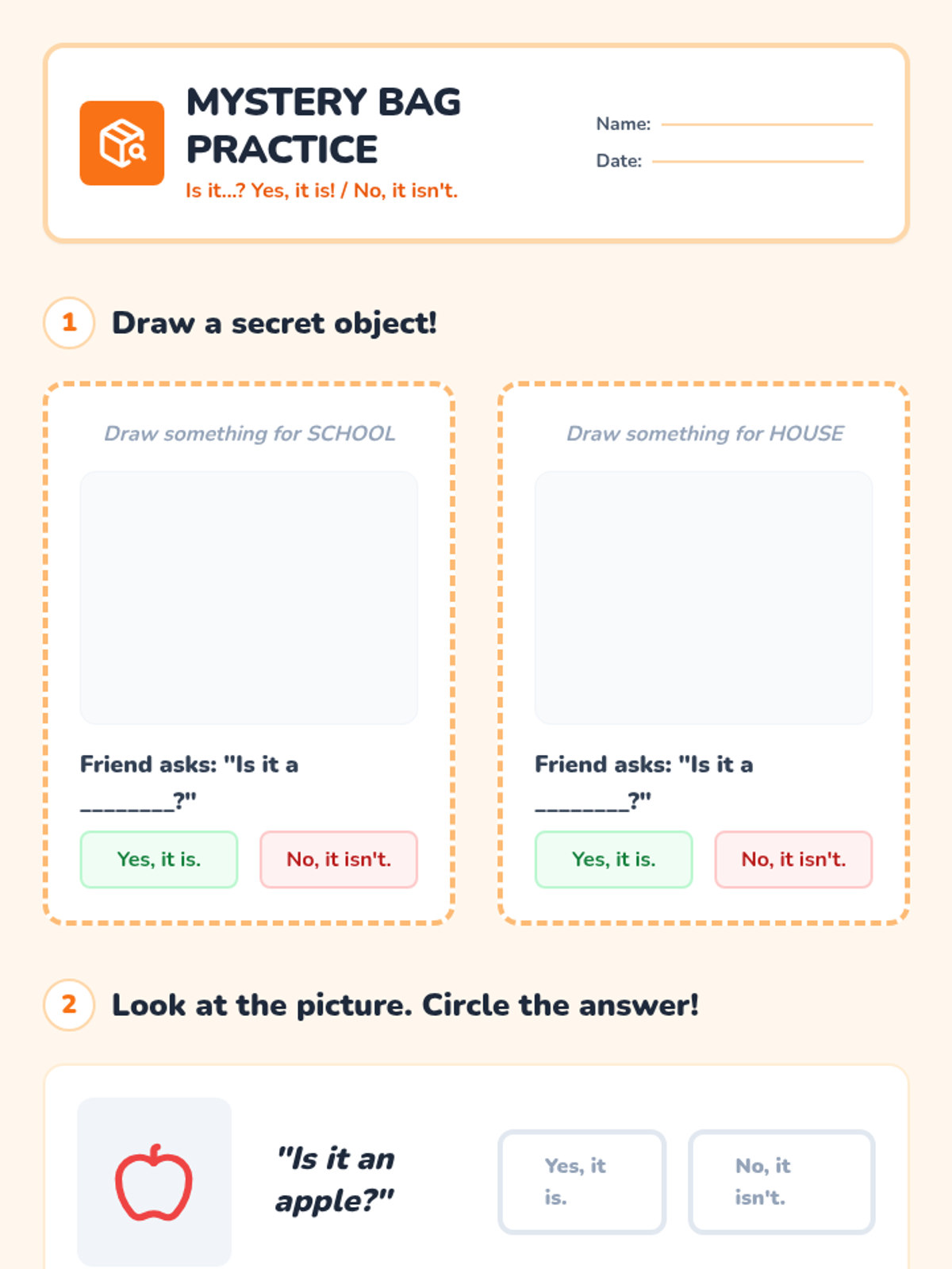 A beginner-level English lesson for 2nd grade Multilingual Learners focused on 'Is it...?' questions using school, food, and house vocabulary.