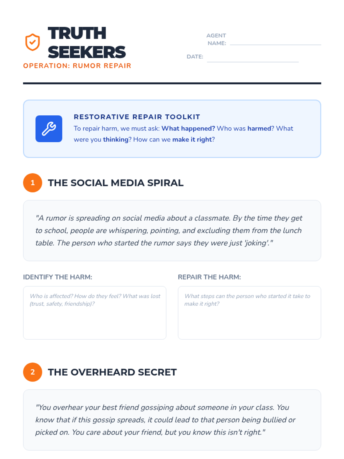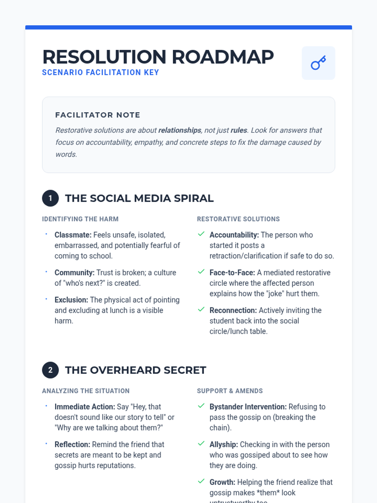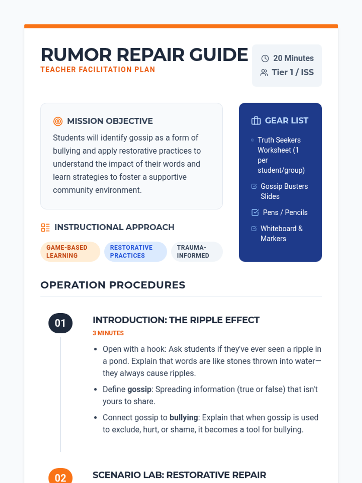 A restorative-focused lesson designed to help students identify gossip as a form of bullying and apply restorative practices to heal community harm. Through game-based scenarios, students develop empathy and practical strategies for conflict resolution.
