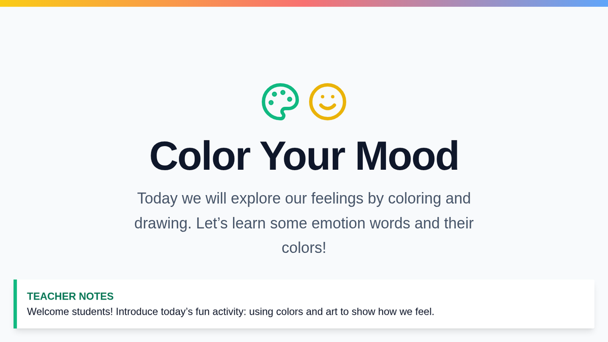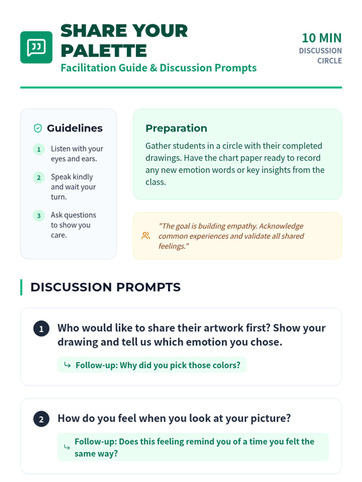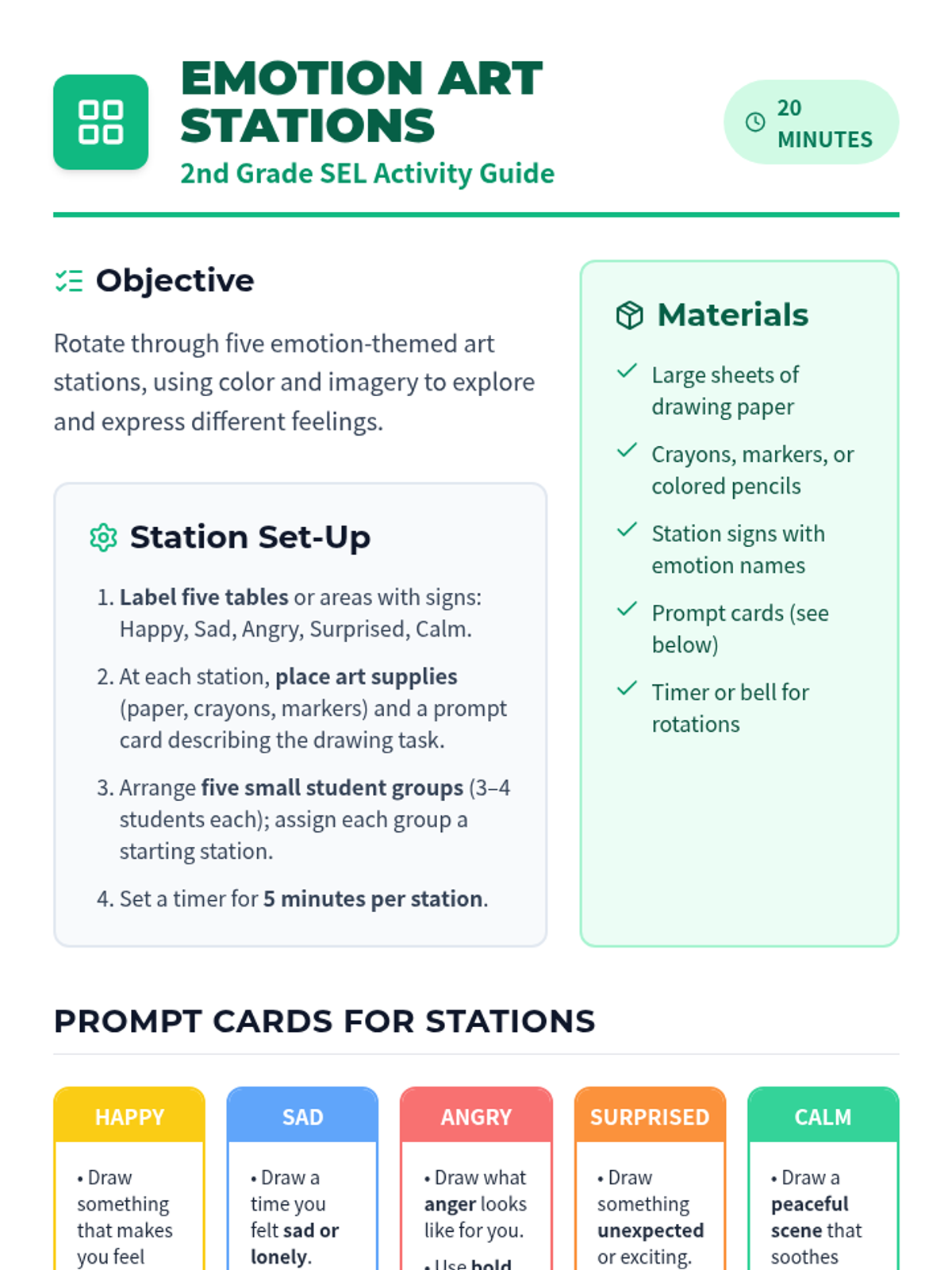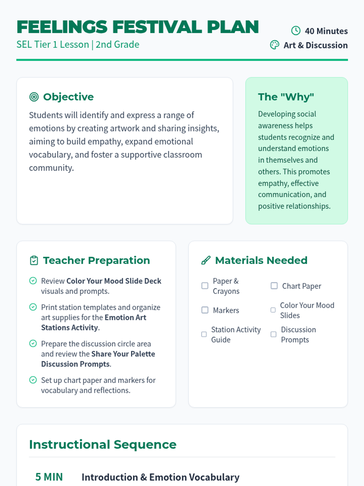 In this 40-minute Tier 1 lesson for 2nd graders, students will explore SEL competency Social Awareness by identifying and expressing emotions through art and discussion. This engaging session builds empathy, emotional vocabulary, and group sharing in a safe environment.