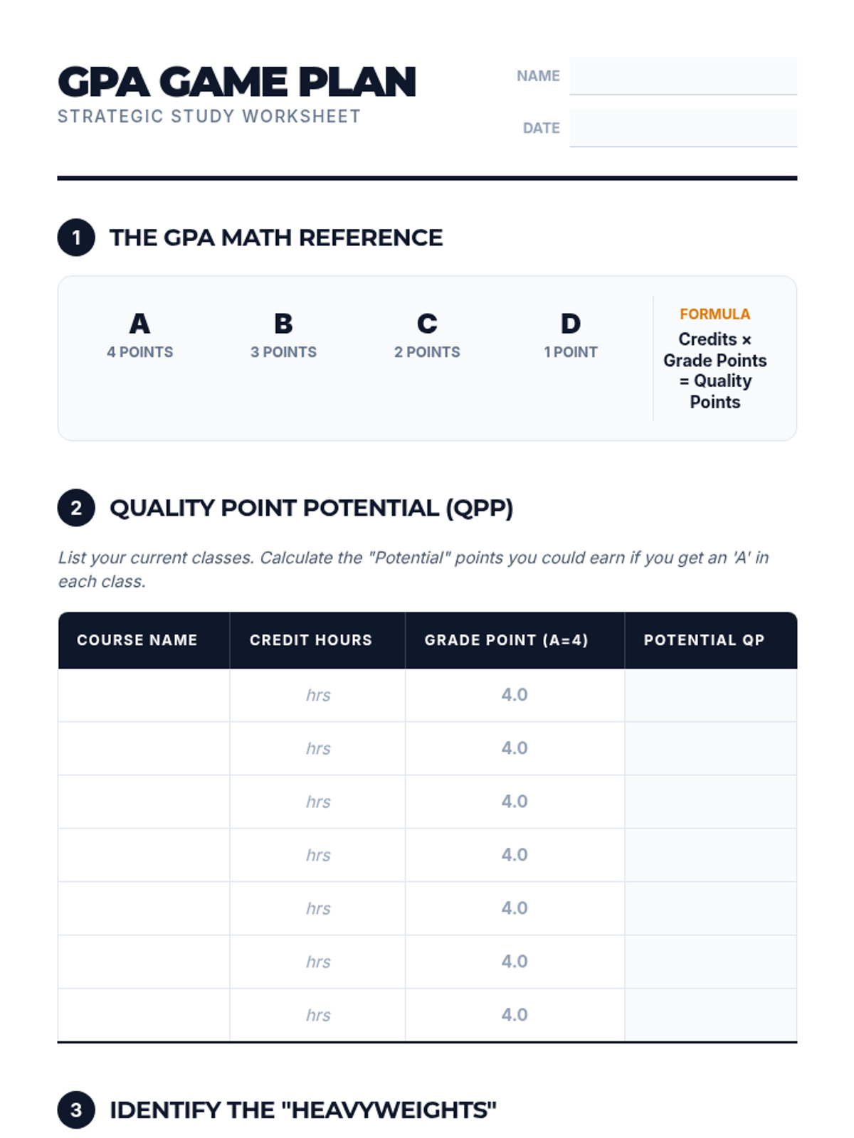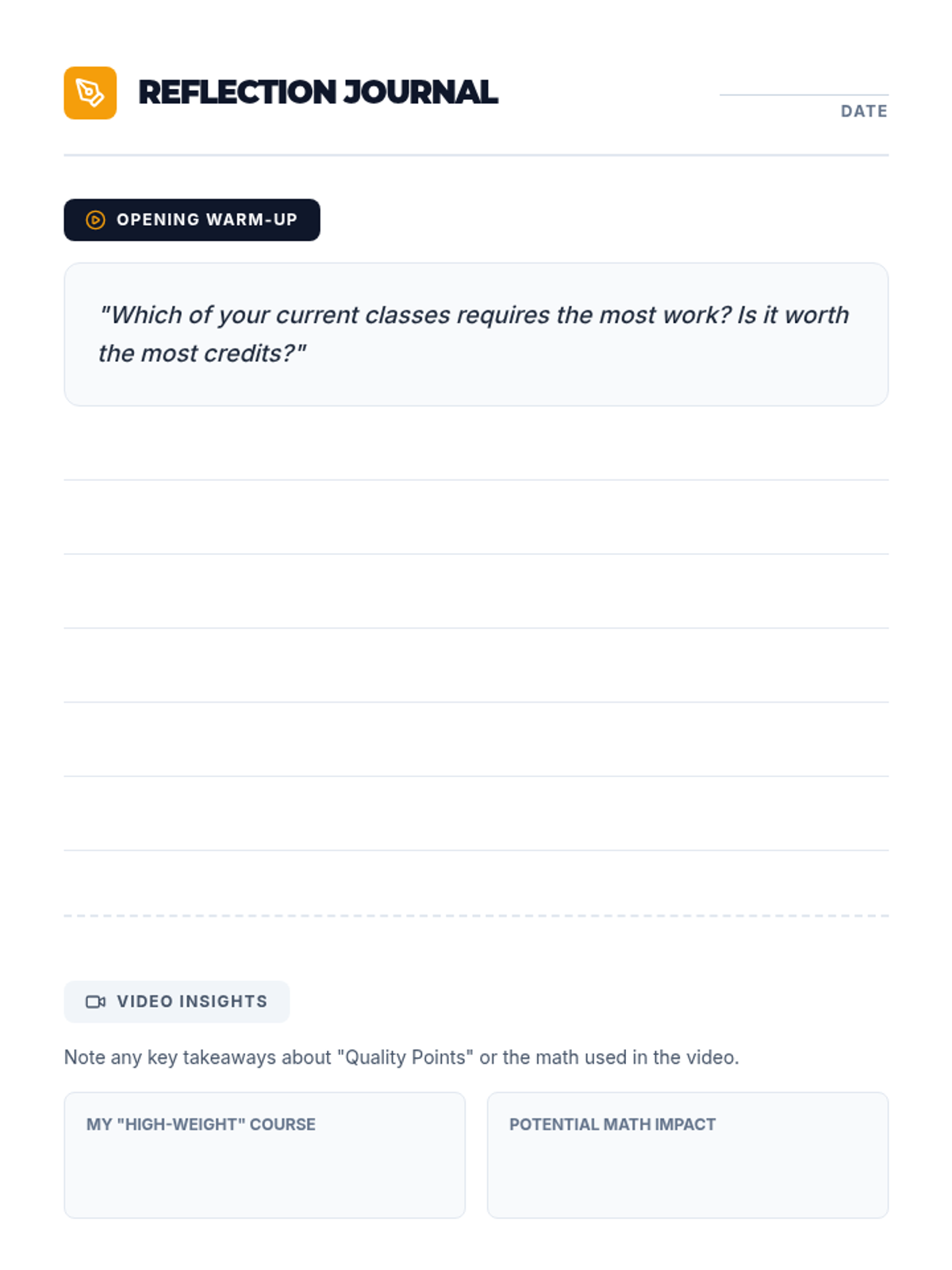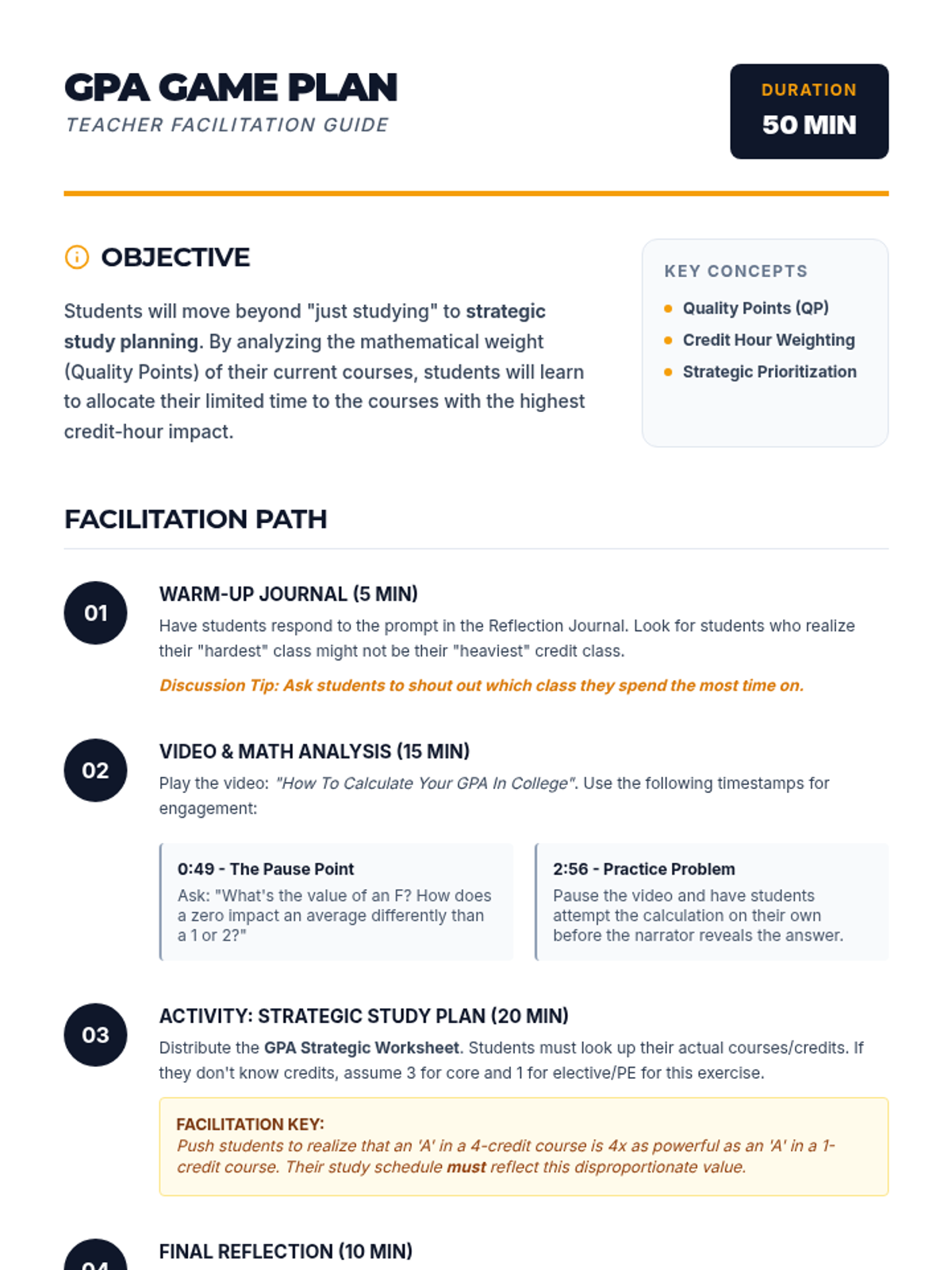 This lesson helps students understand the mathematical weight of different courses based on credit hours. By calculating "Quality Point Potential," students learn to prioritize high-credit courses in their study schedules to maximize their GPA.