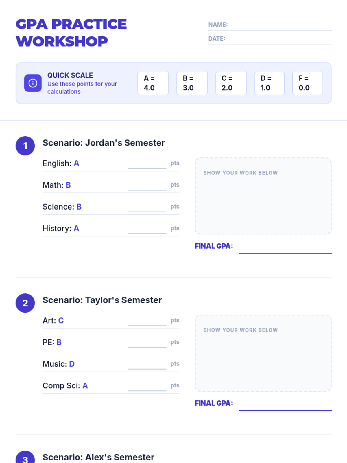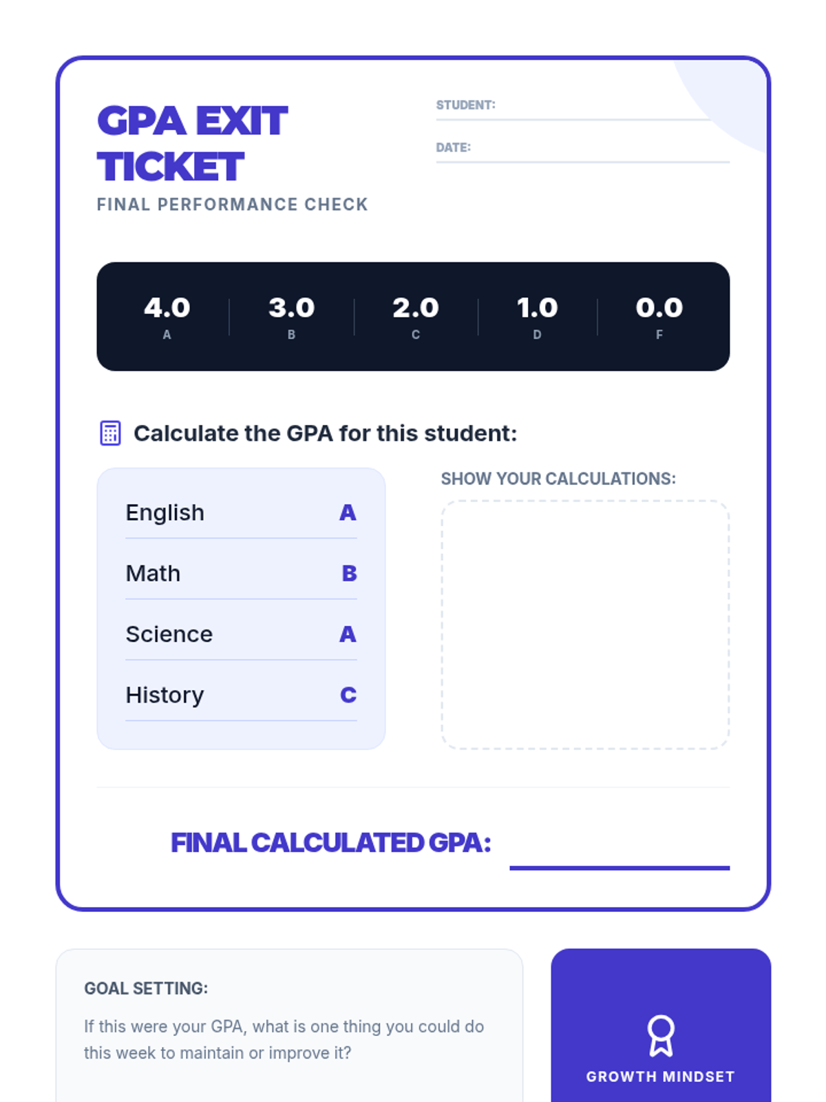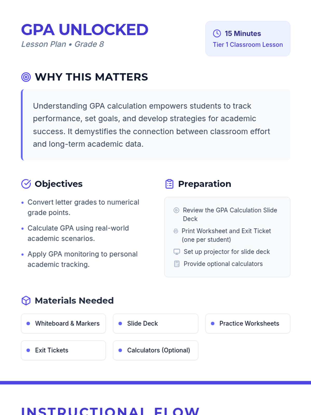 A 15-minute 8th-grade lesson on calculating Grade Point Average (GPA). Students learn to convert letter grades to numerical points and calculate their average to track academic progress and set goals.