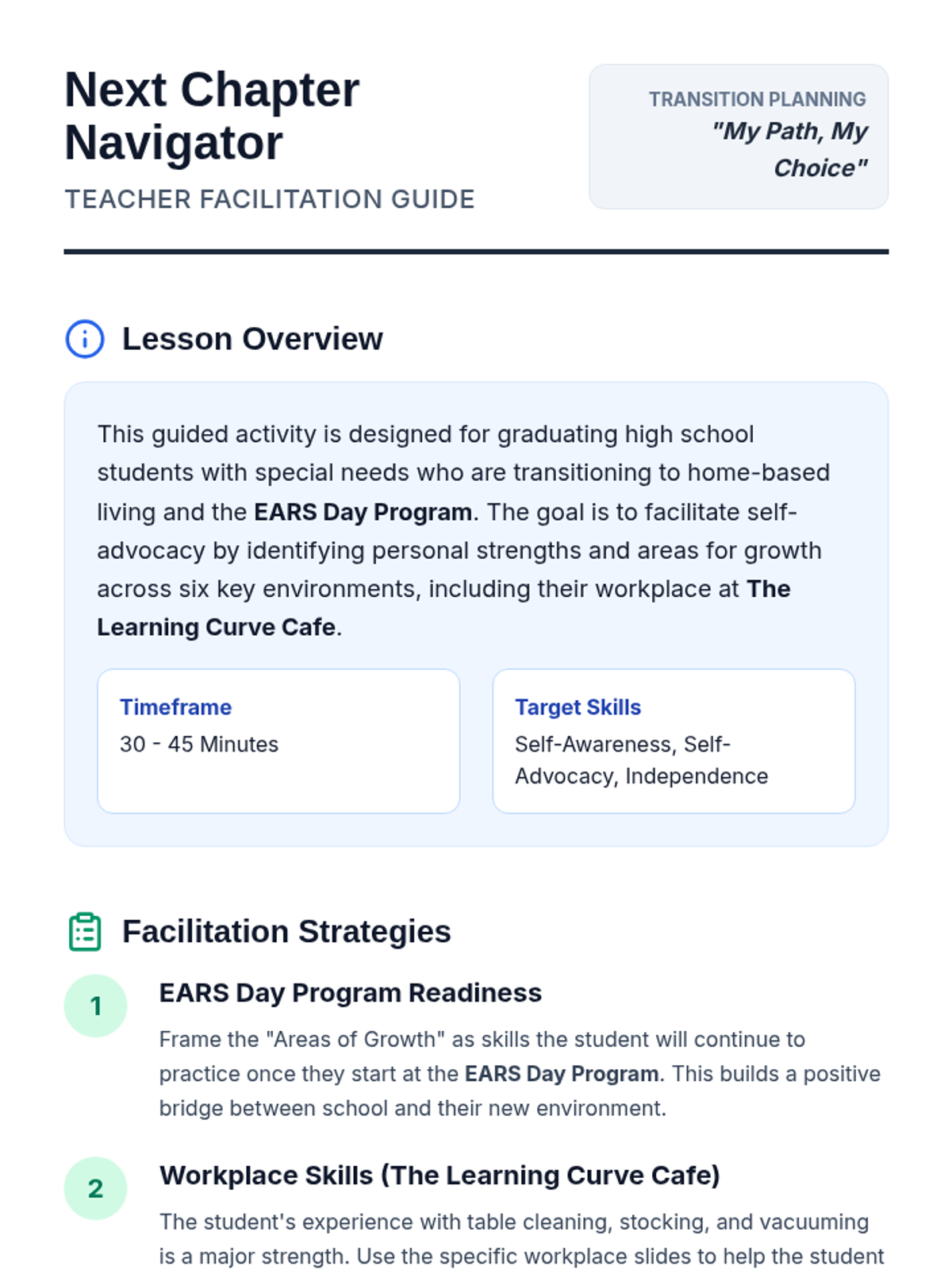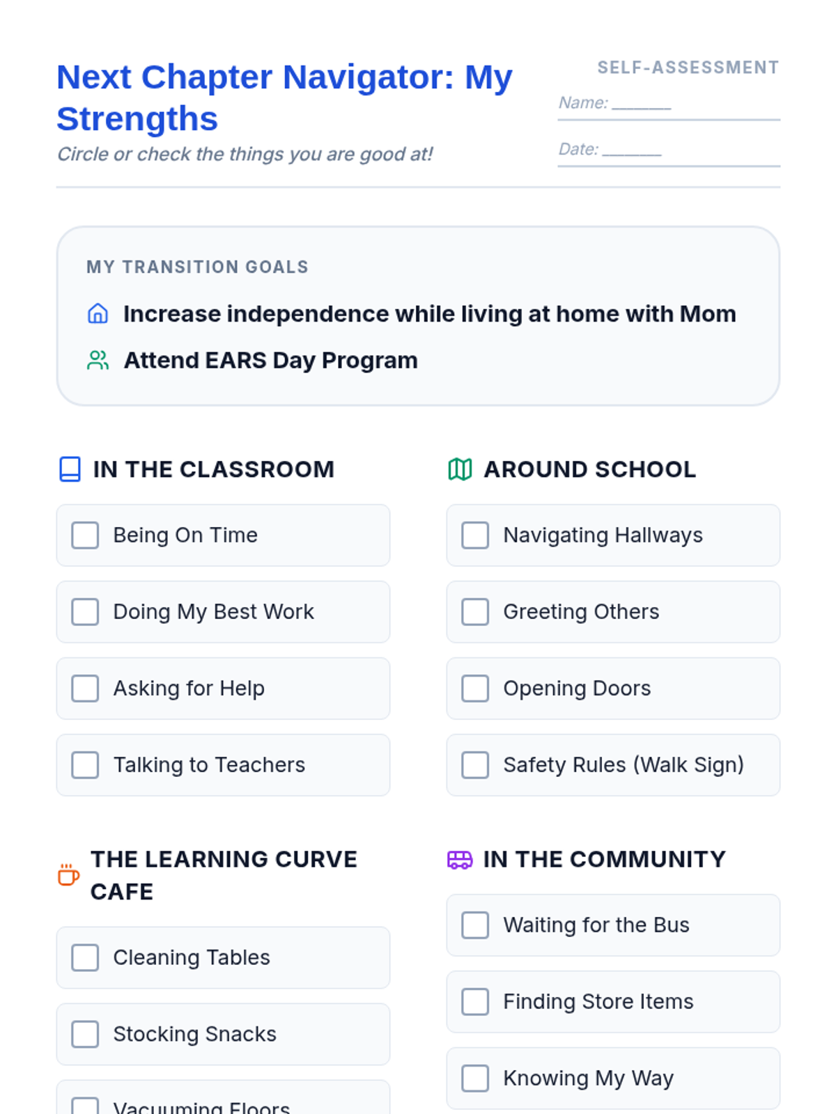 A guided transition planning lesson for graduating students to identify their personal strengths and areas for growth across different environments as they prepare for life at home and in a day program.