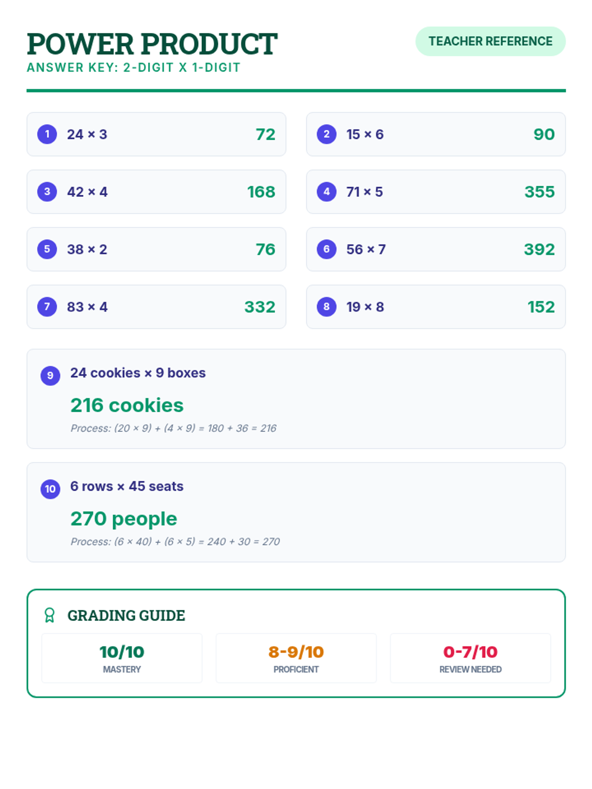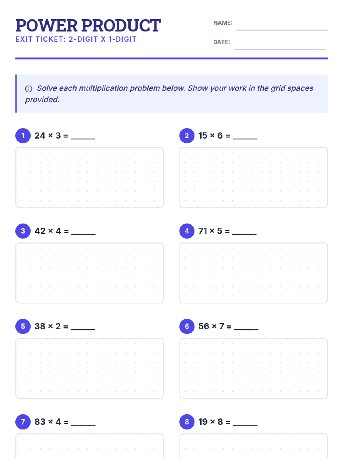 A focused lesson on multiplying 2-digit numbers by 1-digit numbers, emphasizing the standard algorithm and area model strategies.