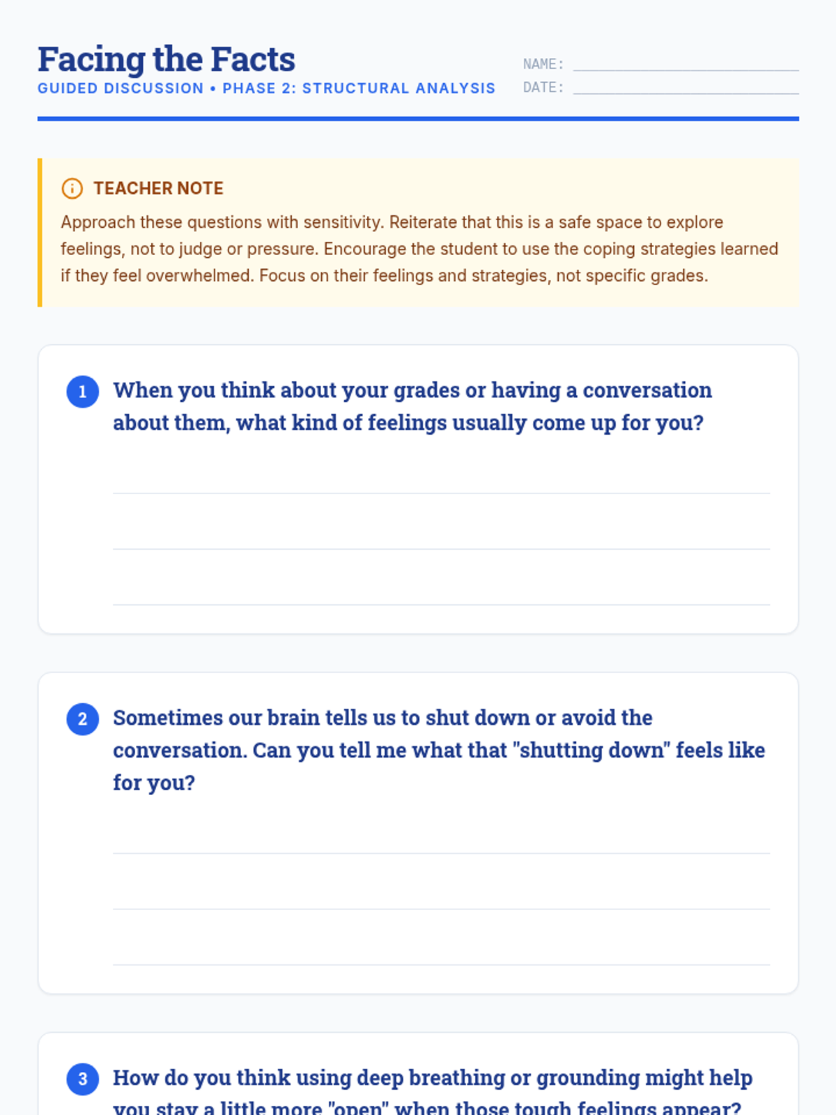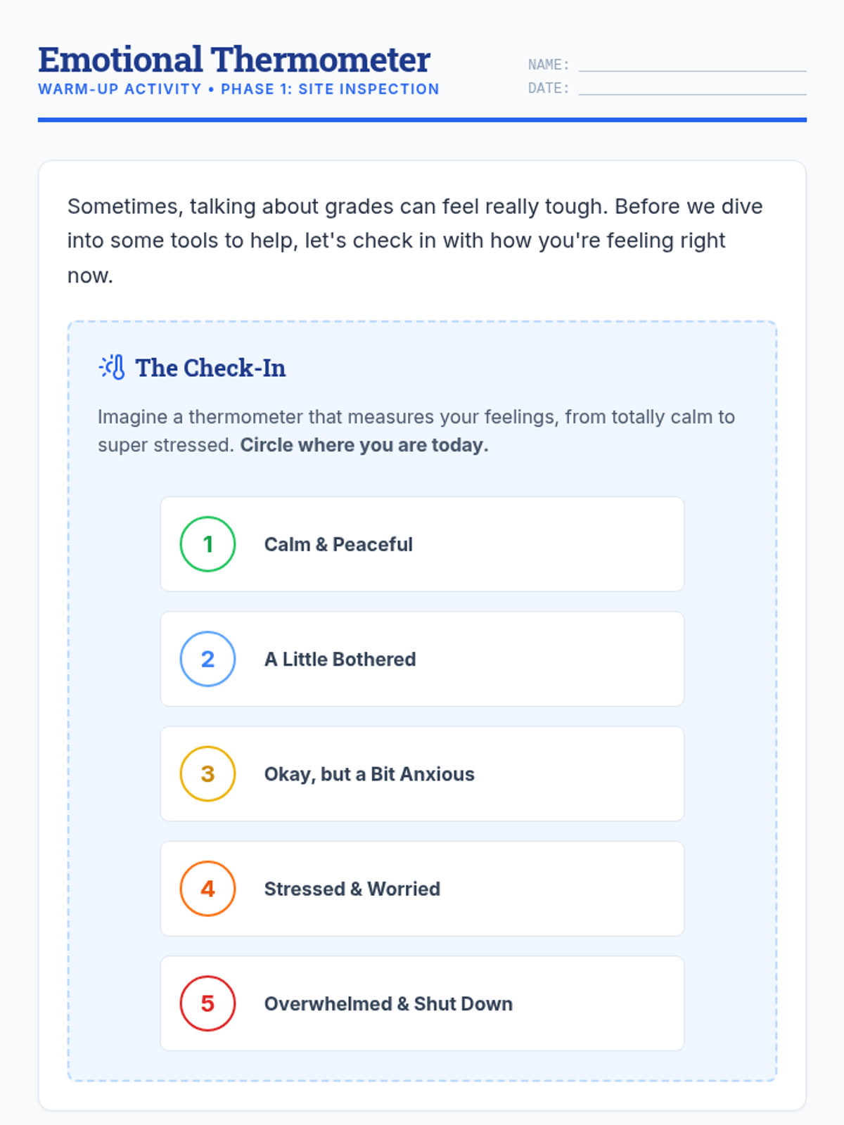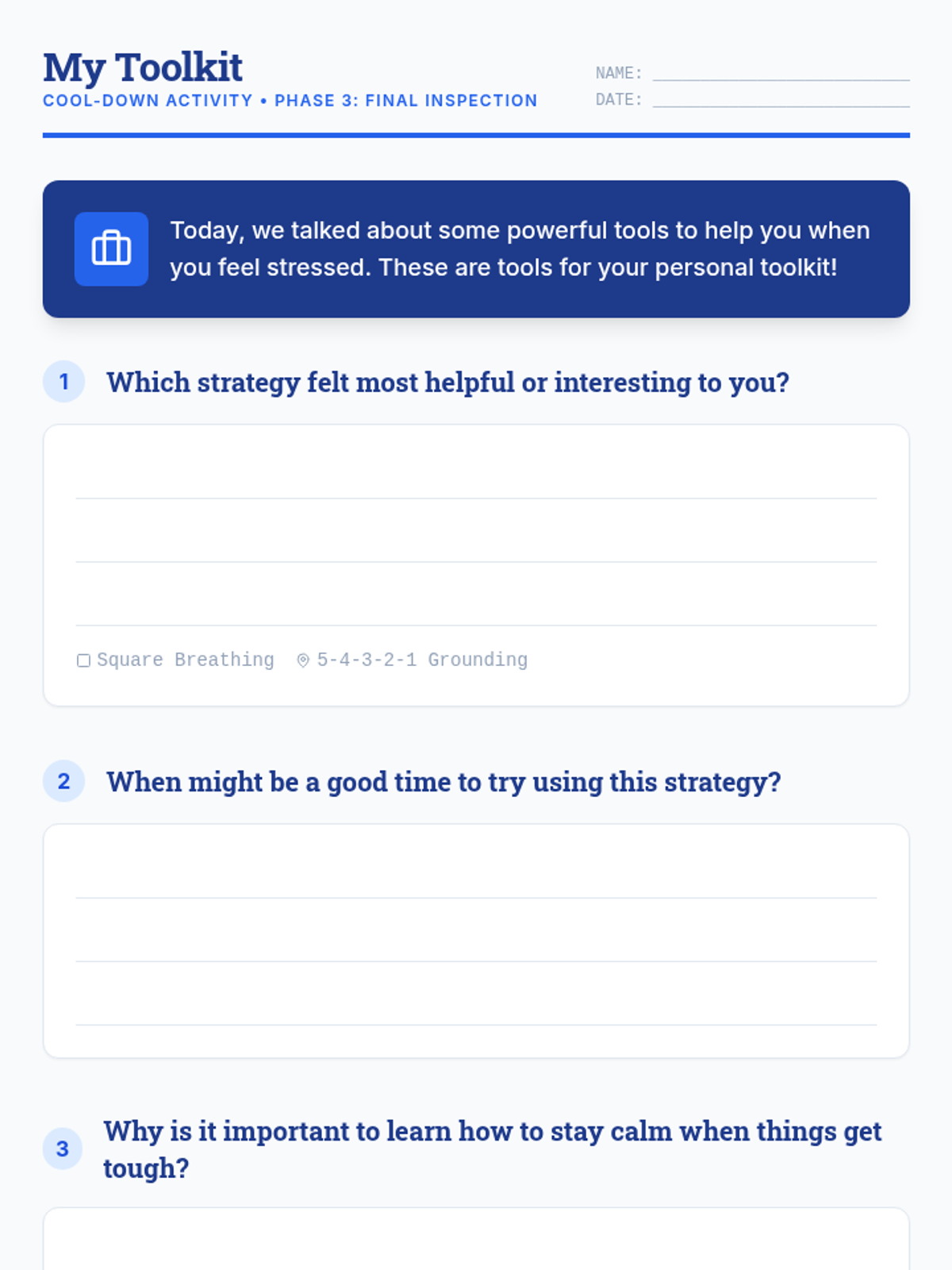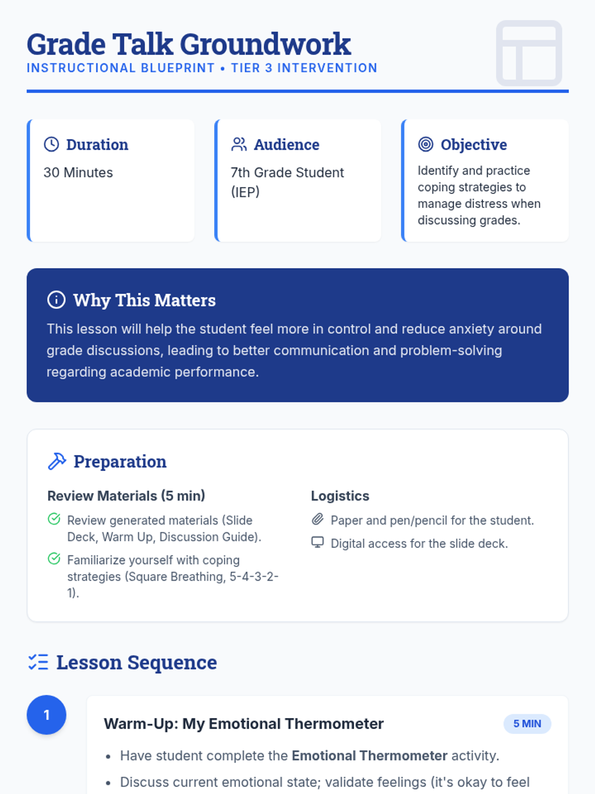 A 30-minute Tier 3 intervention for 7th-grade students on IEPs to build distress tolerance skills for grade-related discussions. Students learn to recognize stress signals and practice calming techniques like square breathing and grounding.