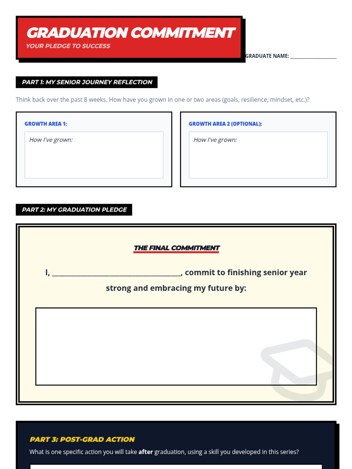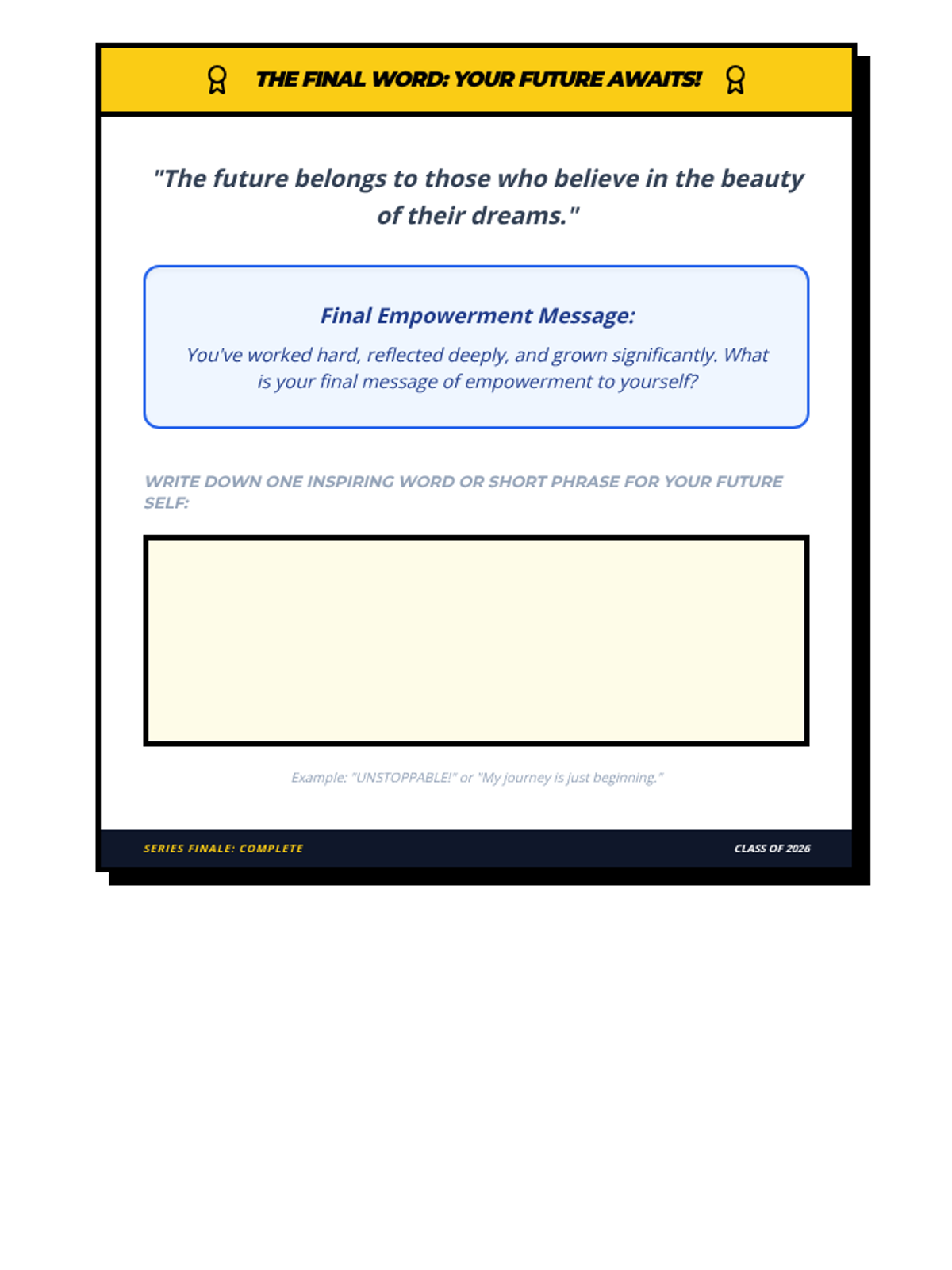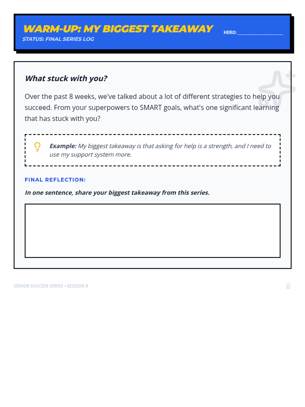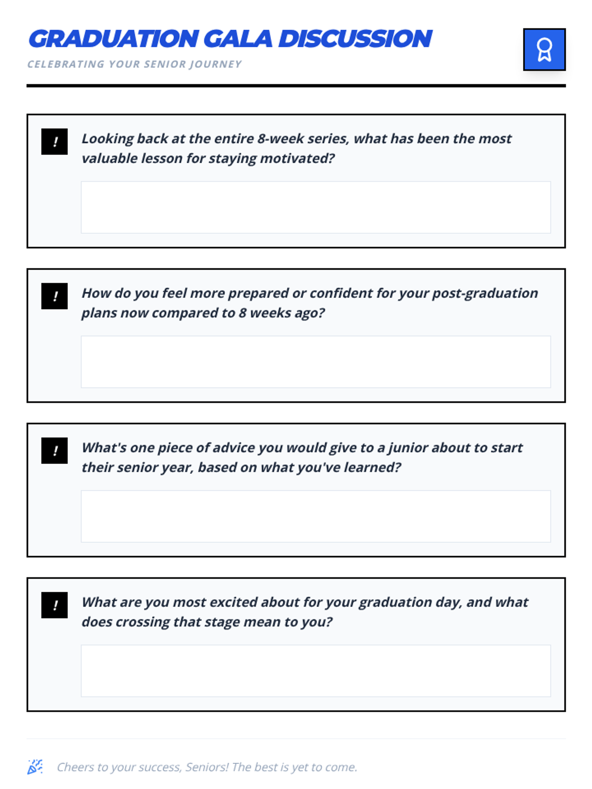 Students will reflect on their growth throughout the 8-week series, celebrate their achievements, and articulate their commitment to finishing senior year strong and embracing their future with confidence.