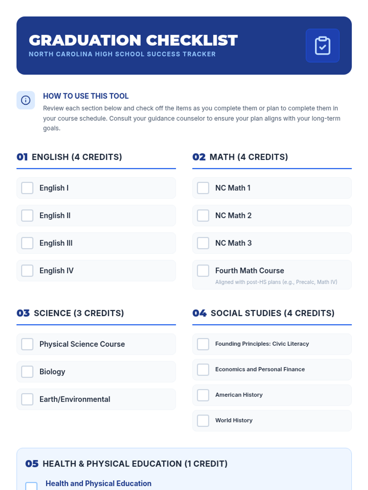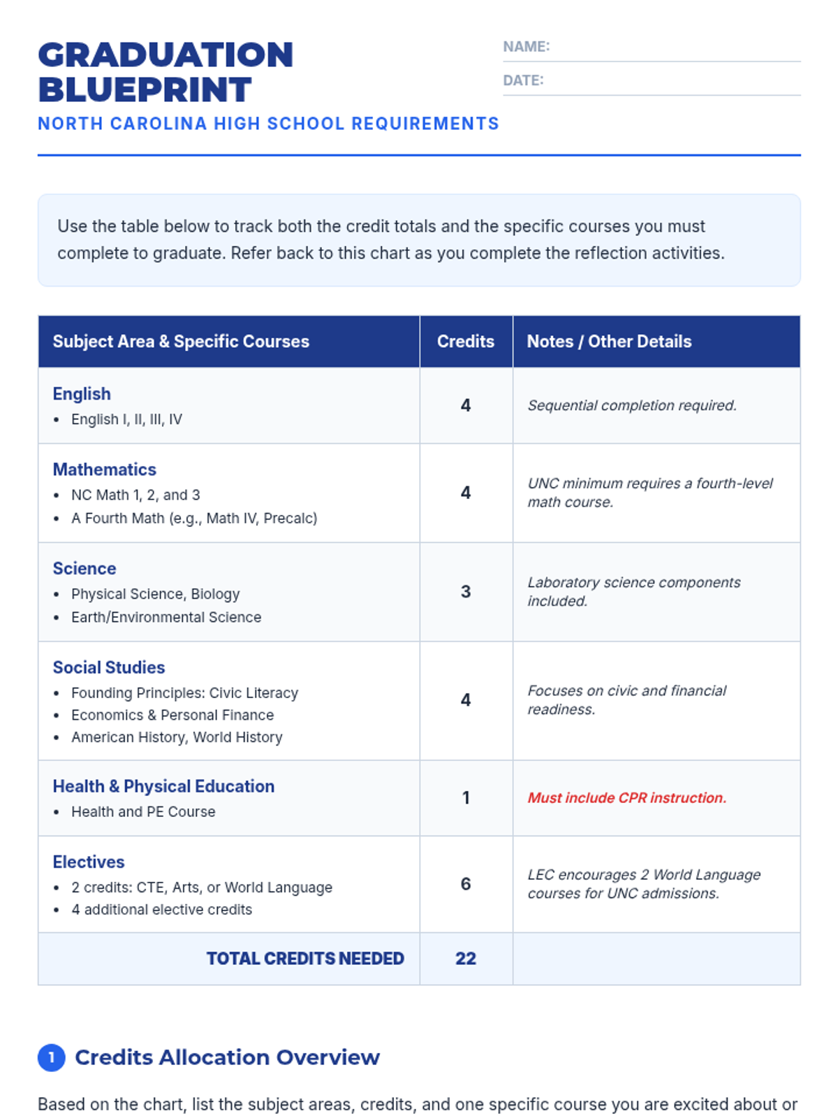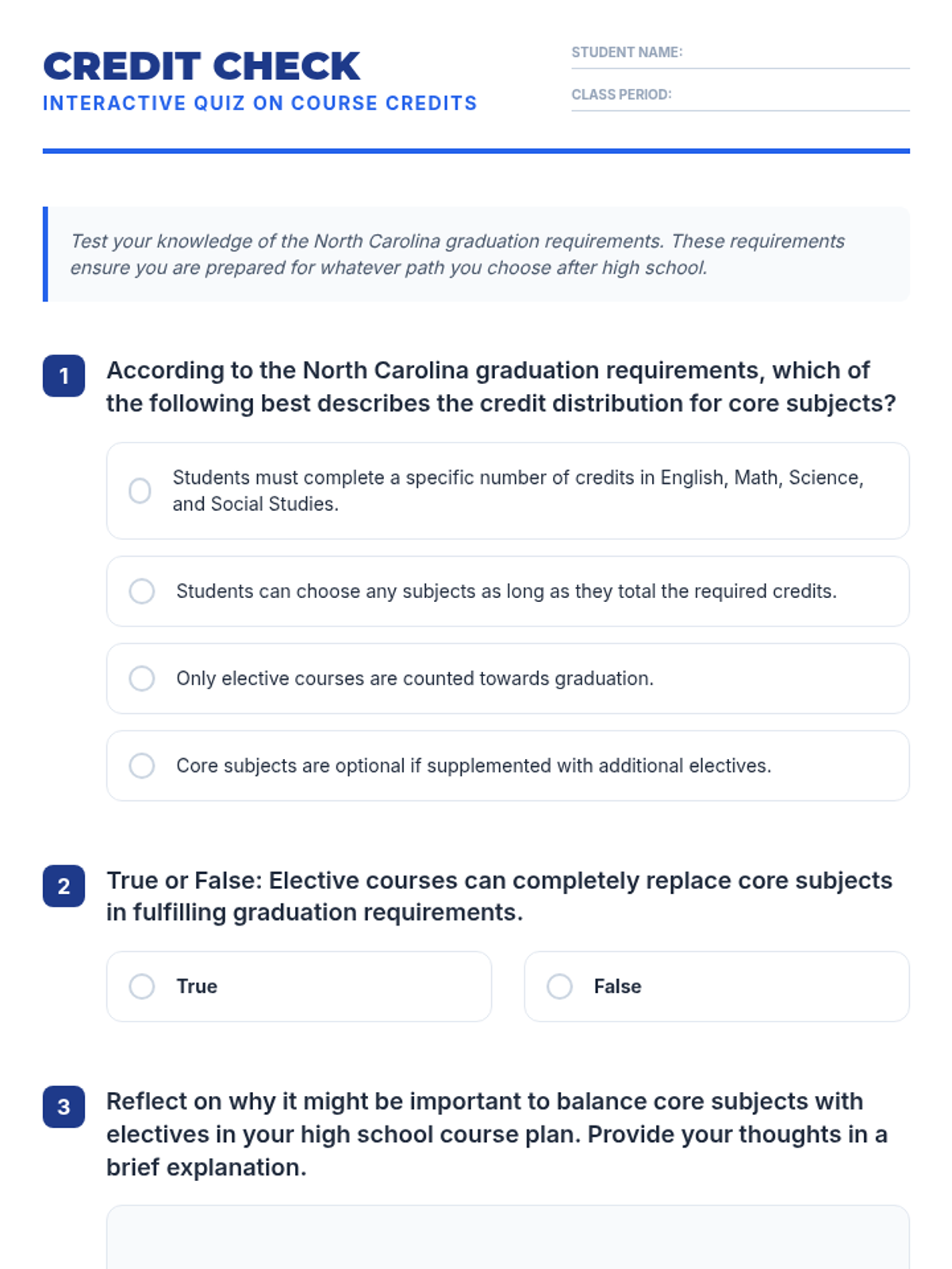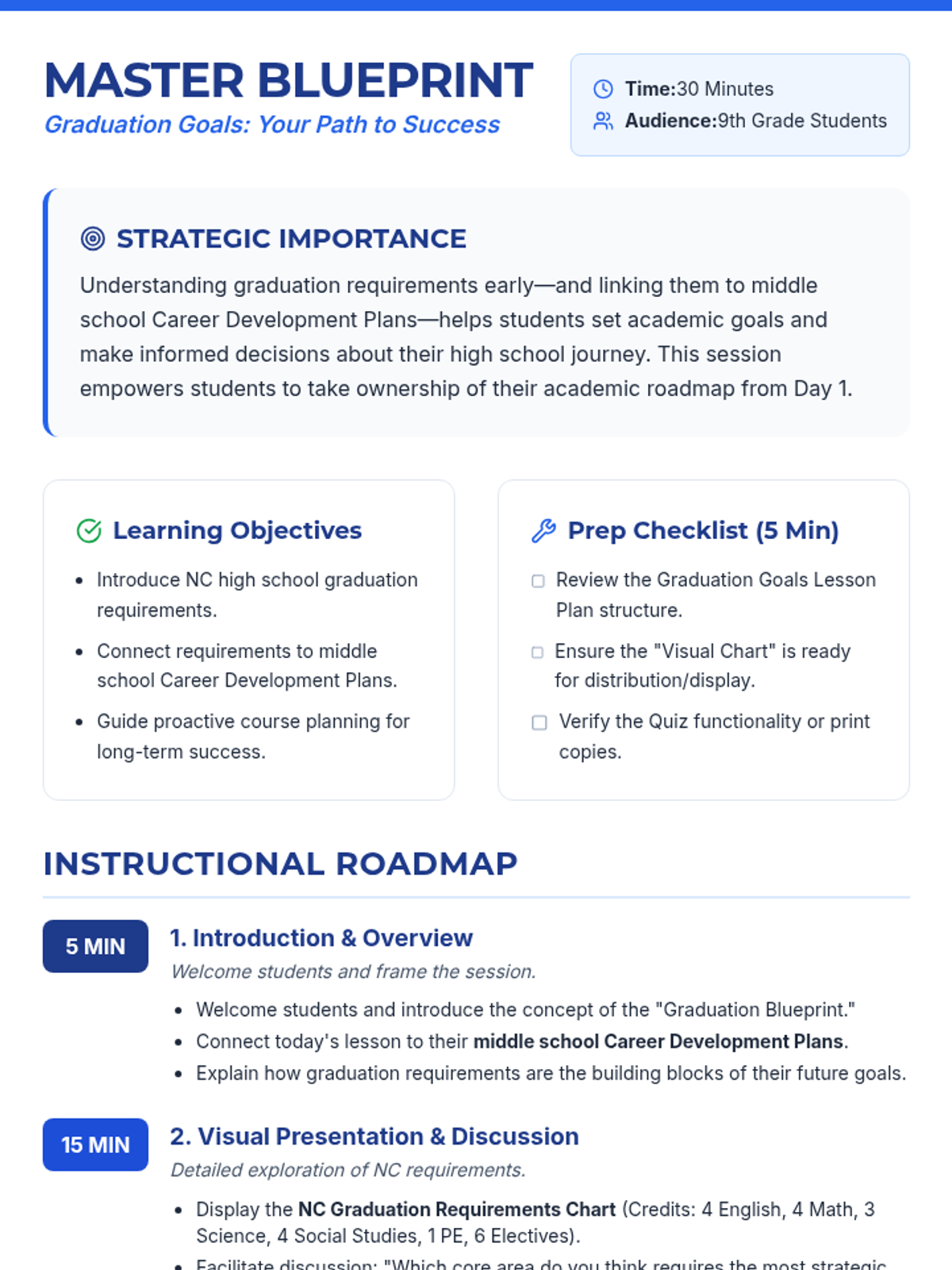 This lesson introduces 9th-grade students to North Carolina's high school graduation requirements, covering core credits, electives, and strategic course planning. Students will learn to navigate their academic roadmap and align their high school journey with their future career goals.