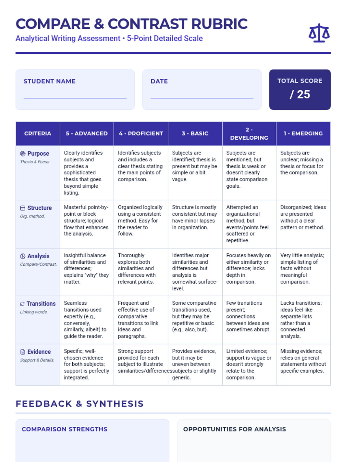 Resources for mastering comparative writing, including rubrics and organizers for subject analysis.