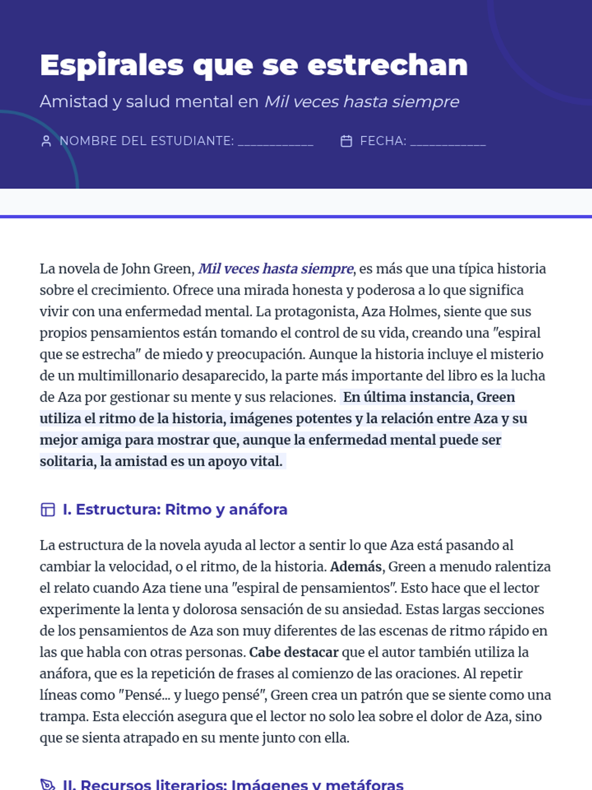 A 9th-grade level exemplar analysis essay of John Green's 'Turtles All the Way Down' focusing on text structure, literary devices, and character dynamics. Includes a targeted guide to academic transition words.