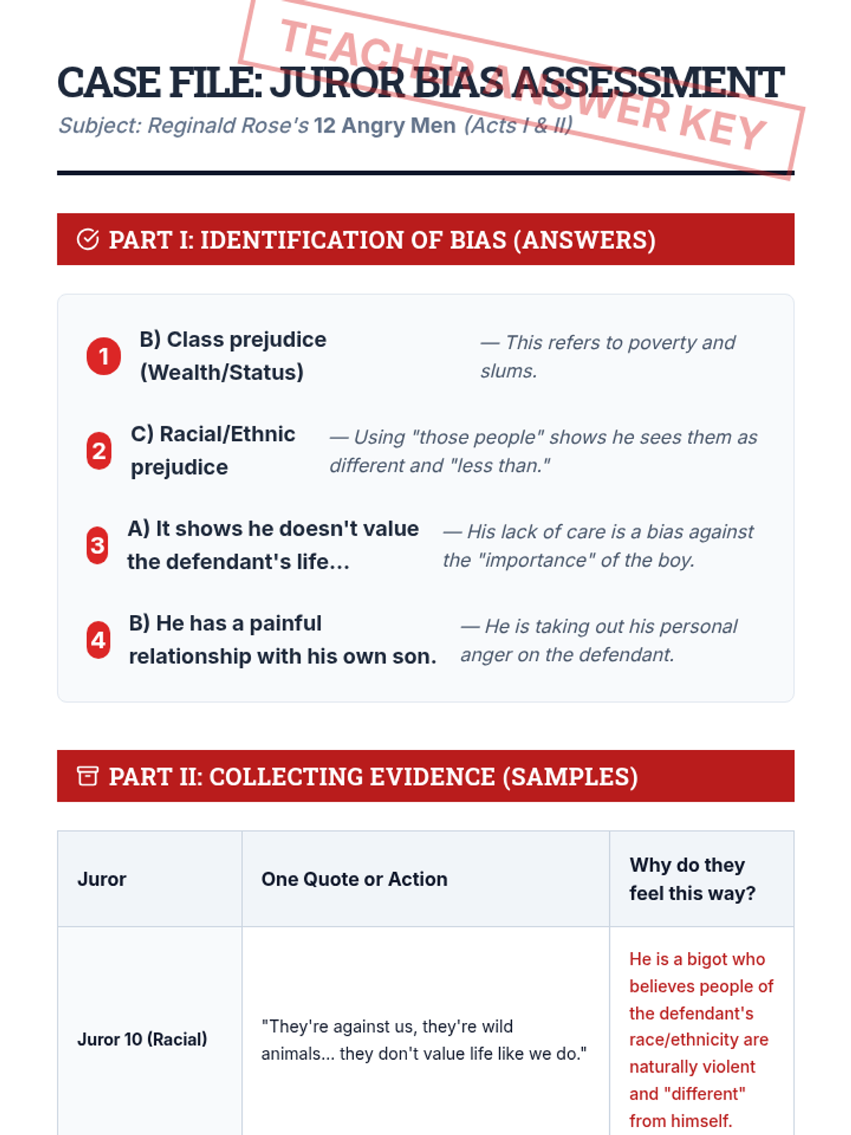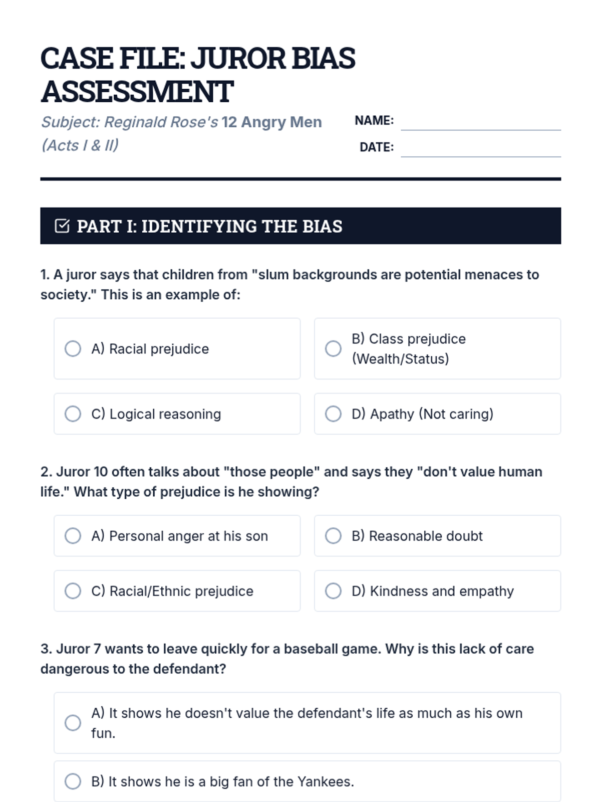 A lesson focused on analyzing the deep-seated prejudices of Jurors 3, 4, 7, and 10 in Rose's '12 Angry Men'. Students will identify textual evidence and analyze how these biases obstruct the pursuit of justice.