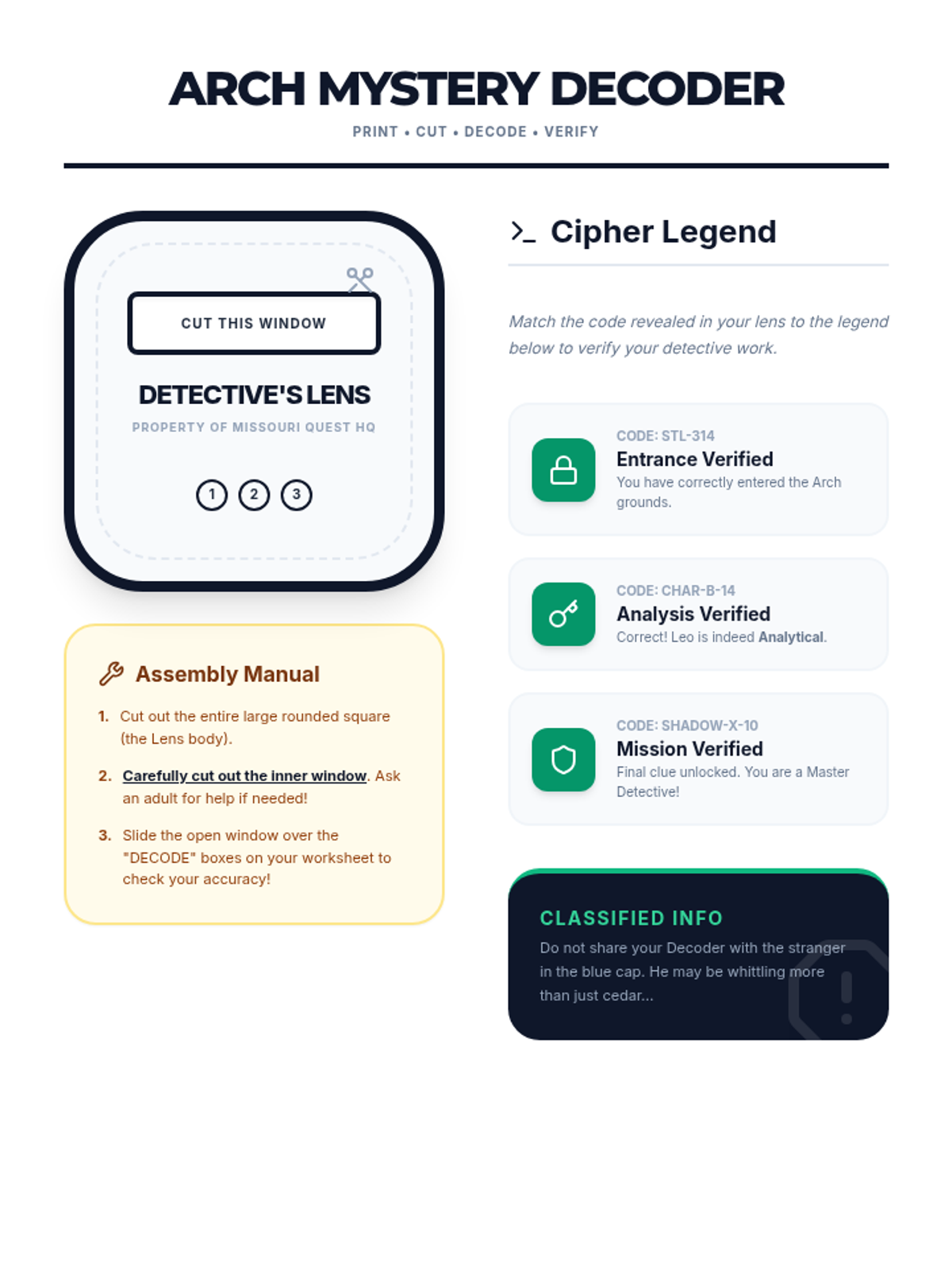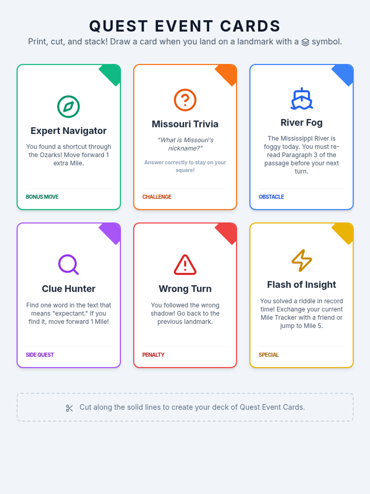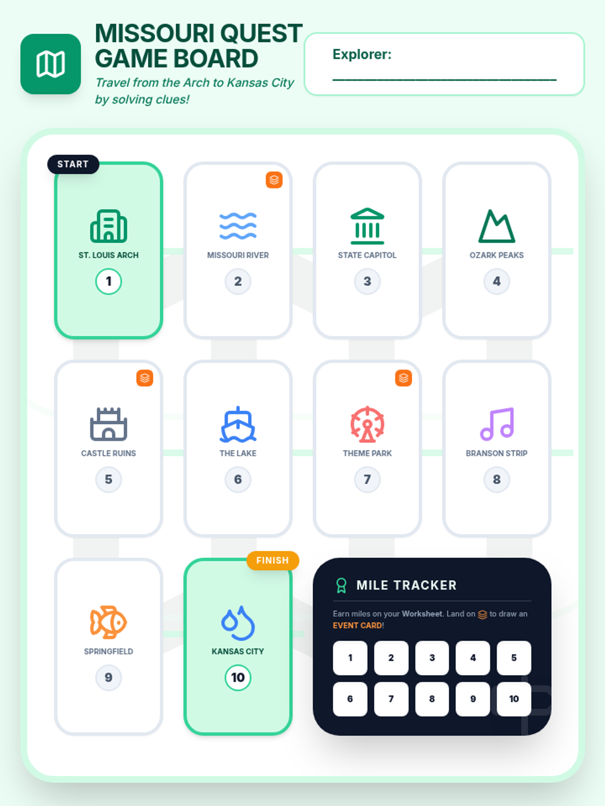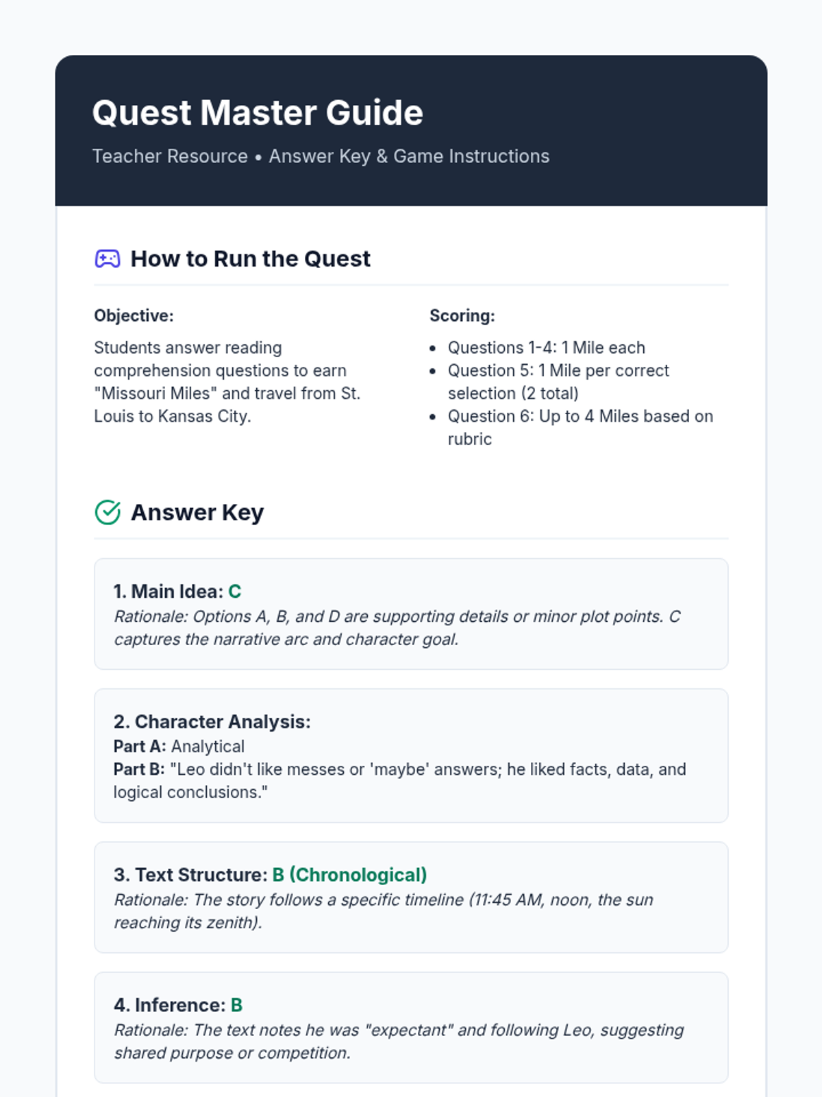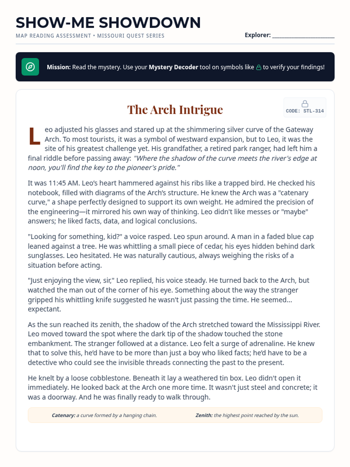 A 5th-grade reading lesson focused on MAP-style standards (Main Idea, Inference, Character, Text Structure) through a Missouri-themed mystery game.