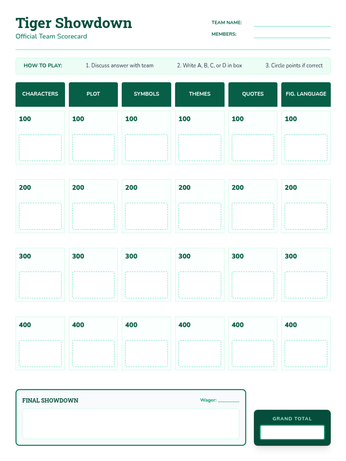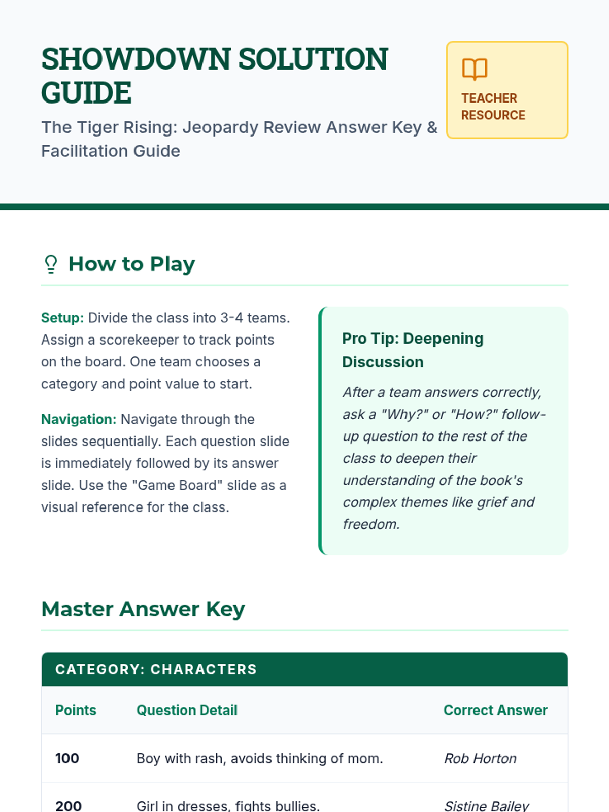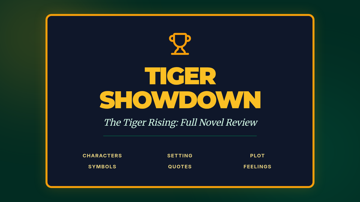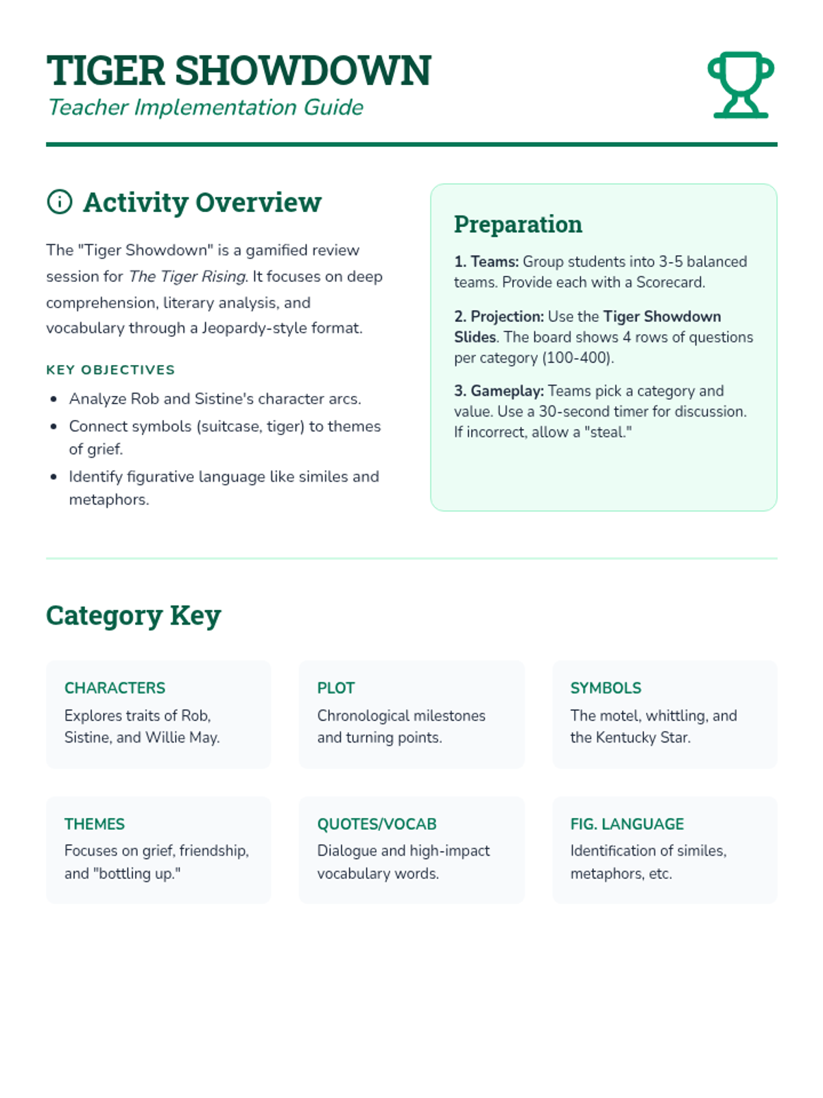 A comprehensive review of the novel 'The Tiger Rising' by Kate DiCamillo, featuring a gamified slide deck and a teacher's guide to reinforce key themes, characters, and plot points.