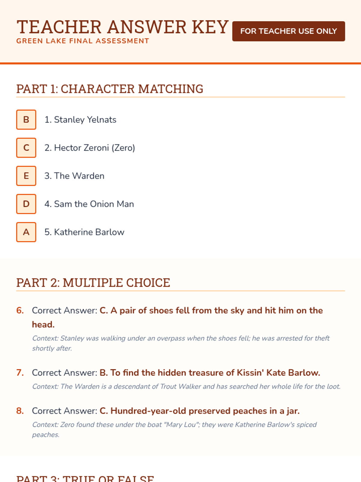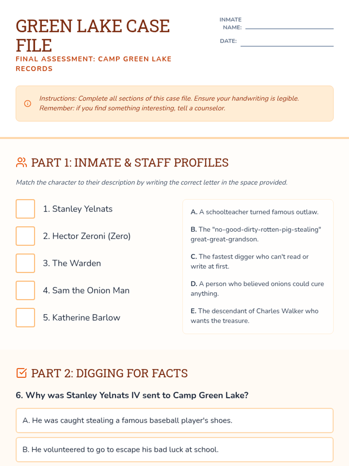 A final assessment and review lesson for the novel Holes by Louis Sachar, focusing on character identification, plot sequencing, and thematic connections. Students will complete a comprehensive test after a visual review of the major story arcs.