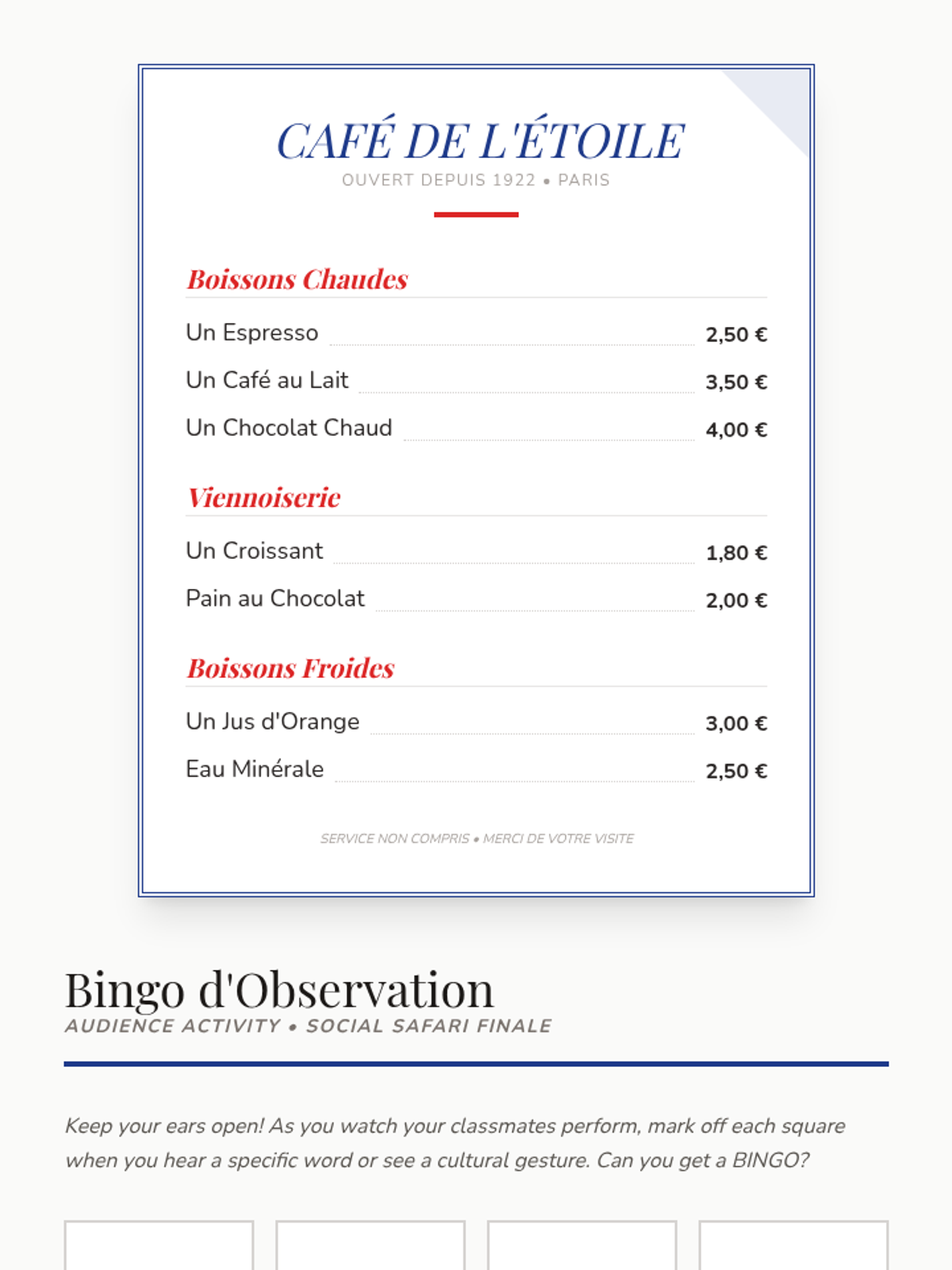The classroom is transformed into a French café where students perform their final simulations. Peers act as the audience, identifying vocabulary and cultural markers used by performers.