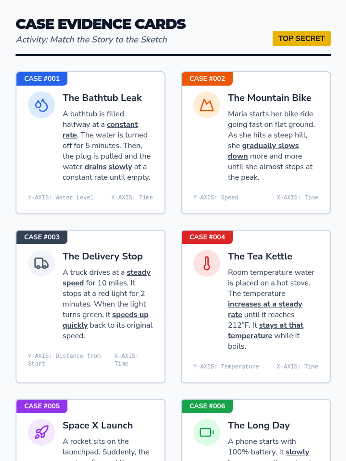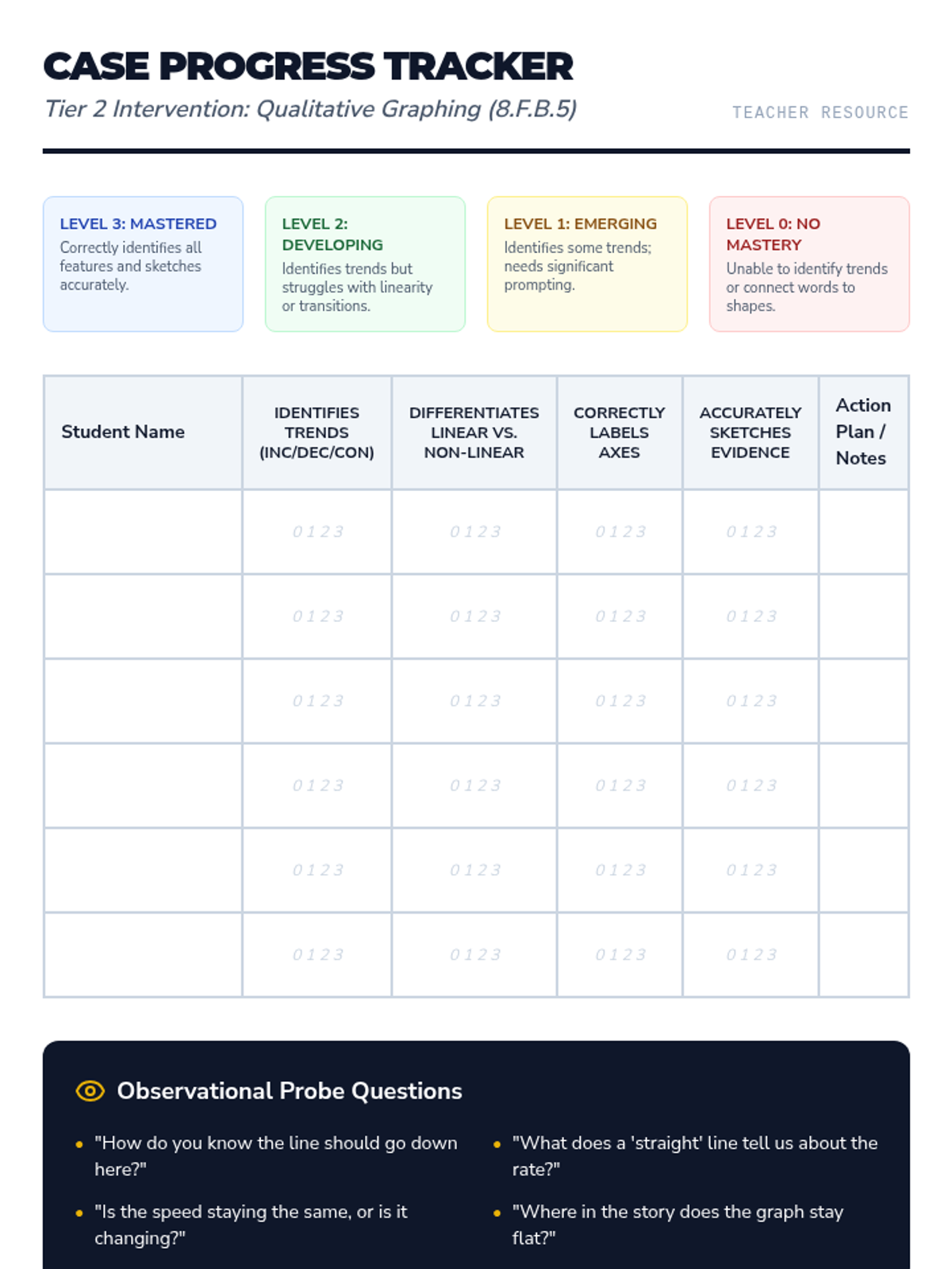 A Tier 2 intervention lesson focusing on interpreting and sketching qualitative graphs from real-world verbal descriptions, aligned with Colorado standard 8.F.B.5.