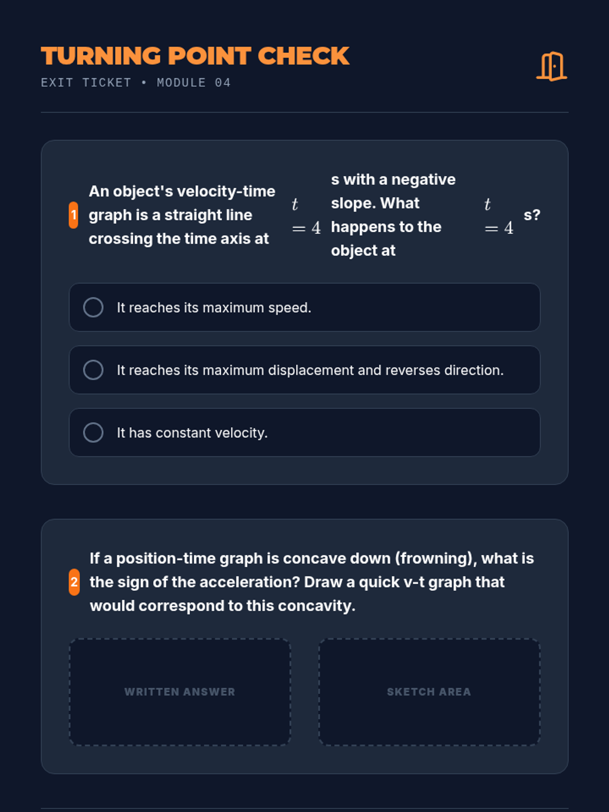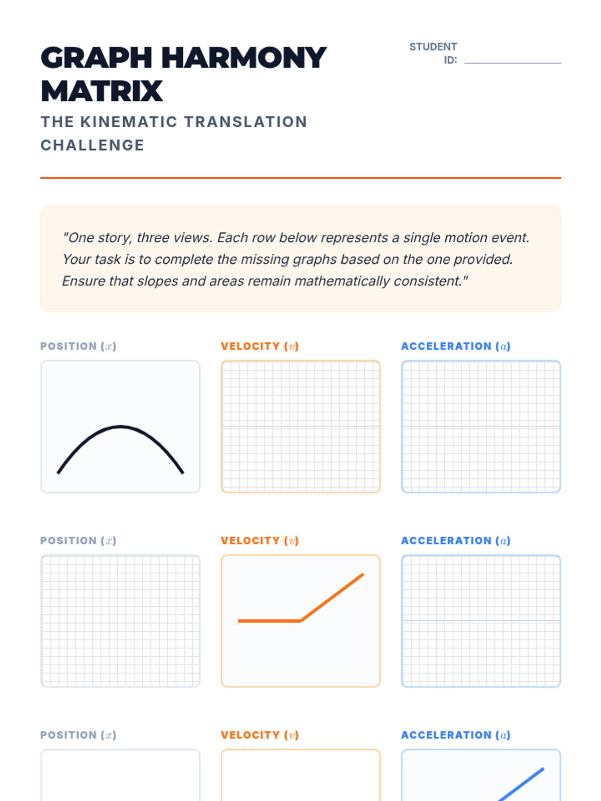 Synthesizes knowledge by requiring students to translate between x-t, v-t, and a-t graphs for the same motion scenario, identifying key points of transition.