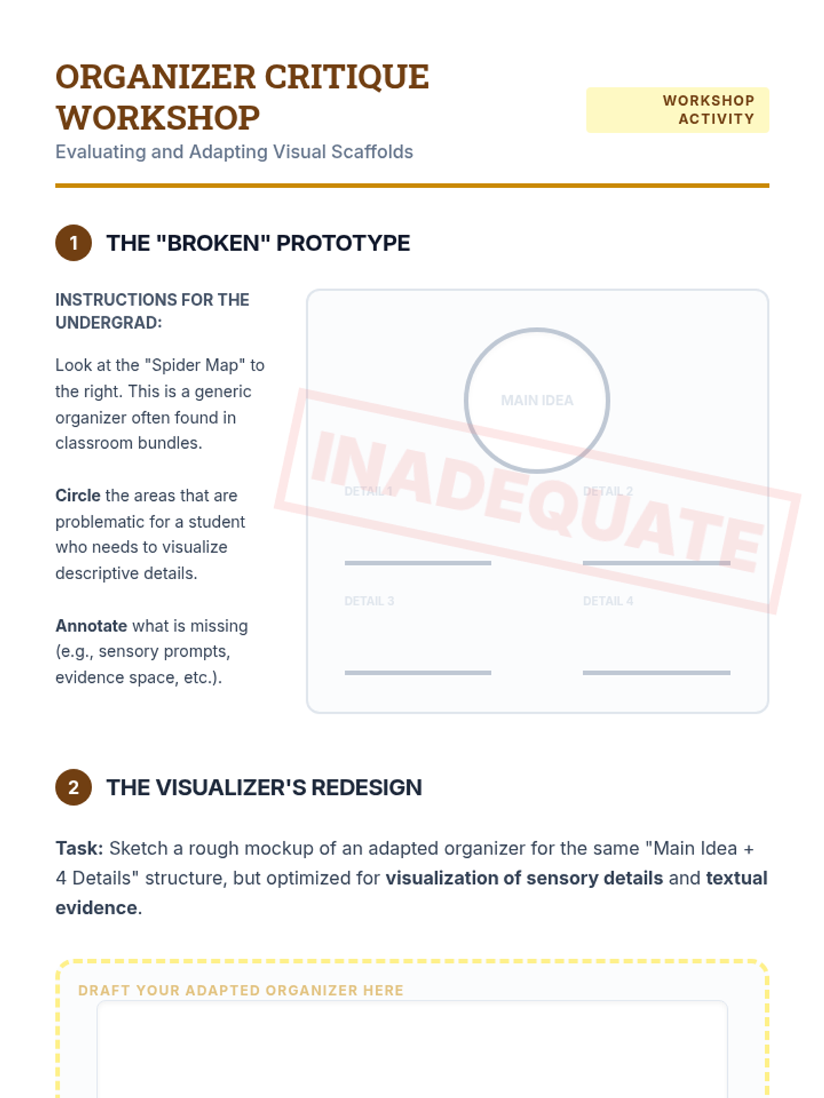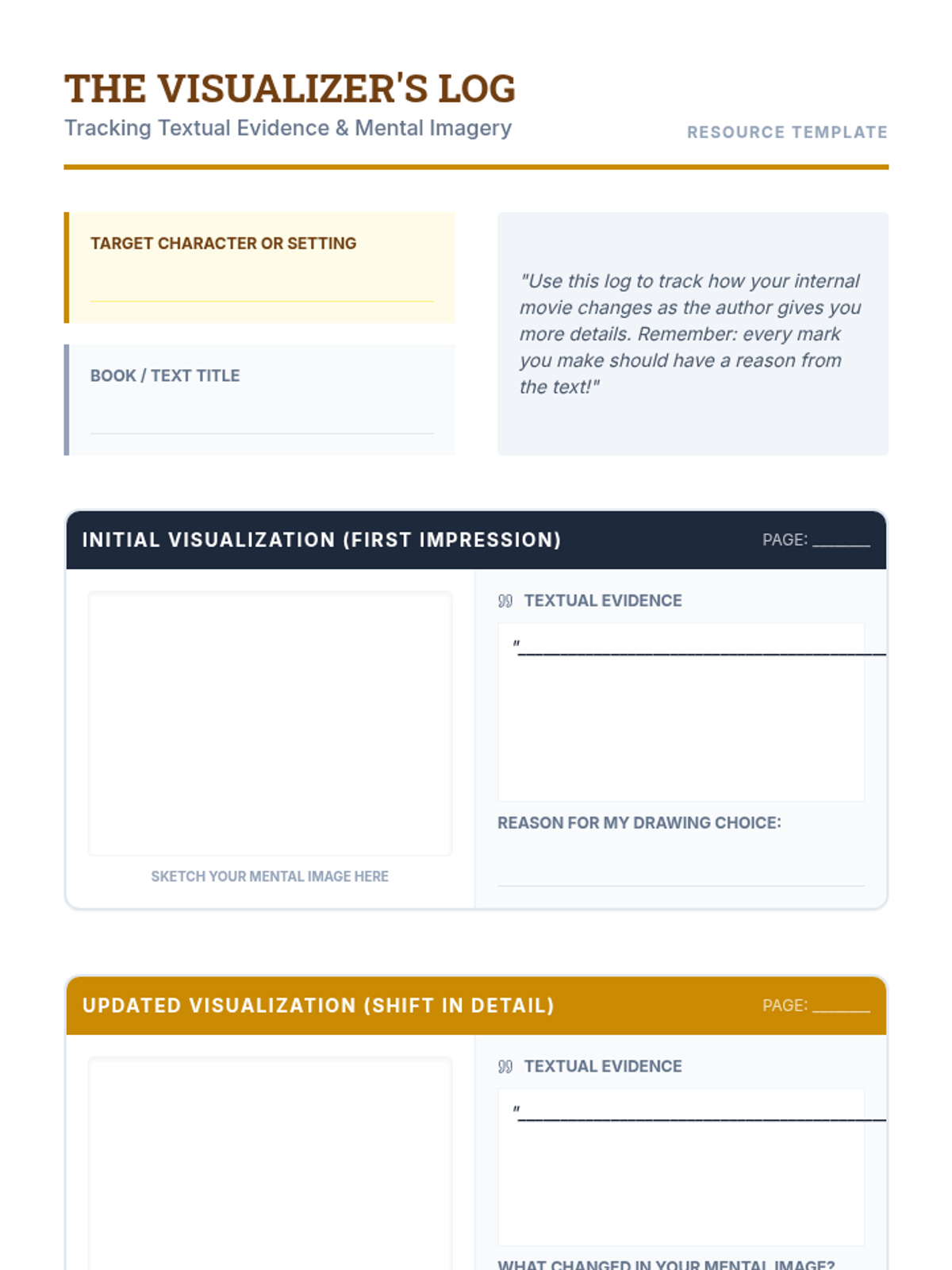 Students evaluate and adapt graphic organizers to support visualization of descriptive details and textual evidence using a 'visualizer's log'.