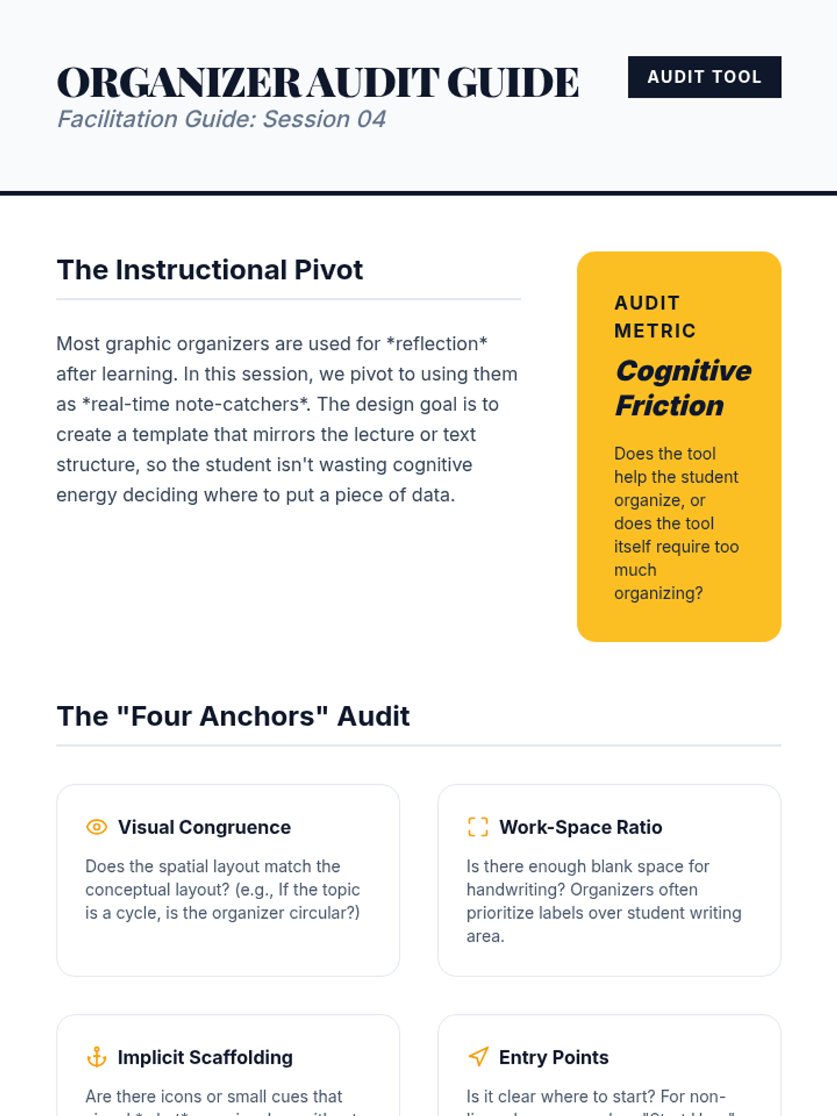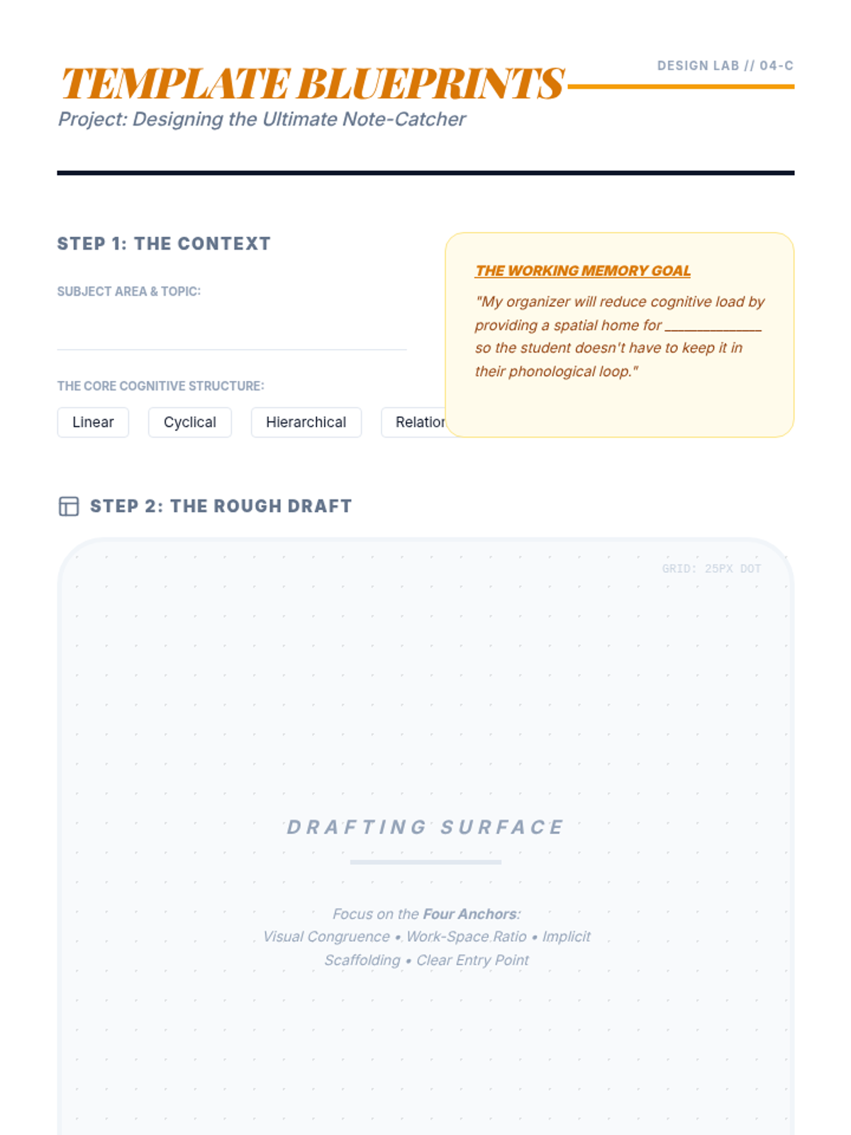 Design specialized graphic organizers that provide spatial scaffolding for real-time information capture in various academic subjects.