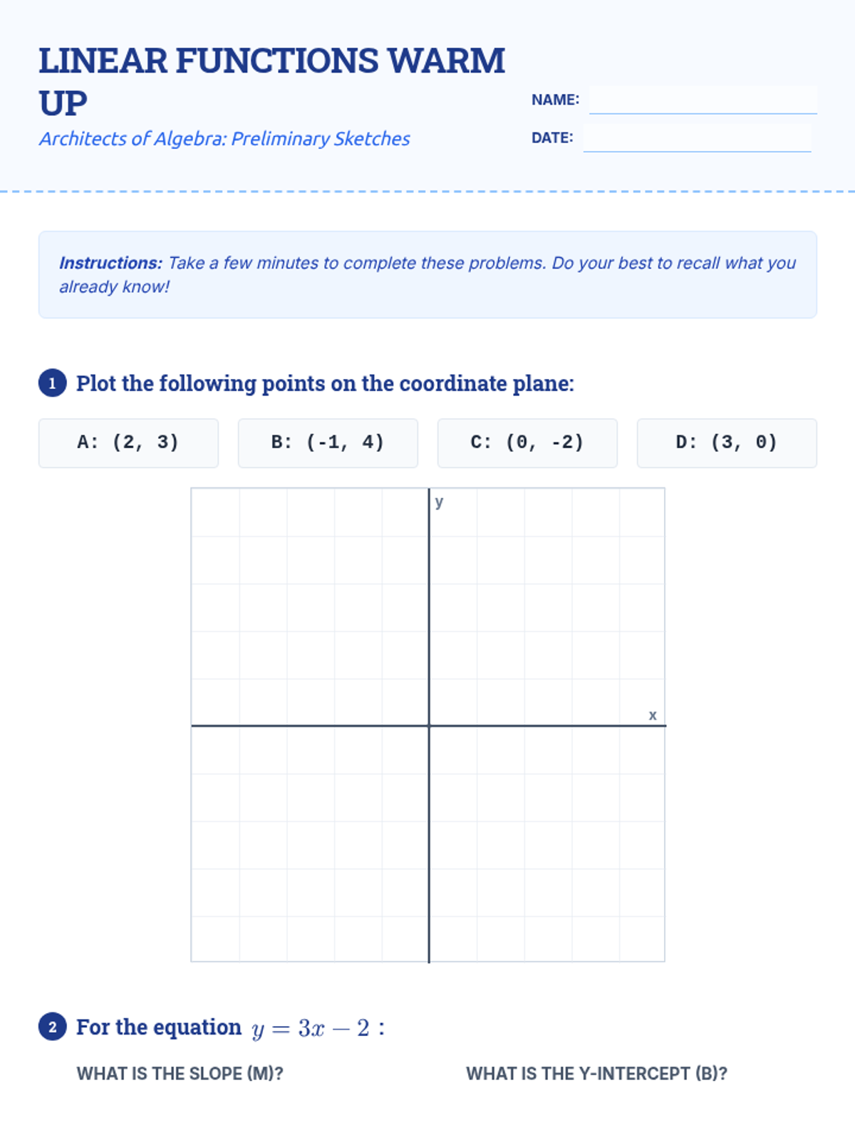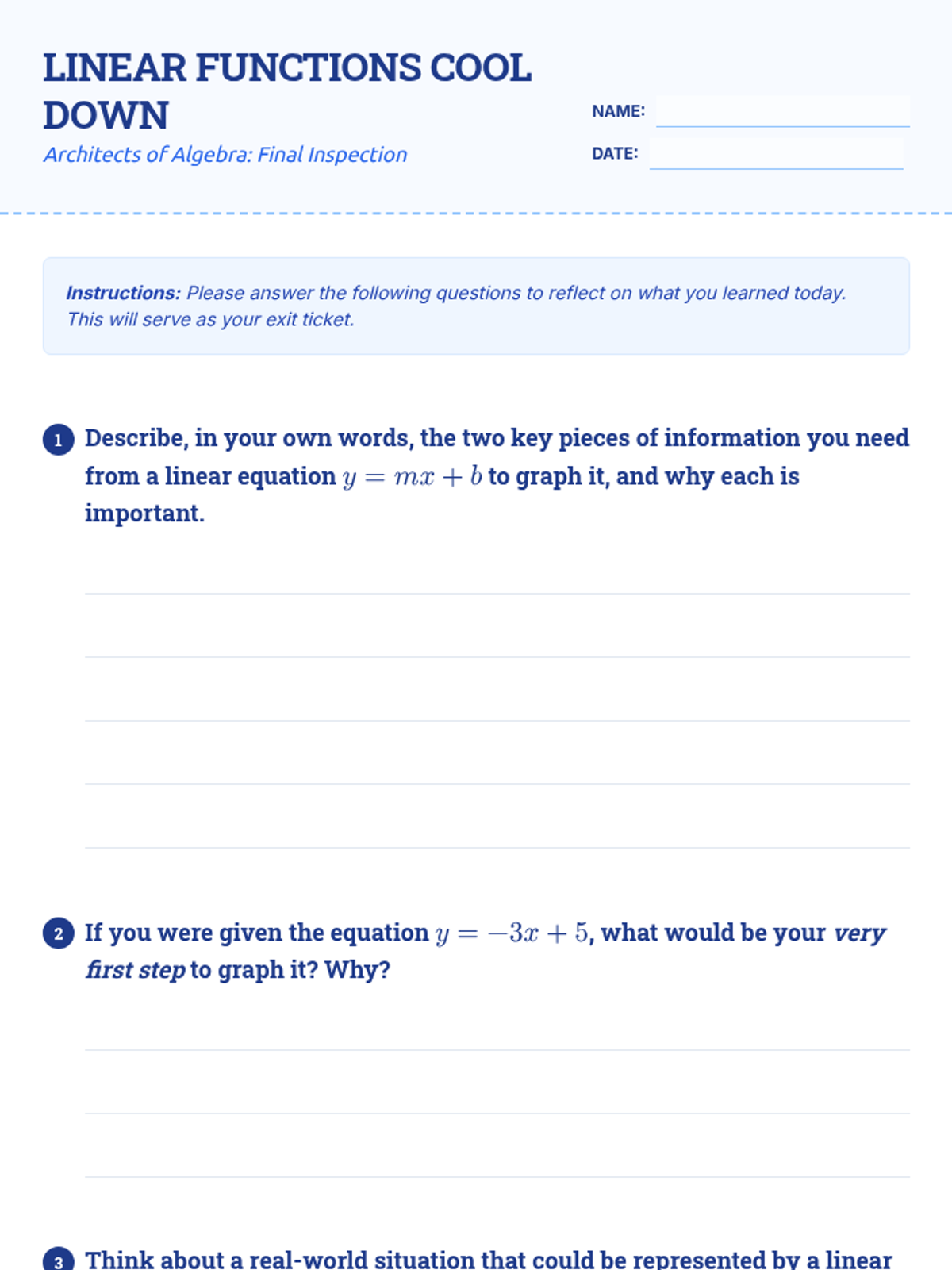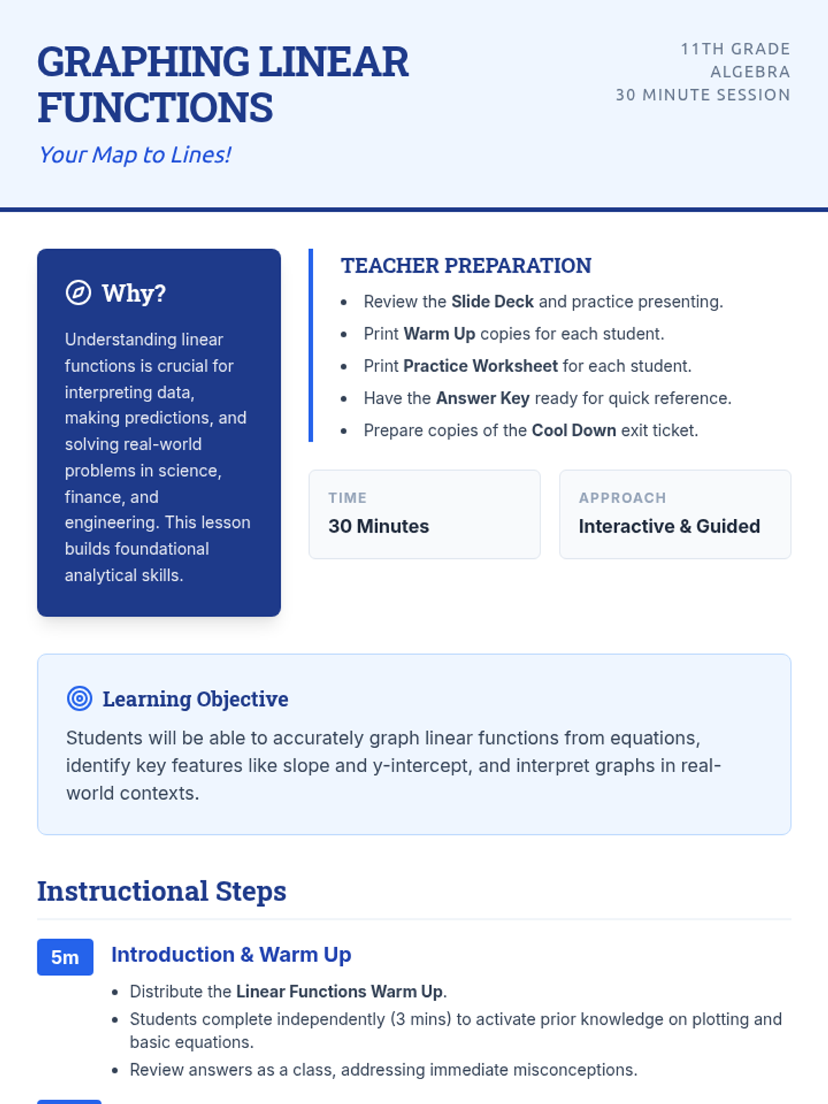 This lesson introduces 11th-grade students to graphing linear functions, identifying key features like slope and y-intercept, and interpreting graphs in real-world contexts.