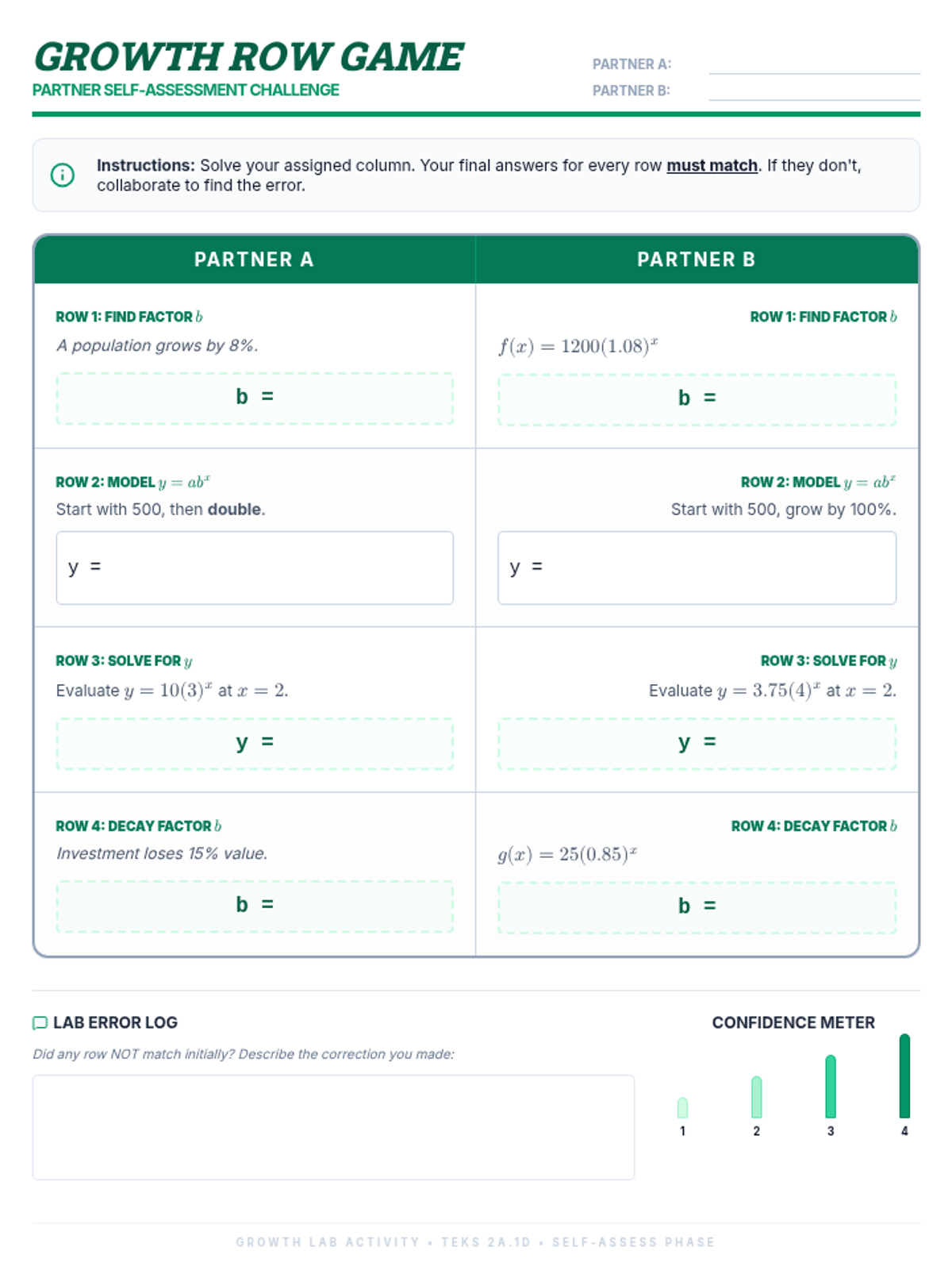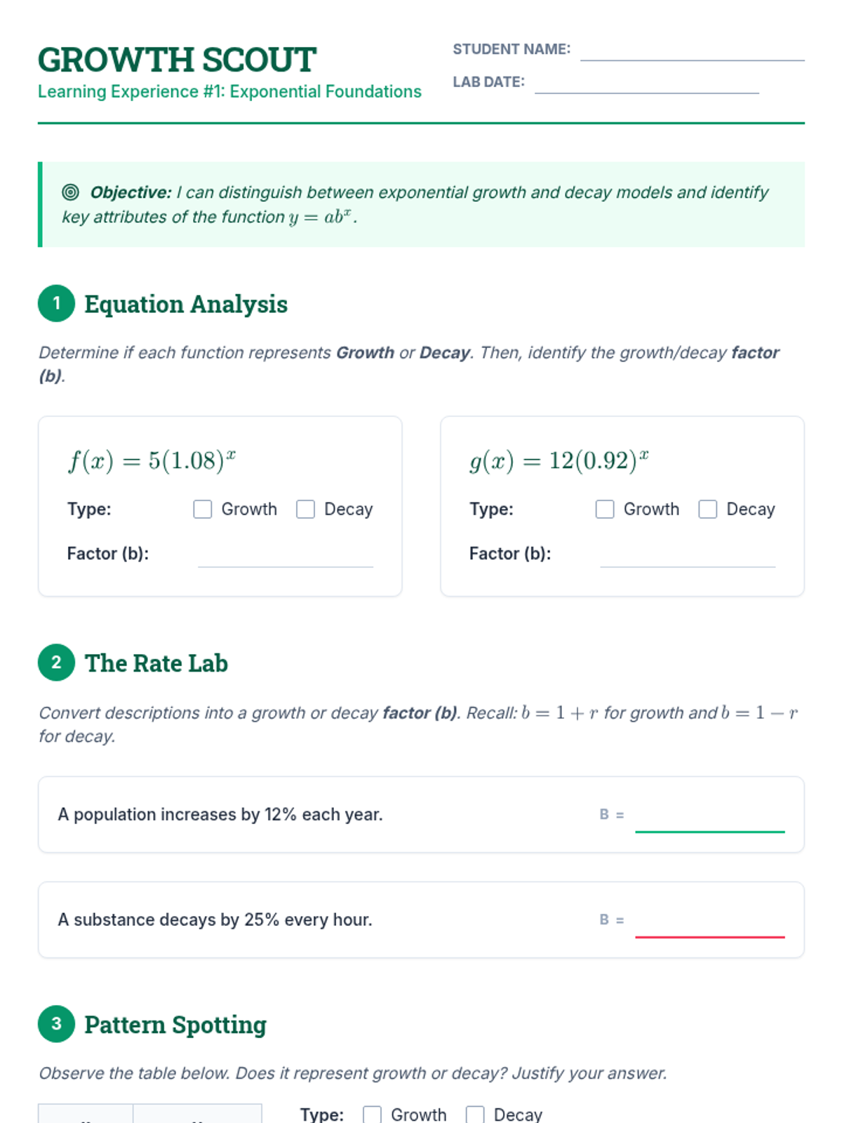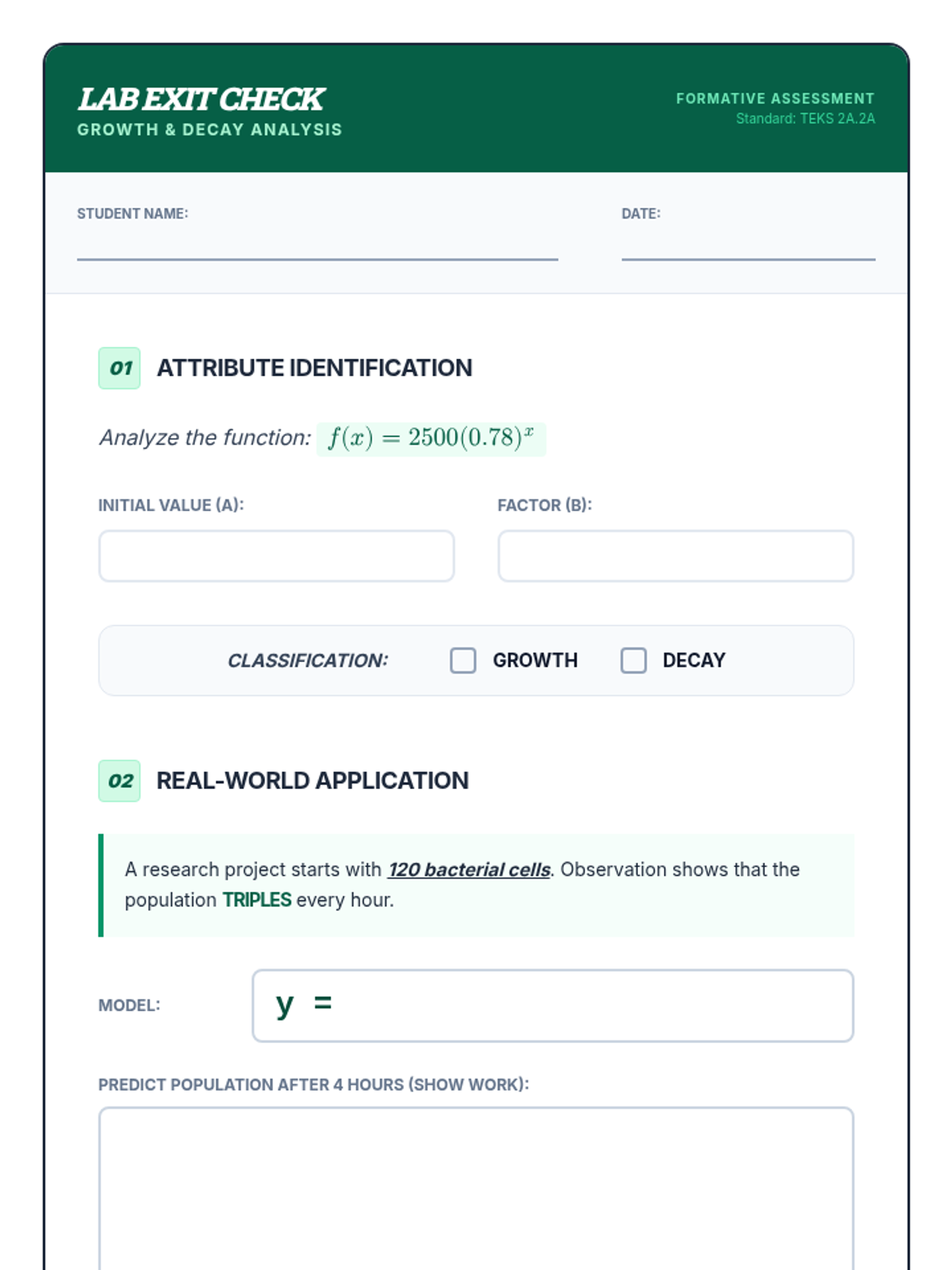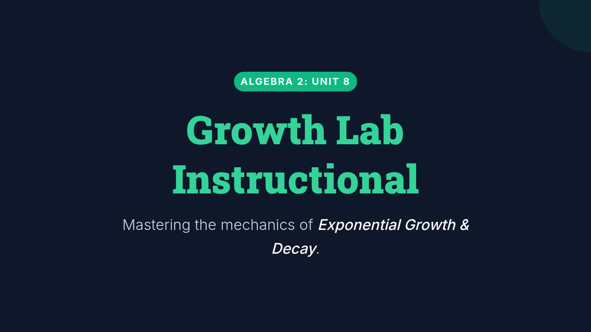 This lesson introduces exponential growth and decay functions, focusing on modeling real-life situations, identifying growth and decay factors, and analyzing key attributes of exponential models. Students will transition from Algebra 1 foundations to advanced Algebra 2 applications using the standard model \(y = ab^x\).