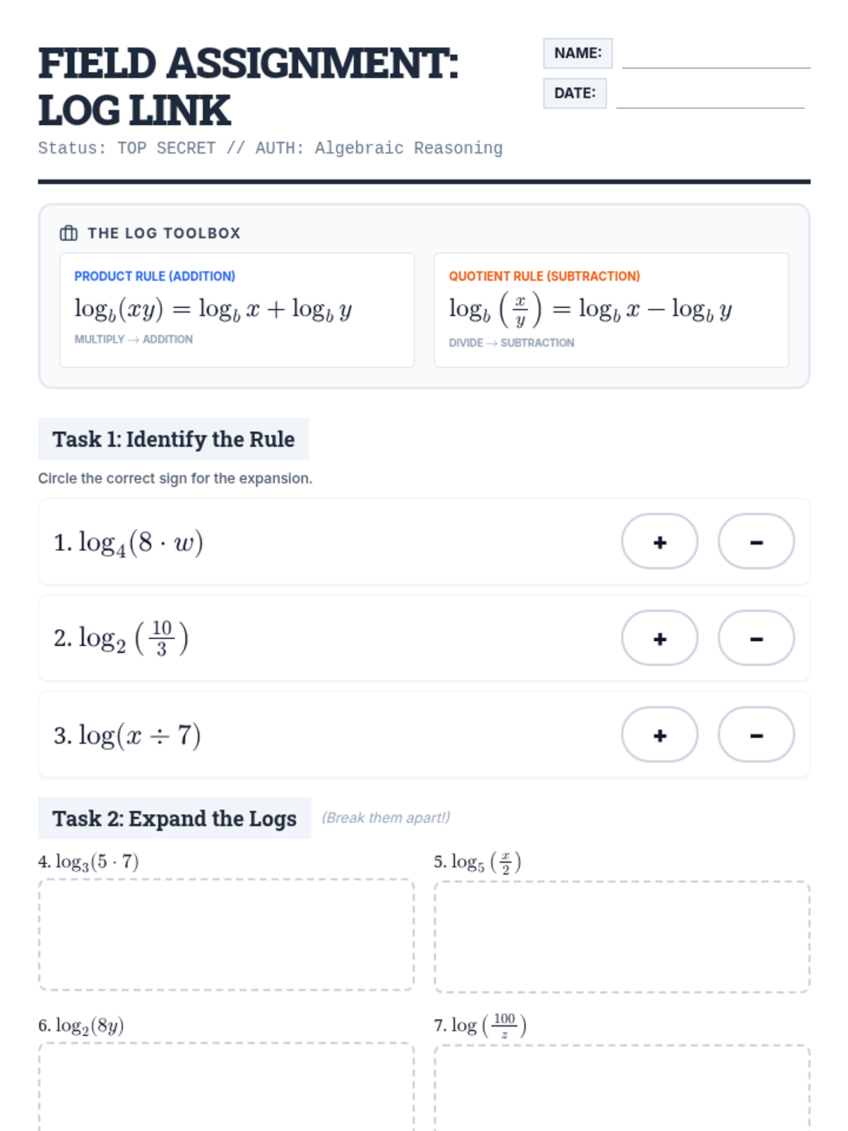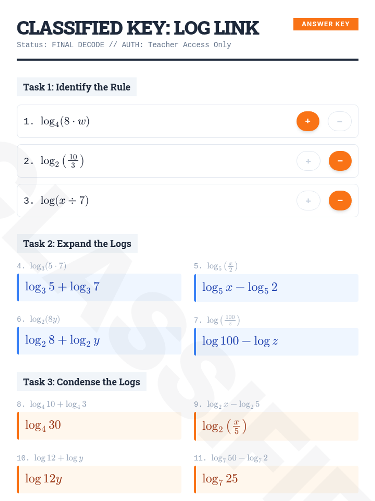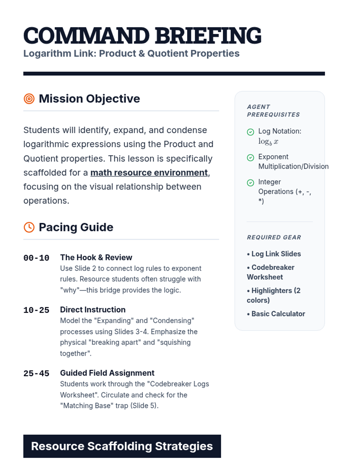 A lesson focused on the product and quotient properties of logarithms, specifically adding and subtracting logs. Designed with heavy scaffolding for a math resource setting.