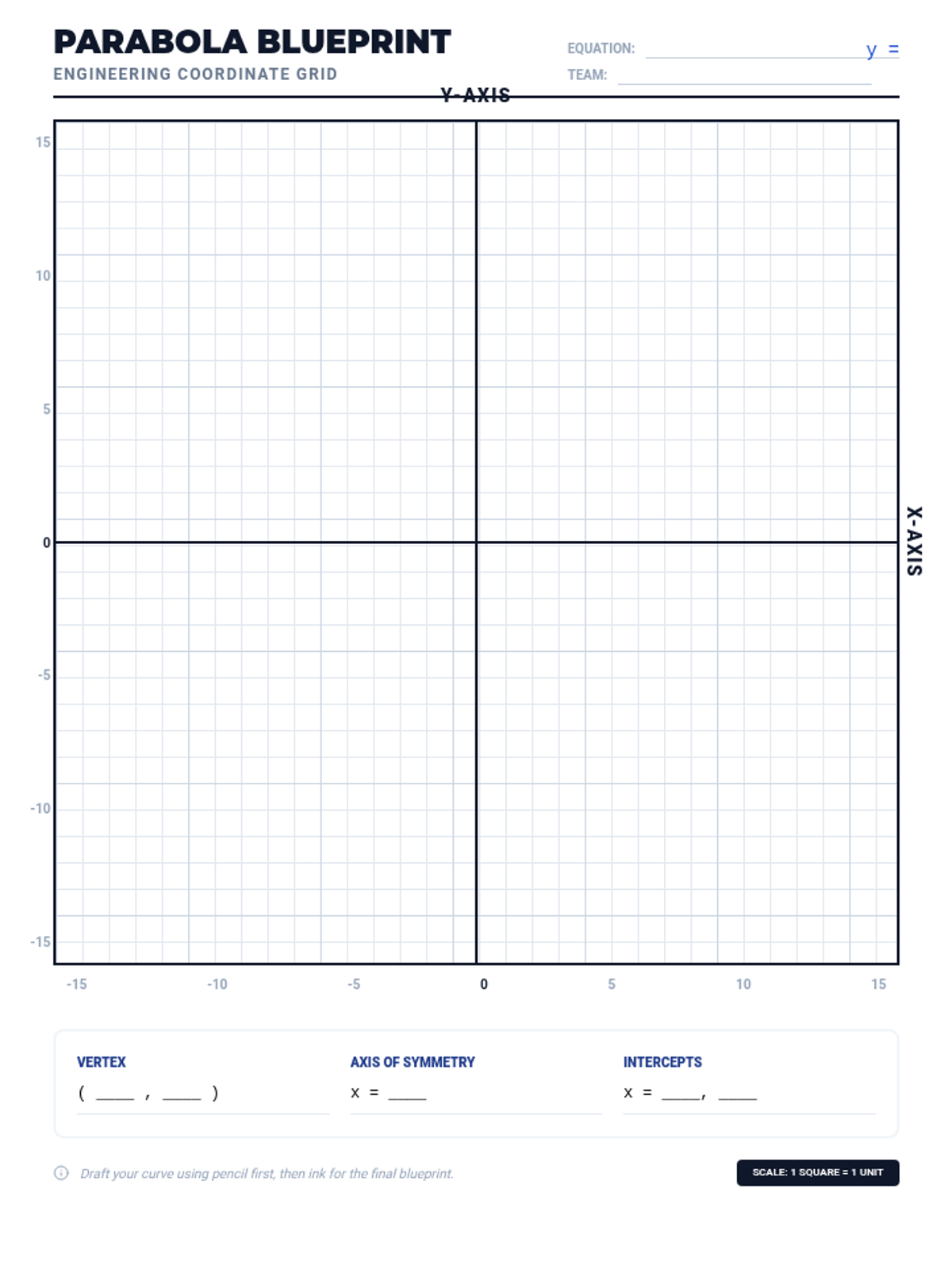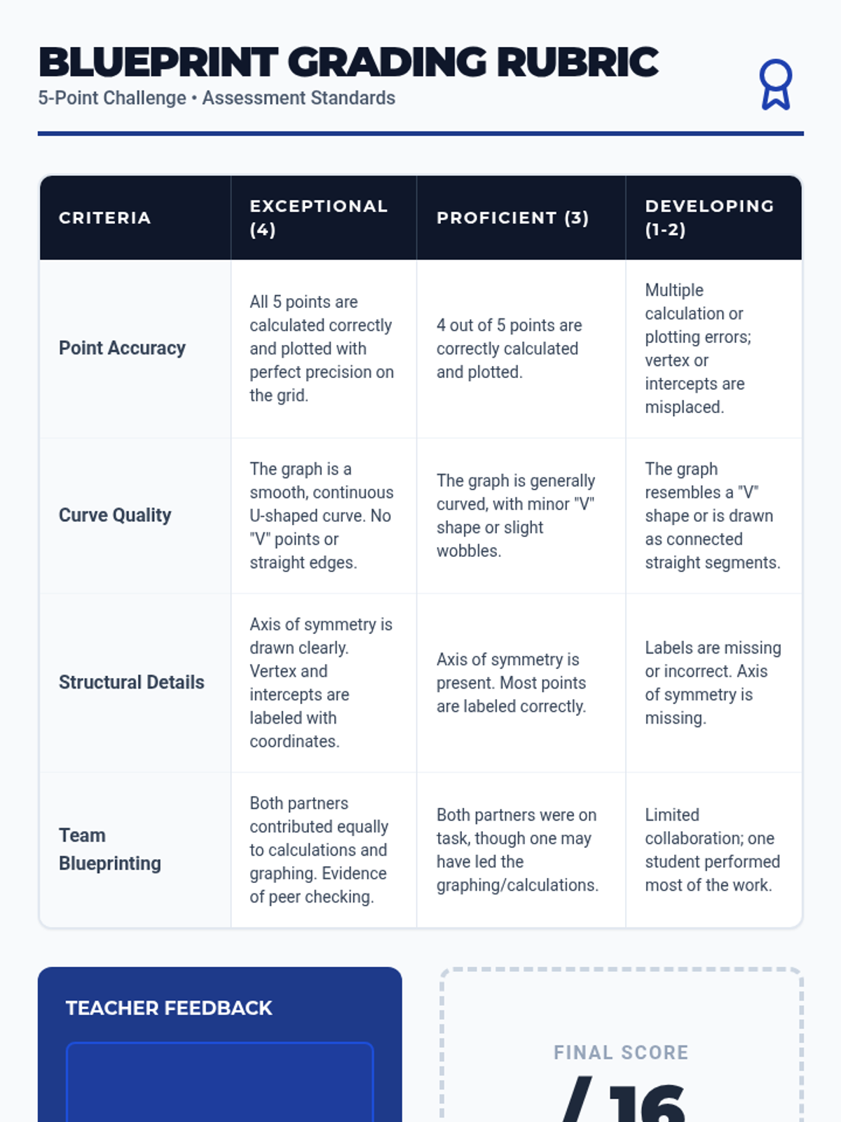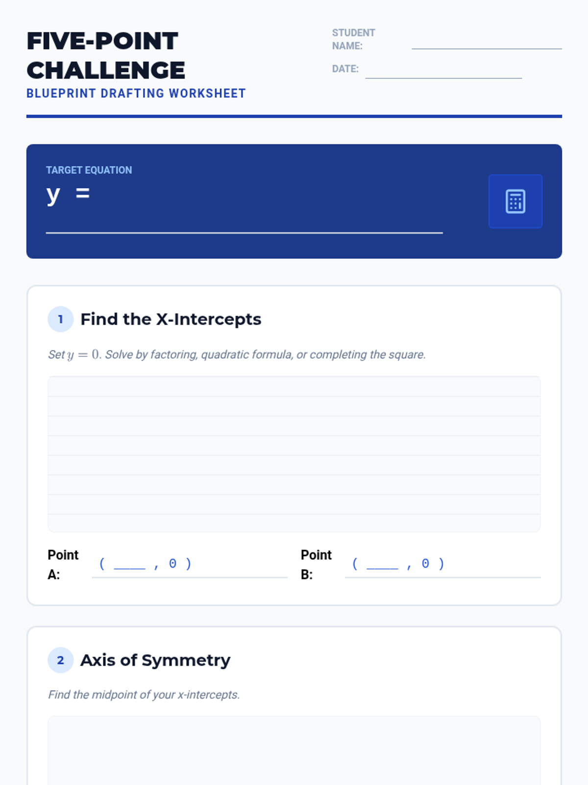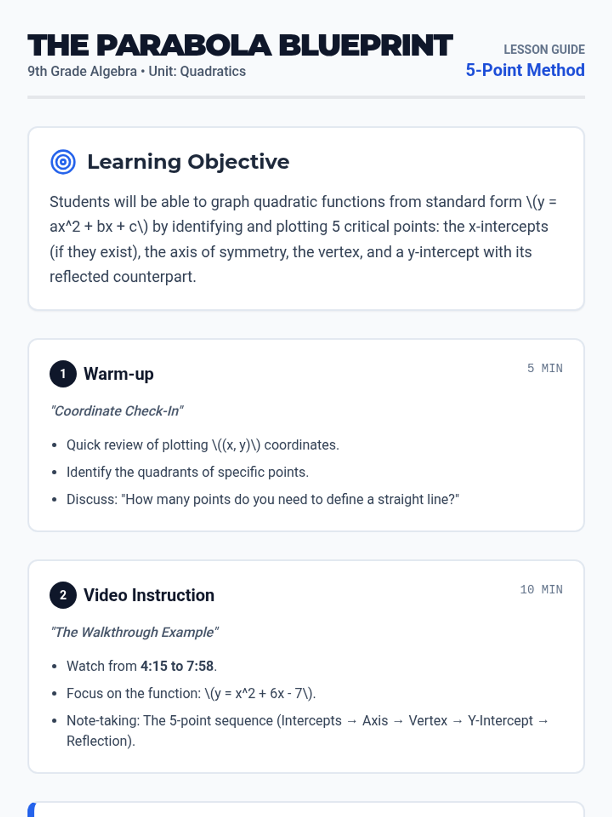 A comprehensive lesson on graphing quadratic functions from standard form using a precise 5-point method. Students learn to calculate intercepts, the axis of symmetry, and the vertex to create accurate parabolic curves.