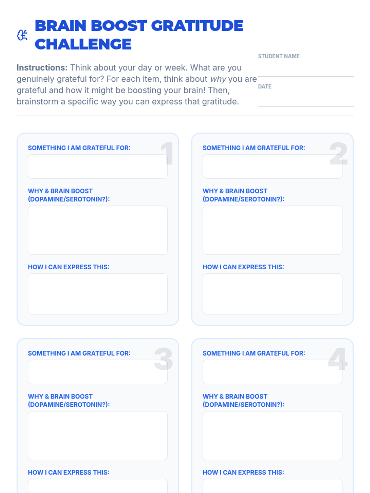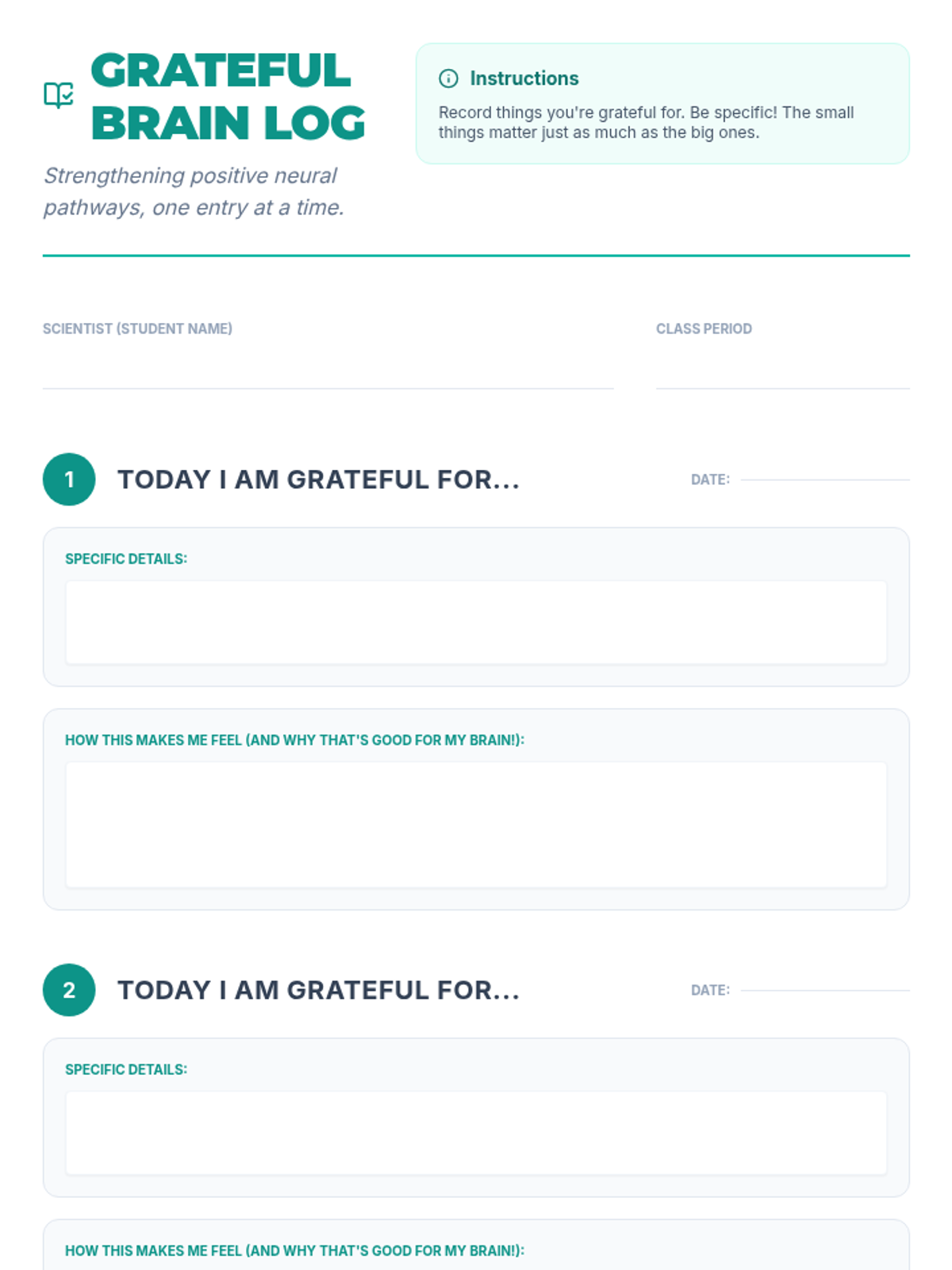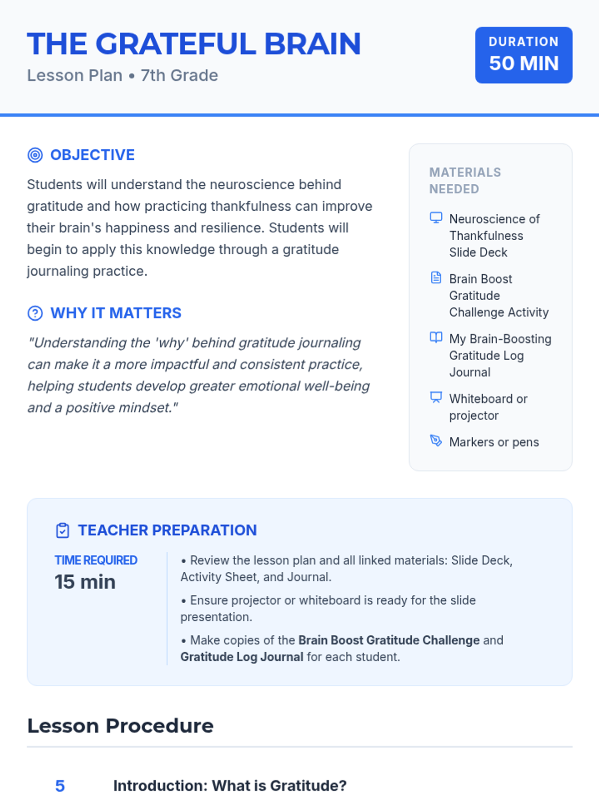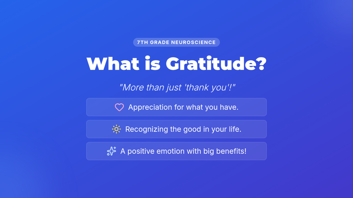 A 50-minute lesson for 7th graders exploring the neuroscience of gratitude, focusing on dopamine, serotonin, and the prefrontal cortex to show how thankfulness rewires the brain.