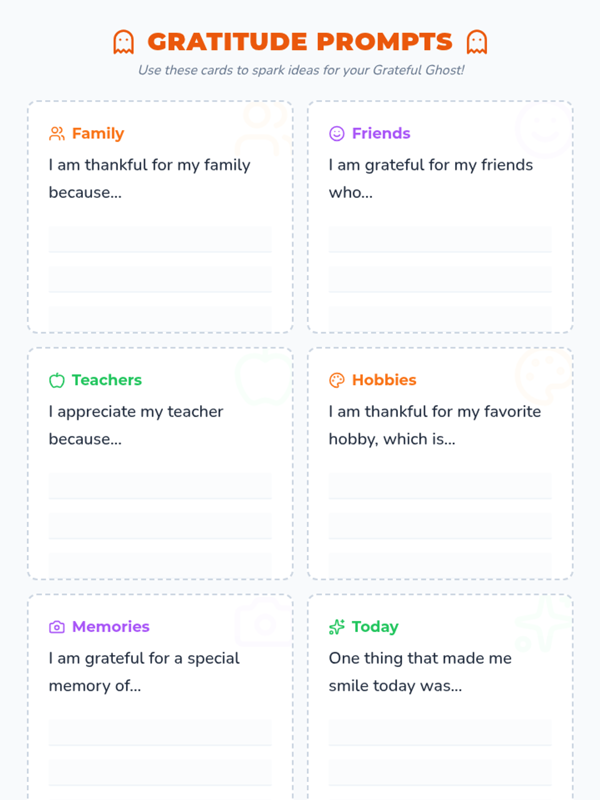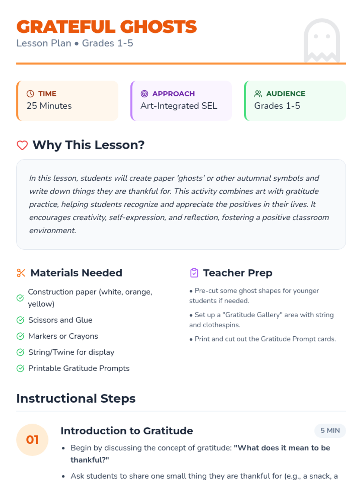 Students create paper 'ghosts' or autumnal symbols to express gratitude. This creative lesson combines art with social-emotional learning to foster a positive classroom environment.