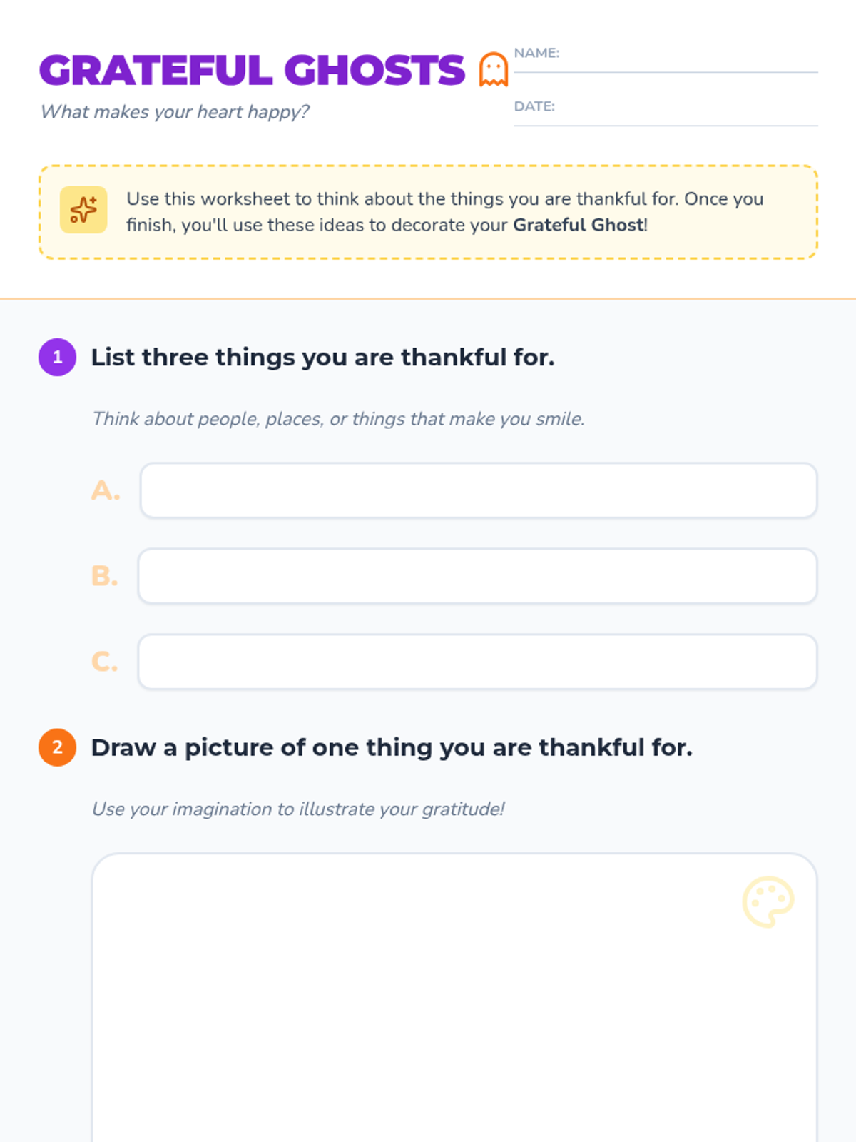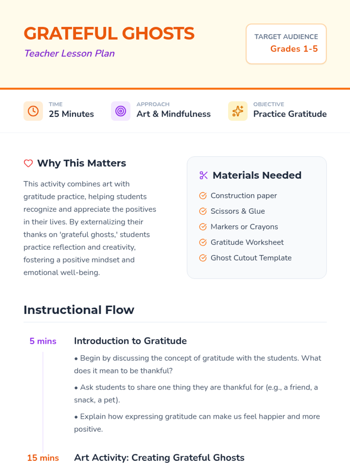 A creative art and mindfulness lesson where students express gratitude by creating paper 'grateful ghosts' and autumnal symbols, fostering a positive classroom environment.