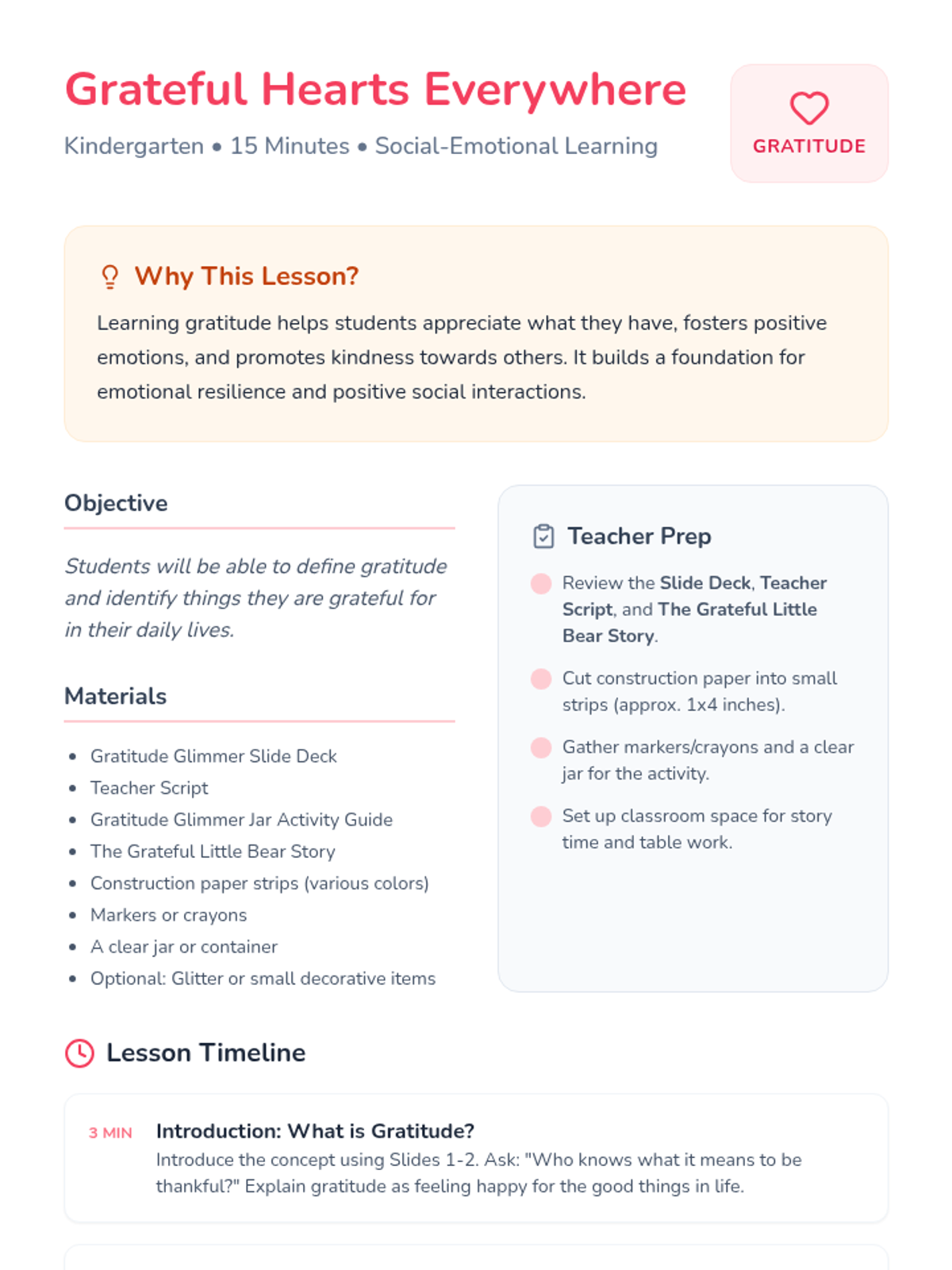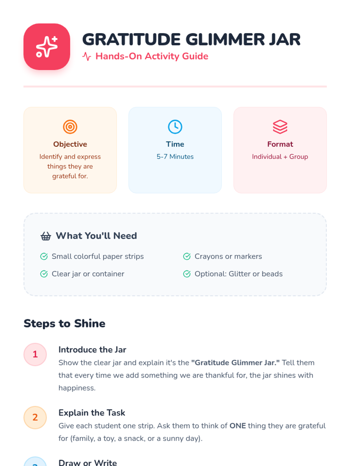 A 15-minute lesson for Kindergarteners to learn about gratitude through storytelling and a hands-on activity. Students will explore what it means to be thankful and create a classroom 'Gratitude Glimmer Jar'.