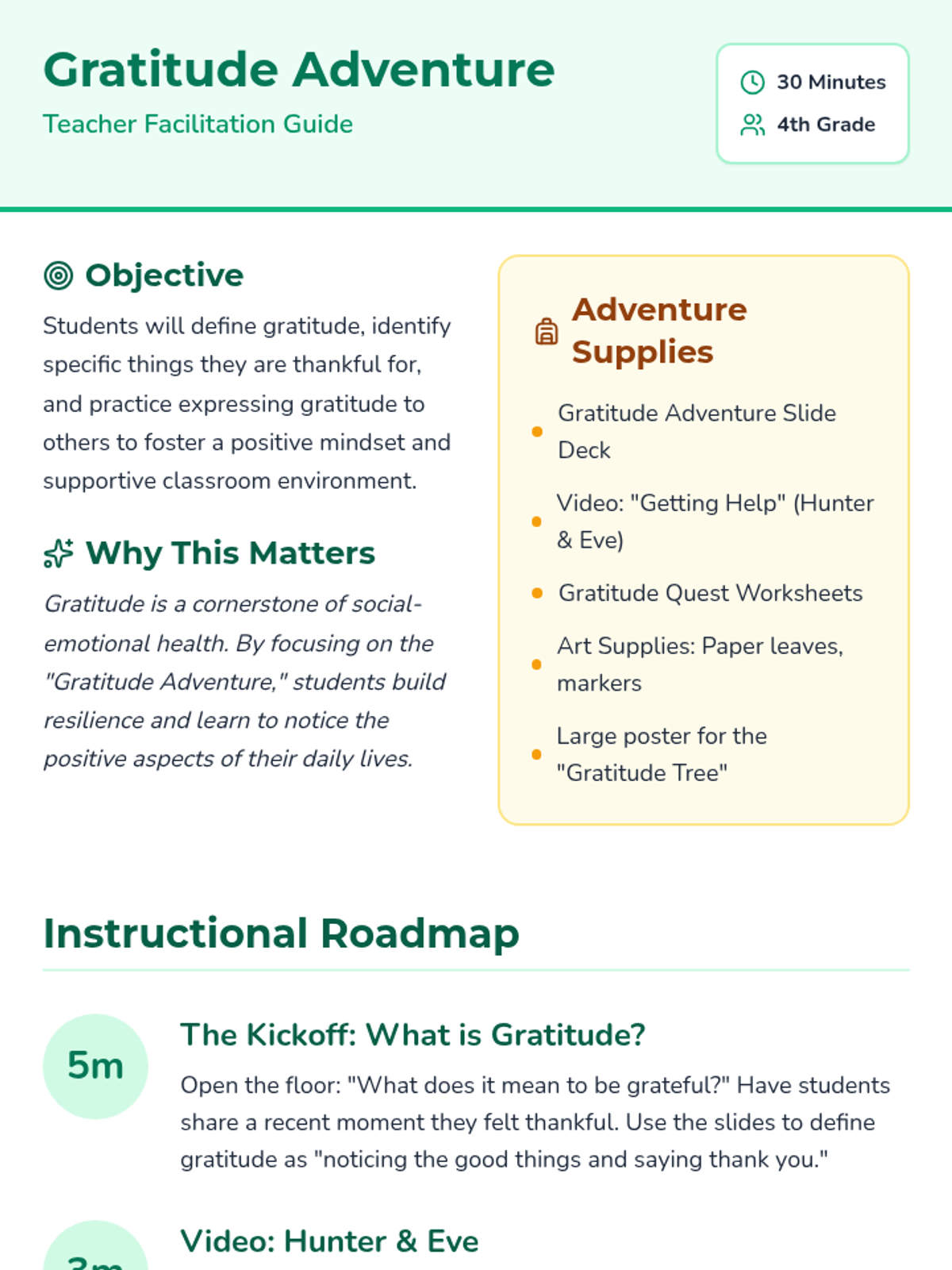A 30-minute experiential lesson for 4th graders exploring gratitude through a "Gratitude Tree" activity, a resilience video, and personal reflection. Students will learn to identify and express thanks in their daily lives to build a positive classroom culture.