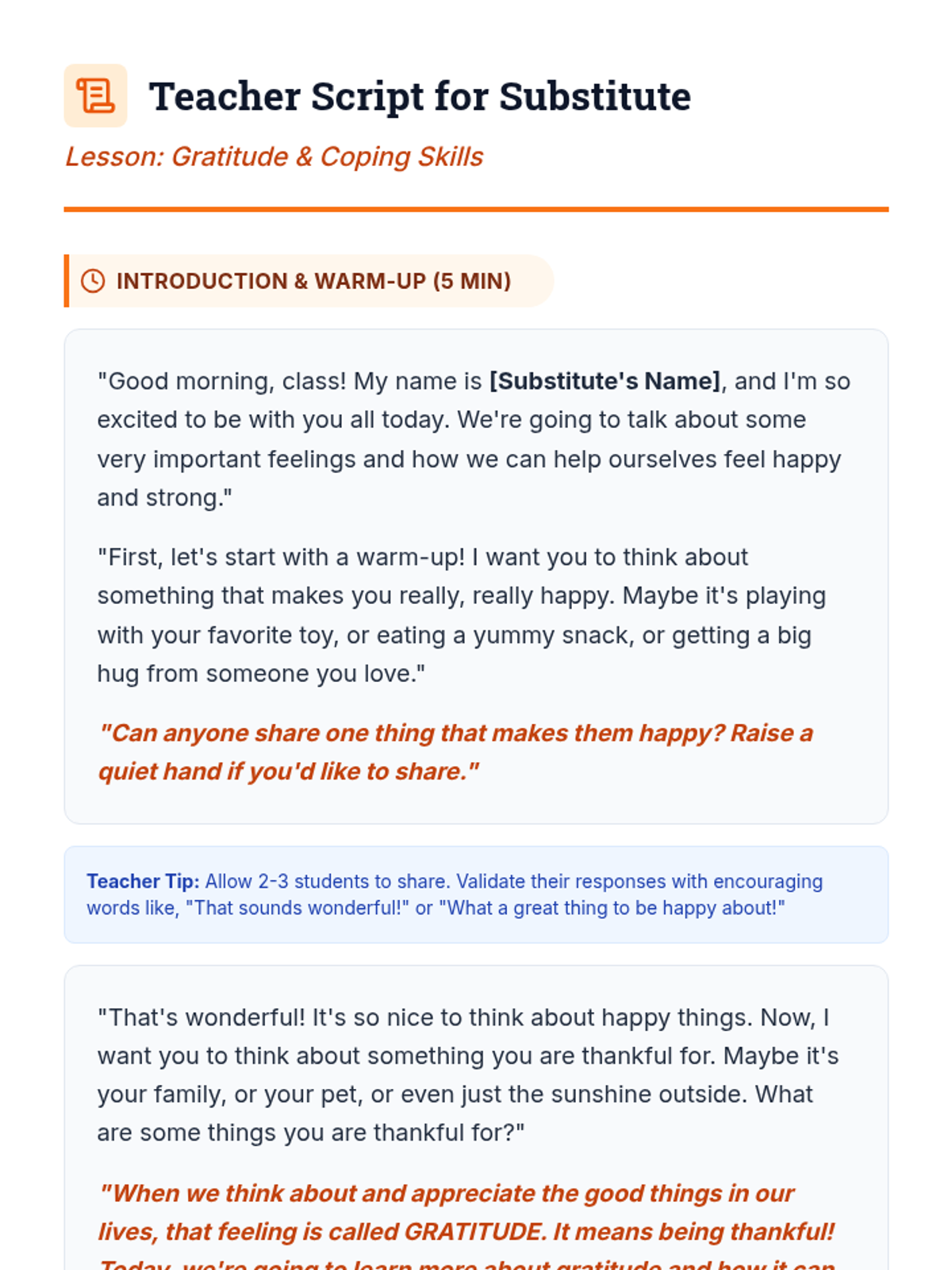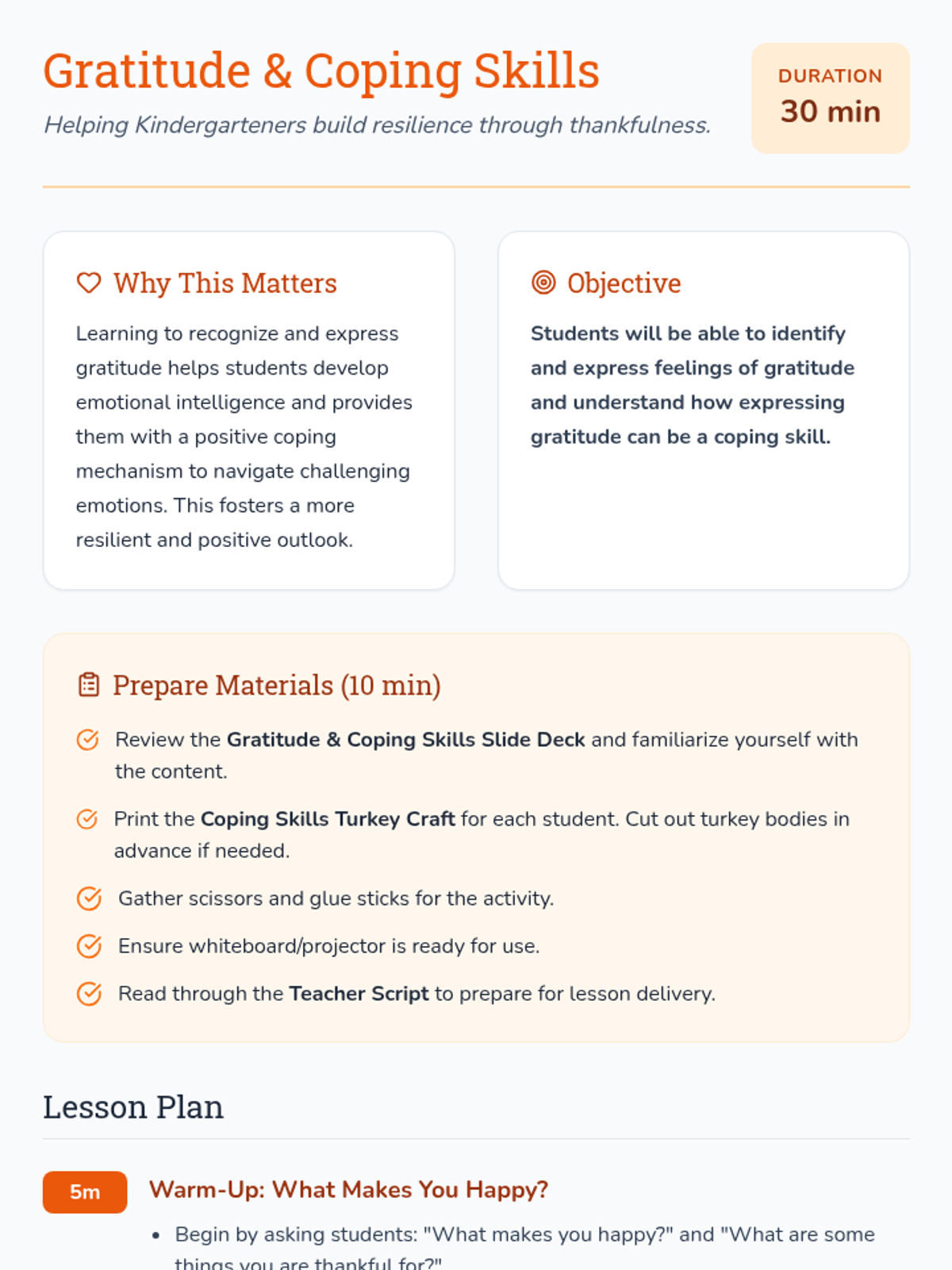 A 30-minute Kindergarten lesson helping students understand gratitude as a coping skill through a hands-on turkey craft activity.