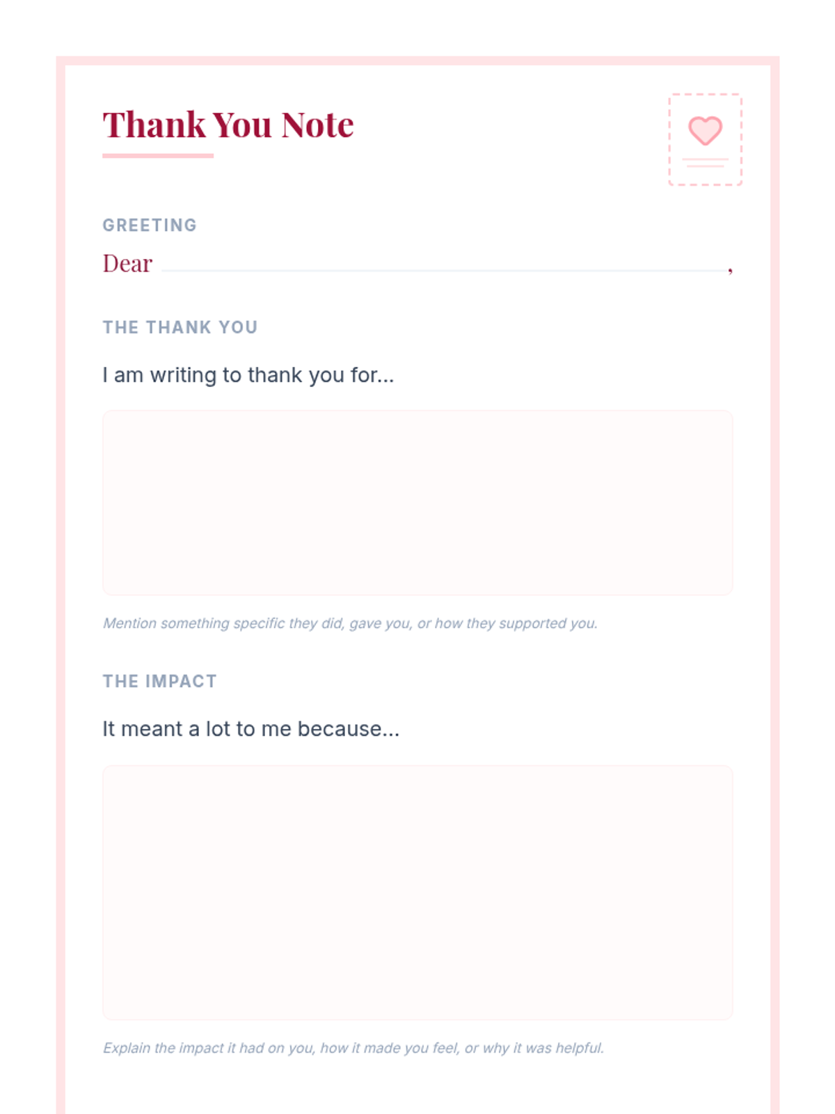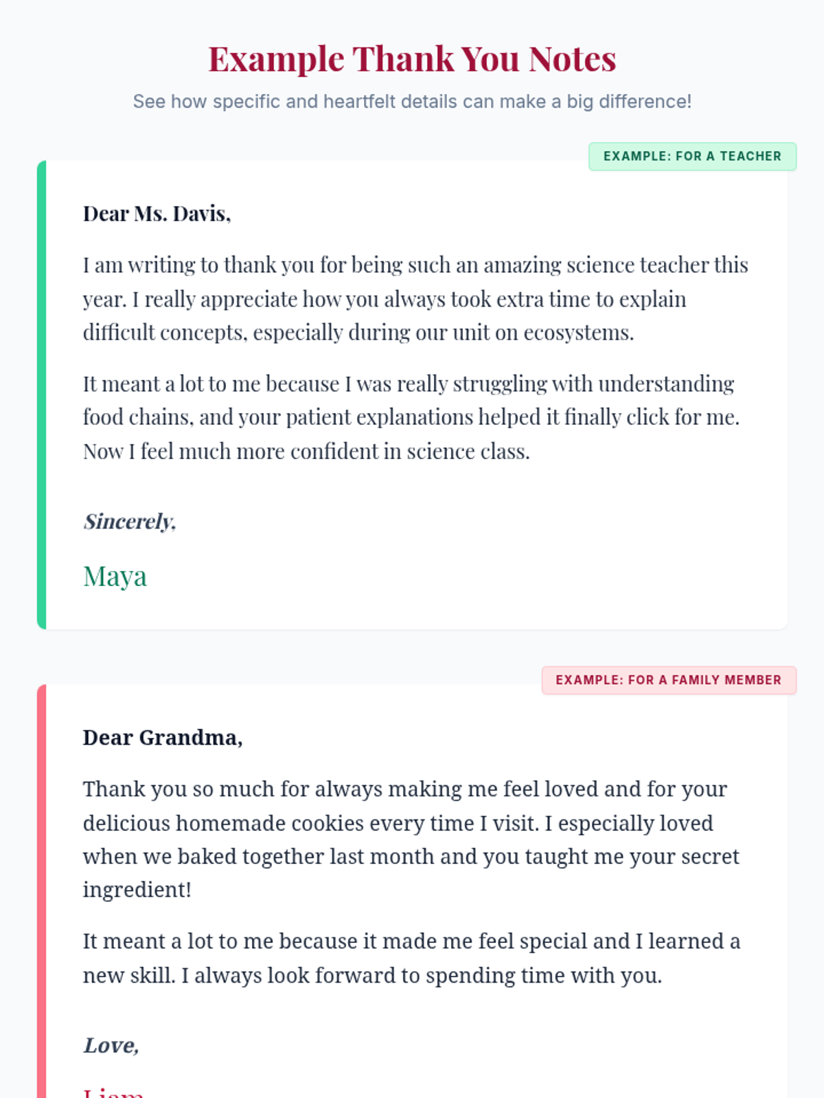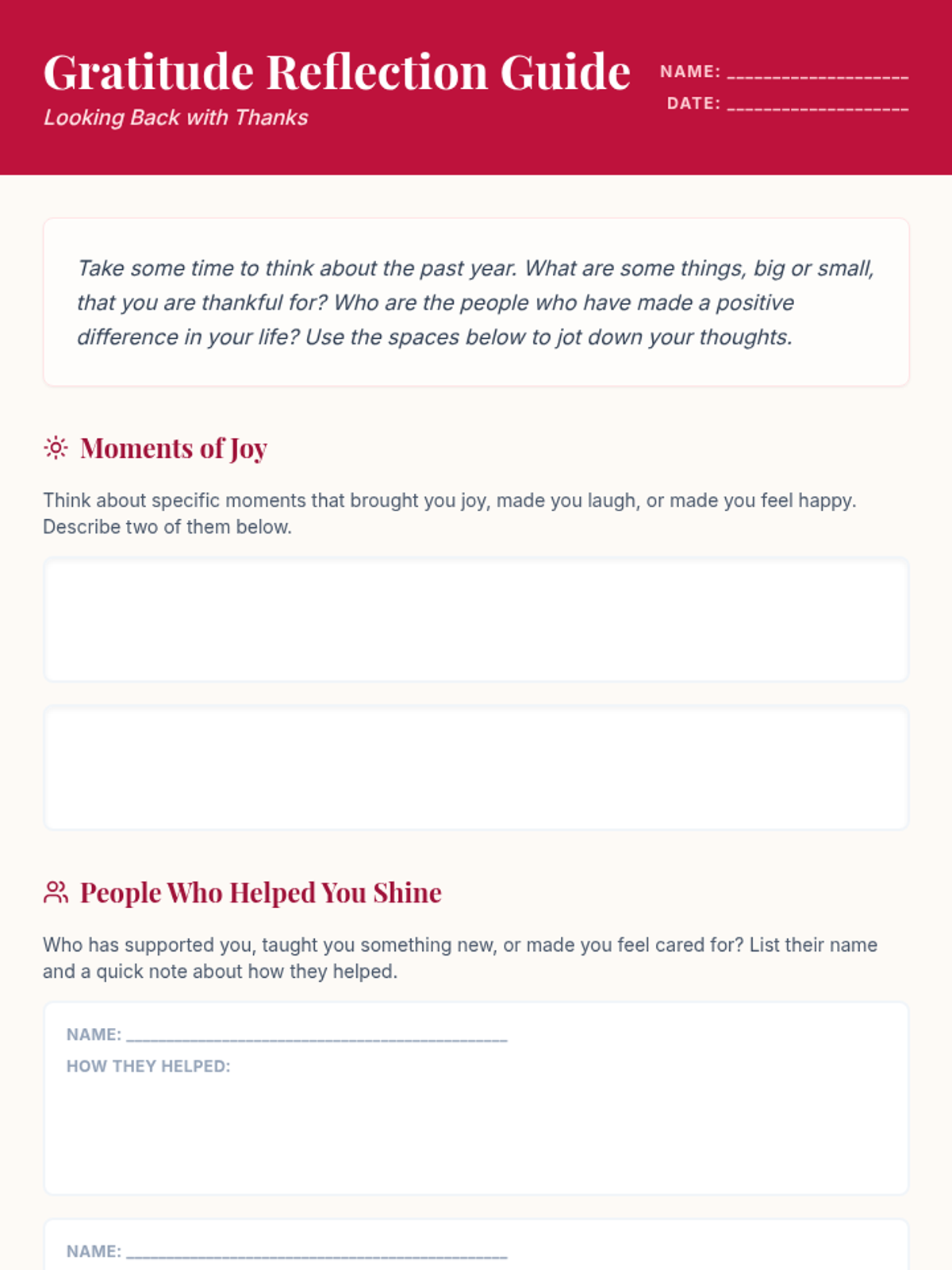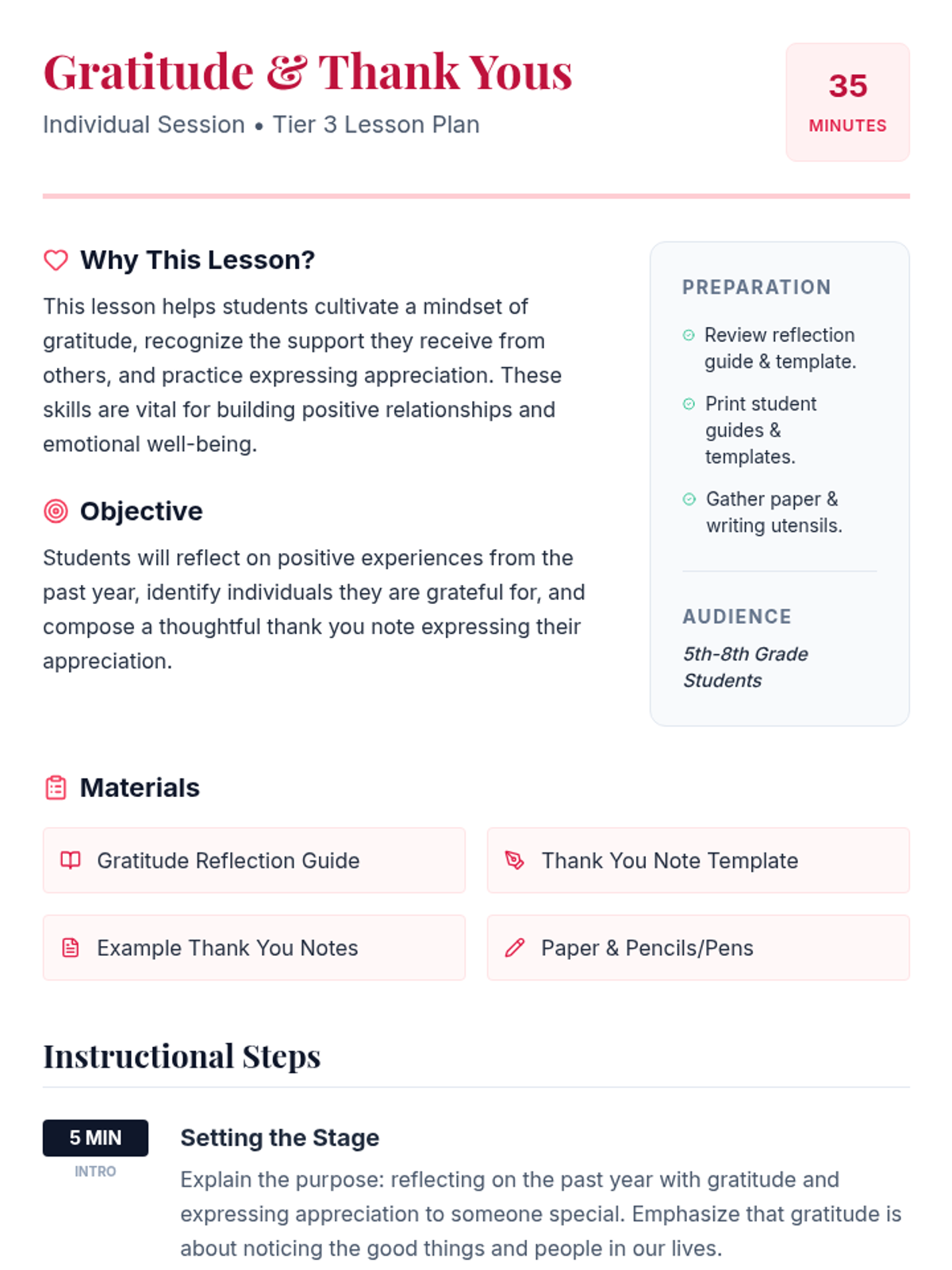 A 35-minute individual session for 5th-8th graders focusing on reflection and expressing appreciation through thank you notes. Students identify positive experiences and individuals who supported them, then craft a heartfelt message of thanks.