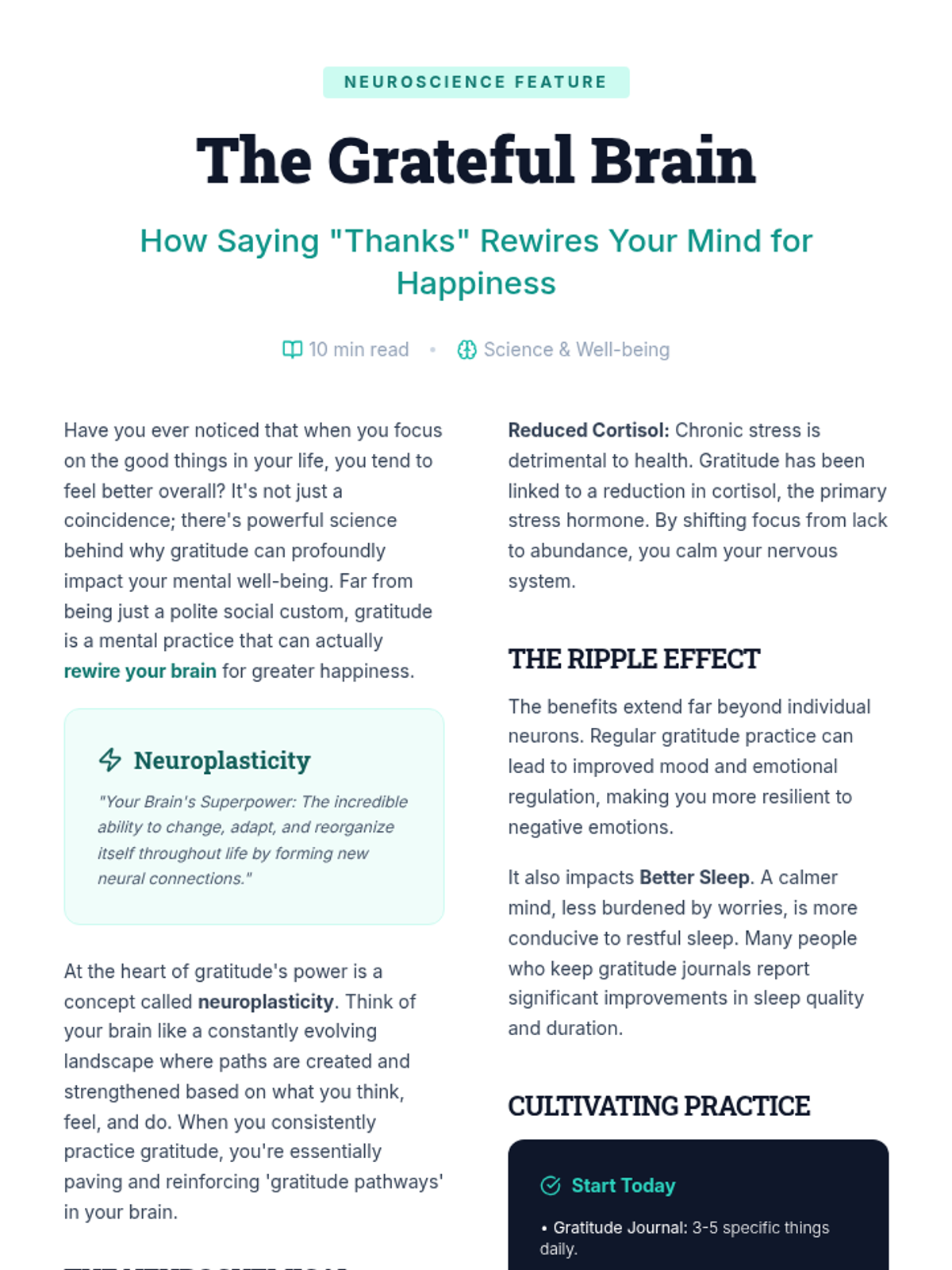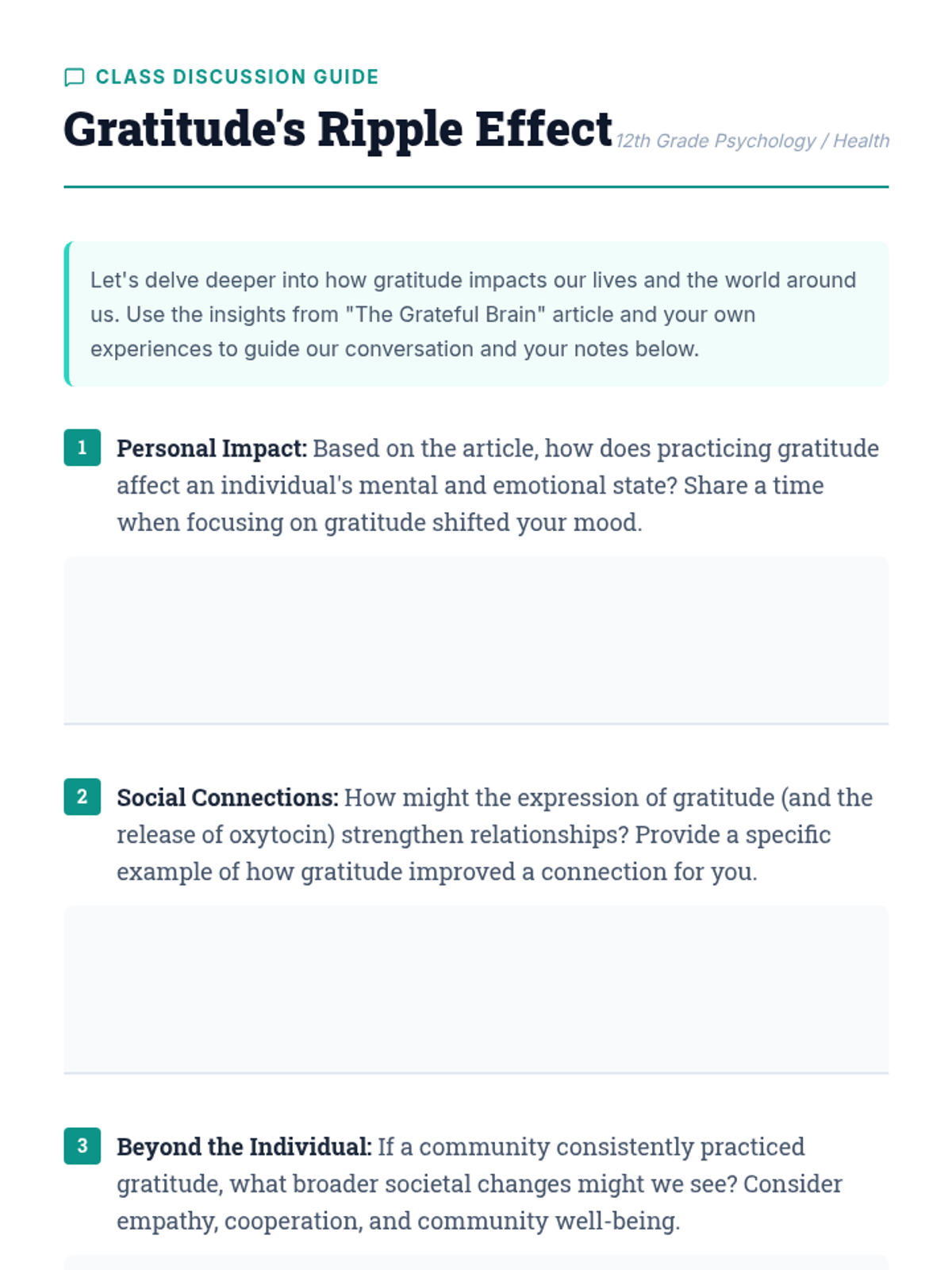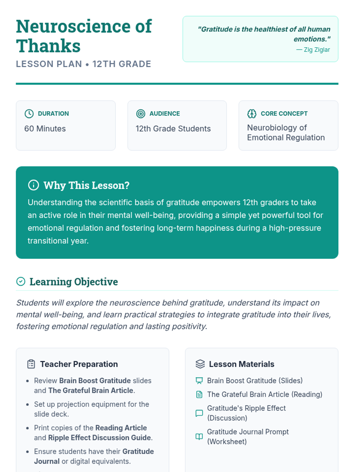 This lesson explores the neuroscience of gratitude, focusing on neuroplasticity and the brain's reward system to help 12th graders understand how intentional practice fosters mental well-being and emotional regulation.