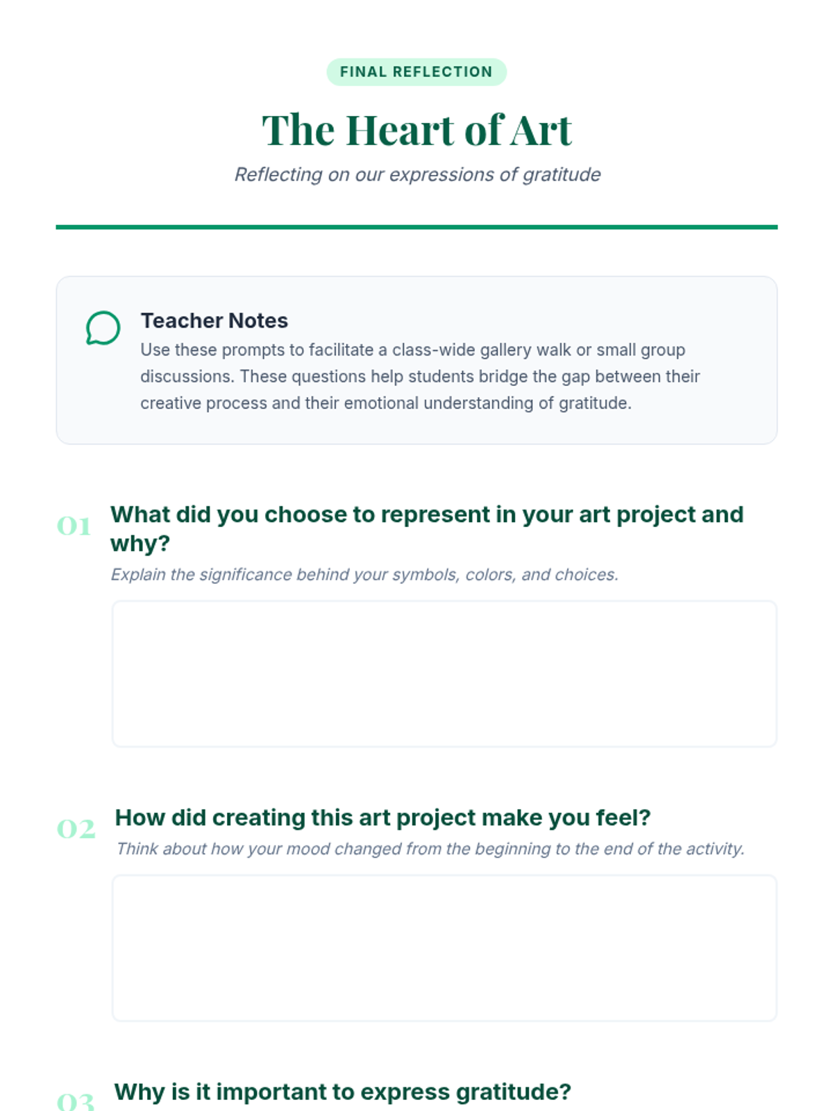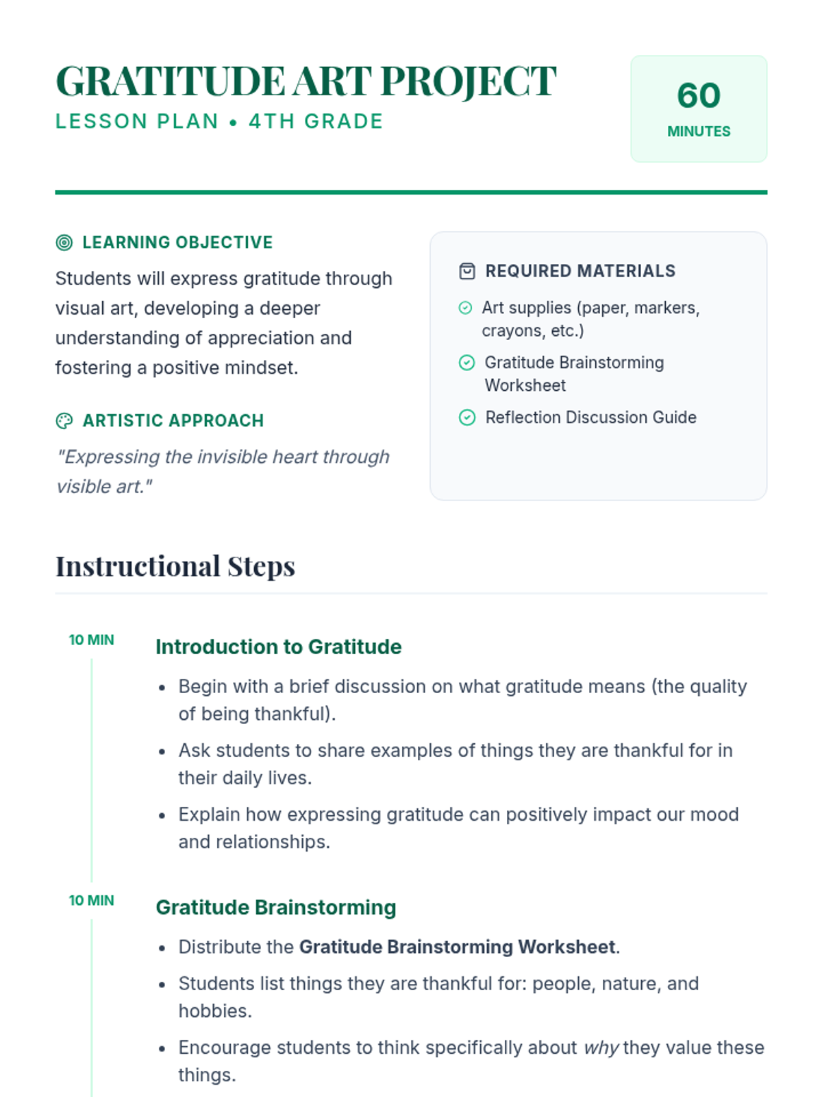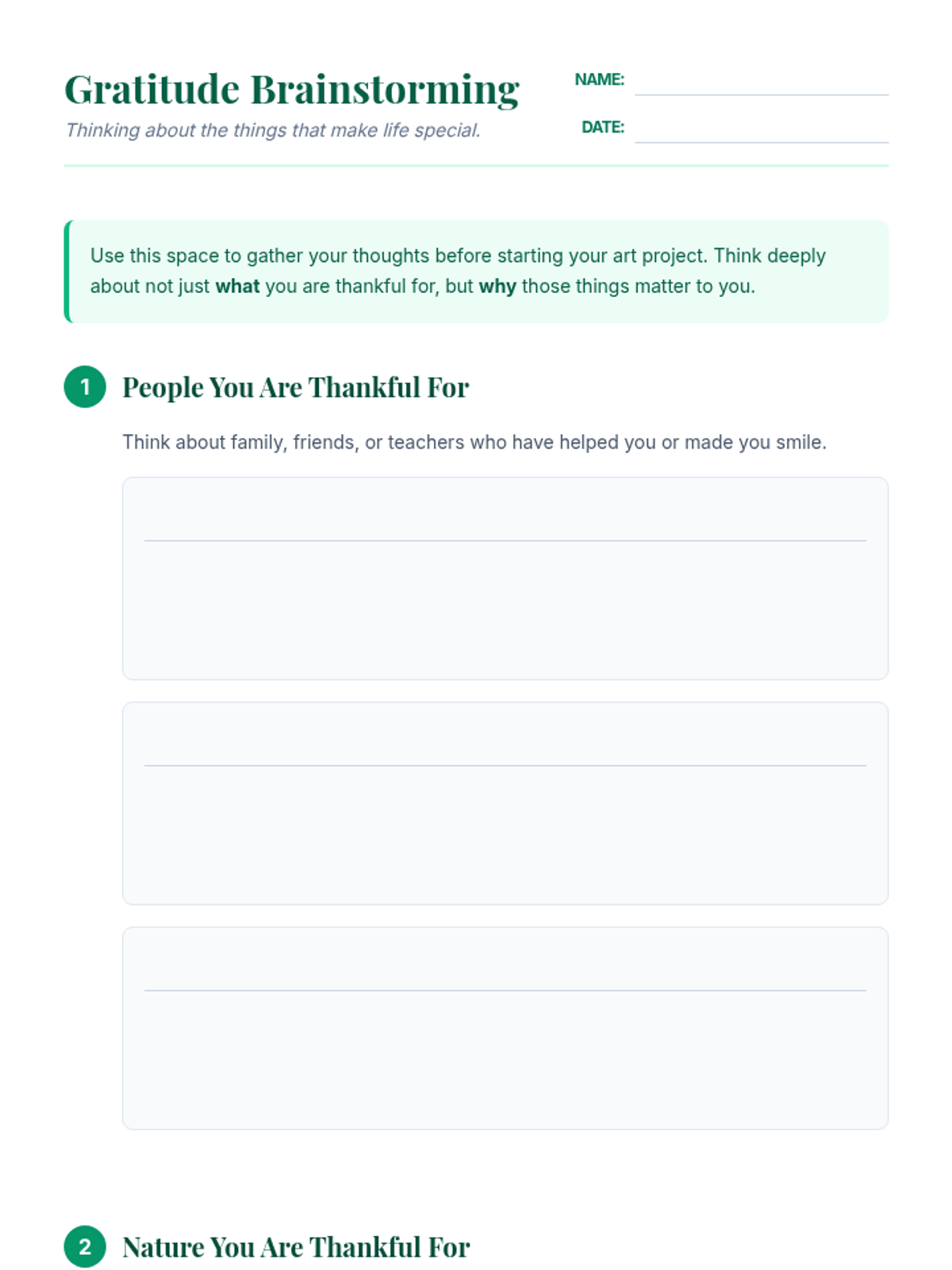 Students will create an art project that represents things they are thankful for, combining creativity with reflection to foster a positive mindset and appreciation for their lives.