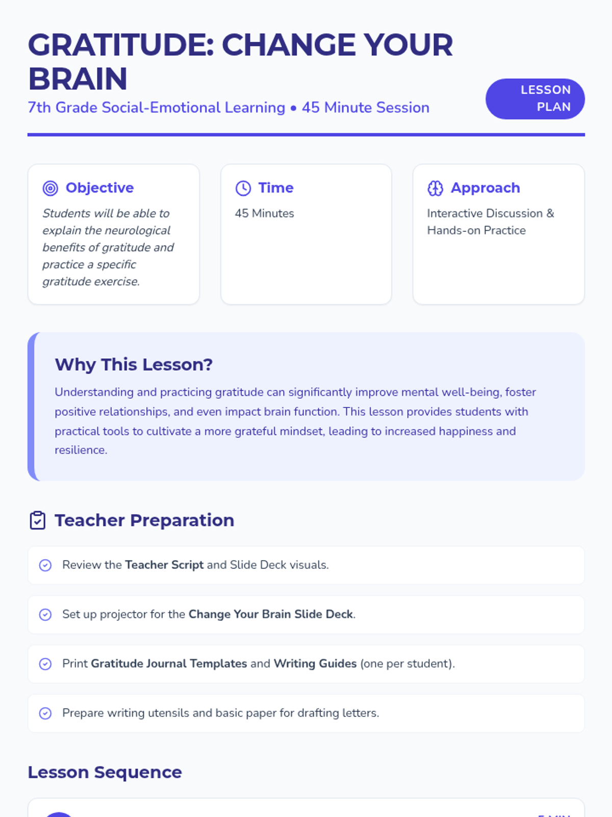 A science-backed lesson for 7th graders on the neurological benefits of gratitude, featuring hands-on journaling and letter-writing activities.
