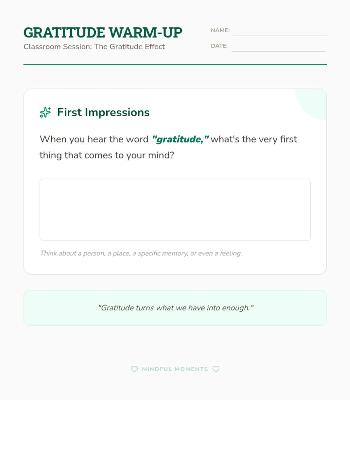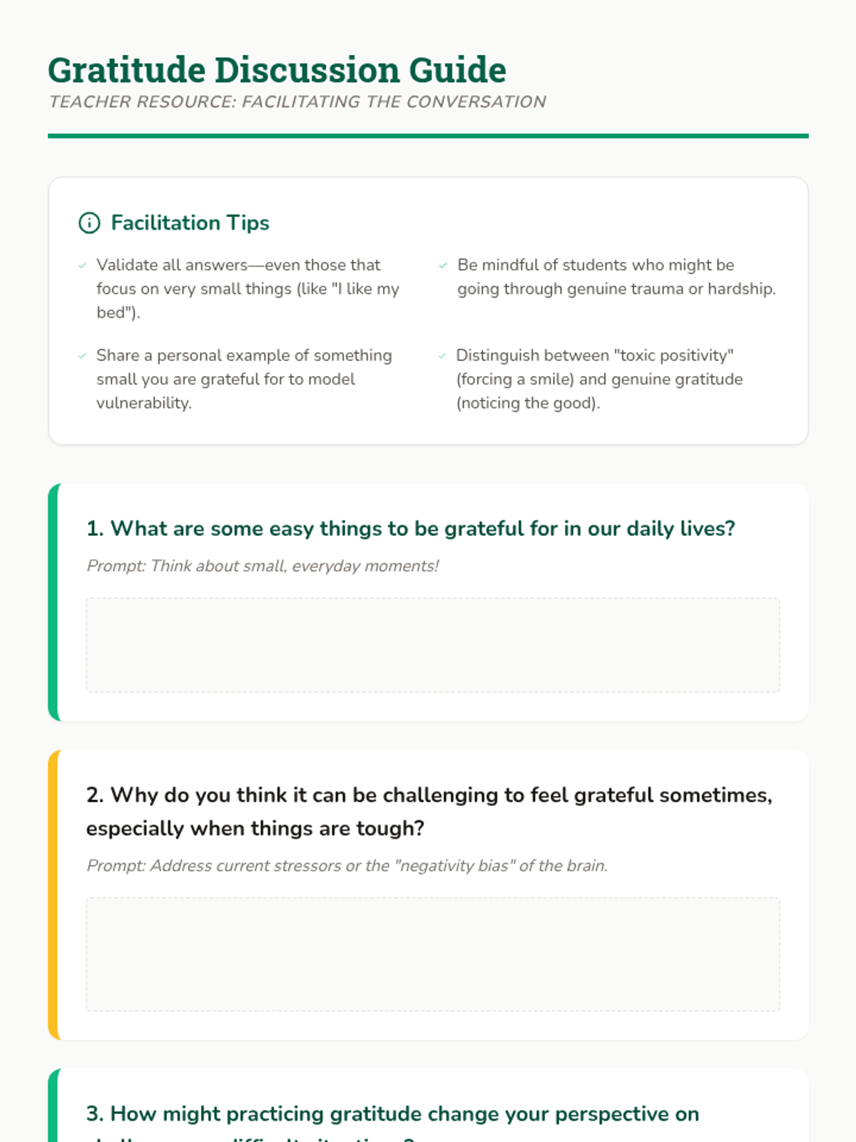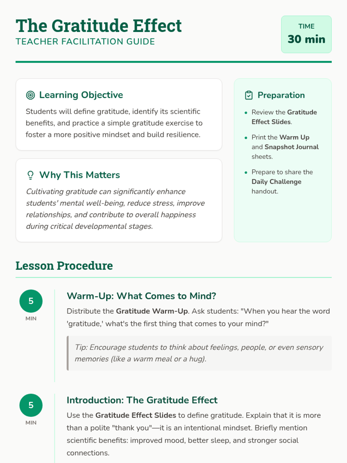 A 30-minute lesson for 9th graders exploring the science and practice of gratitude to improve well-being and resilience.