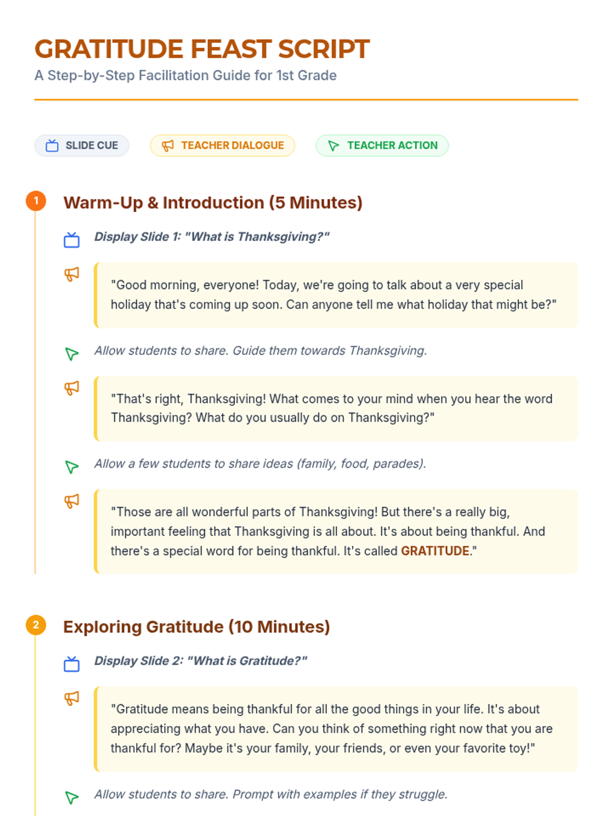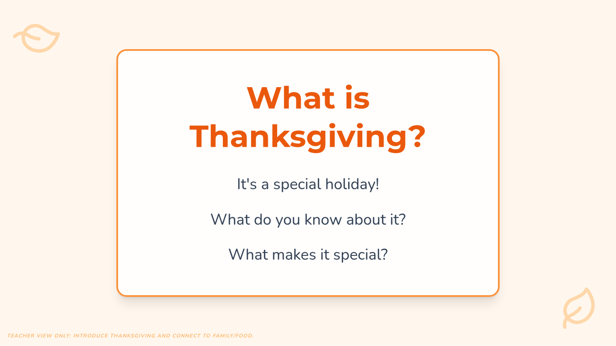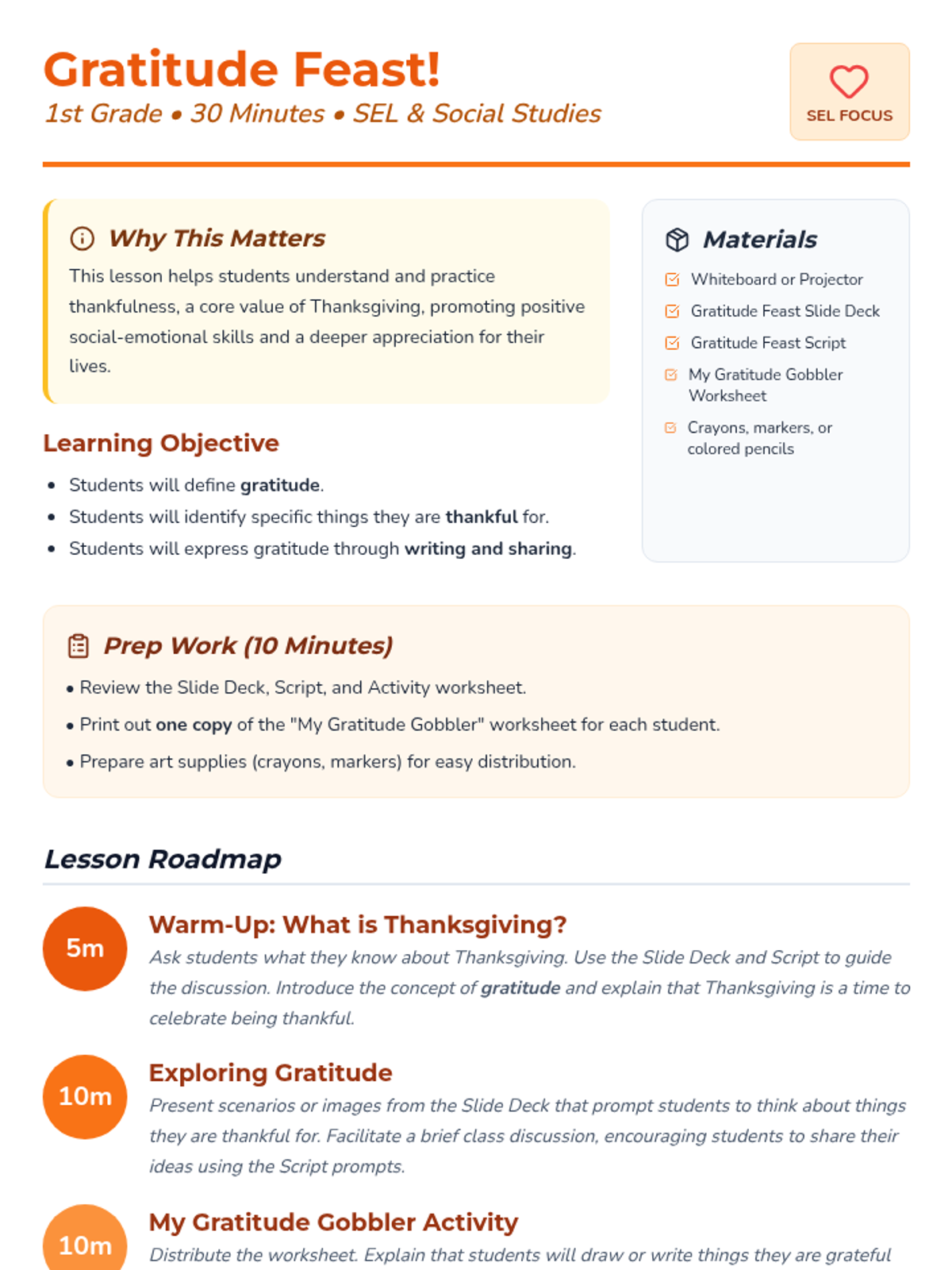 Students will explore the concept of gratitude and practice expressing thankfulness through interactive activities. This lesson helps students understand the spirit of Thanksgiving beyond just historical events, fostering social-emotional learning.